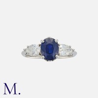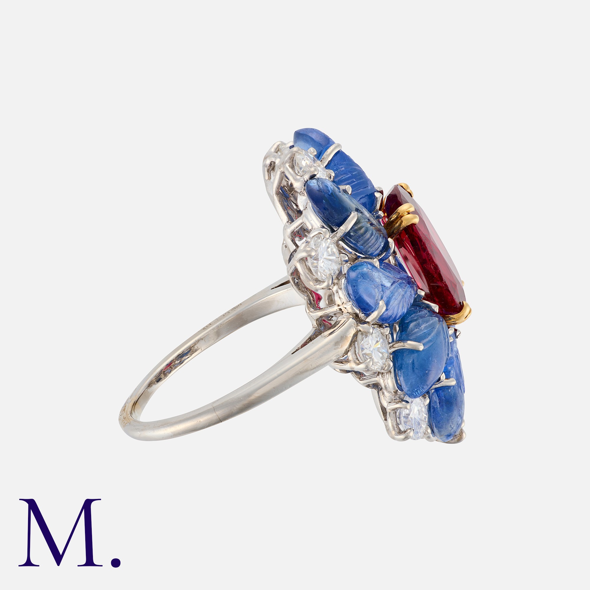 A Burmese Spinel, Sapphire And Diamond Ring in platinum, set with a cushion cut spinel of 3.10ct, within a border of carved sapphires and round cut diamonds. Marked 950. Accompanied by a gemmological report stating the natural spinel is of Burmese origin with no indications of heating.
