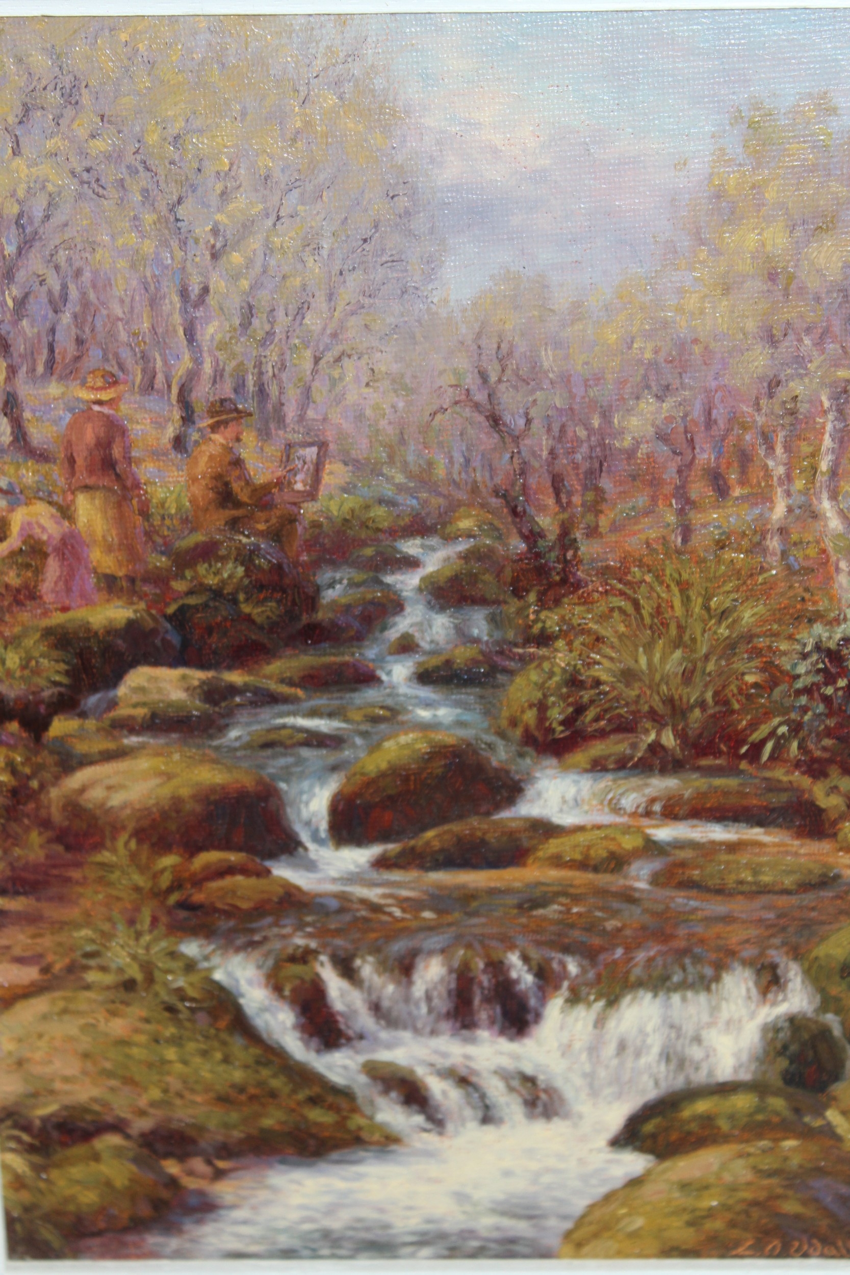 L.O. Udall, oil on canvas board, figures and artist seated by a stream, signed, 24 x 16cm, in a white painted frame
