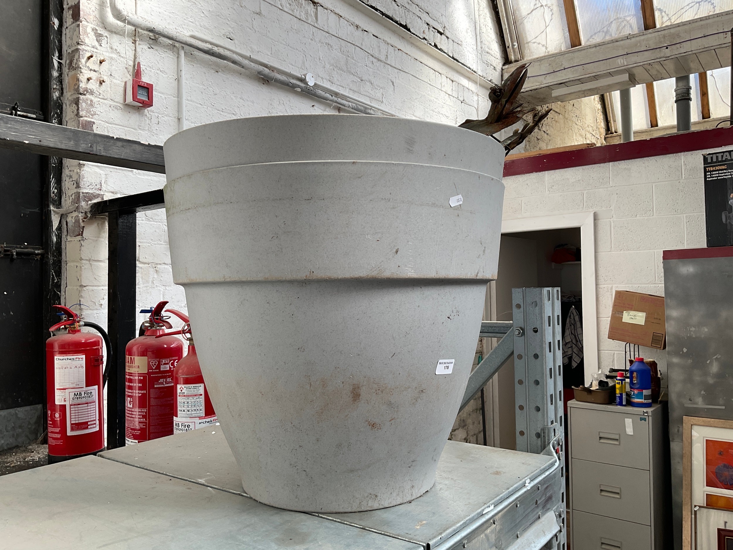 Two large plant pots and garden metal ornament