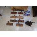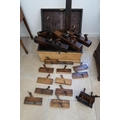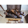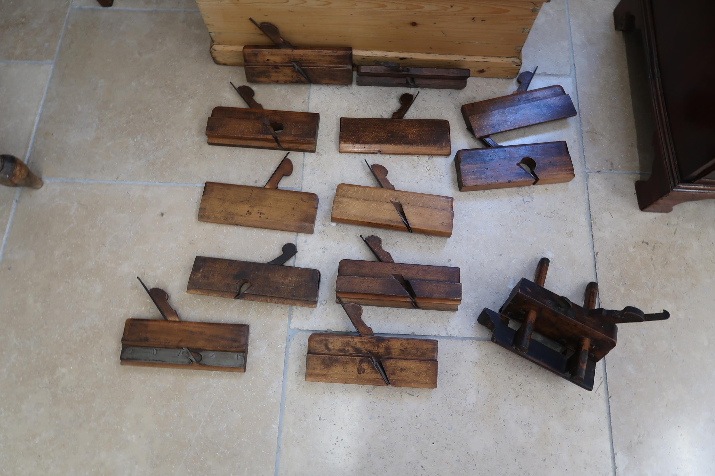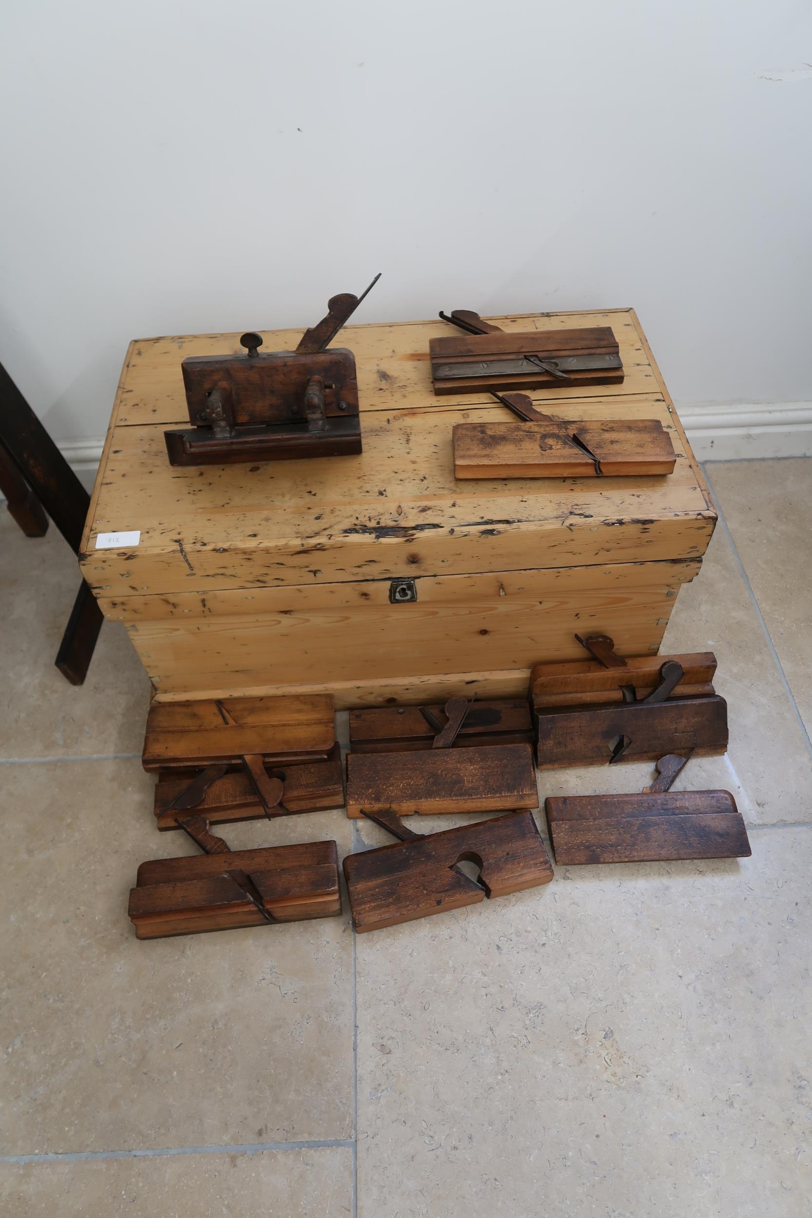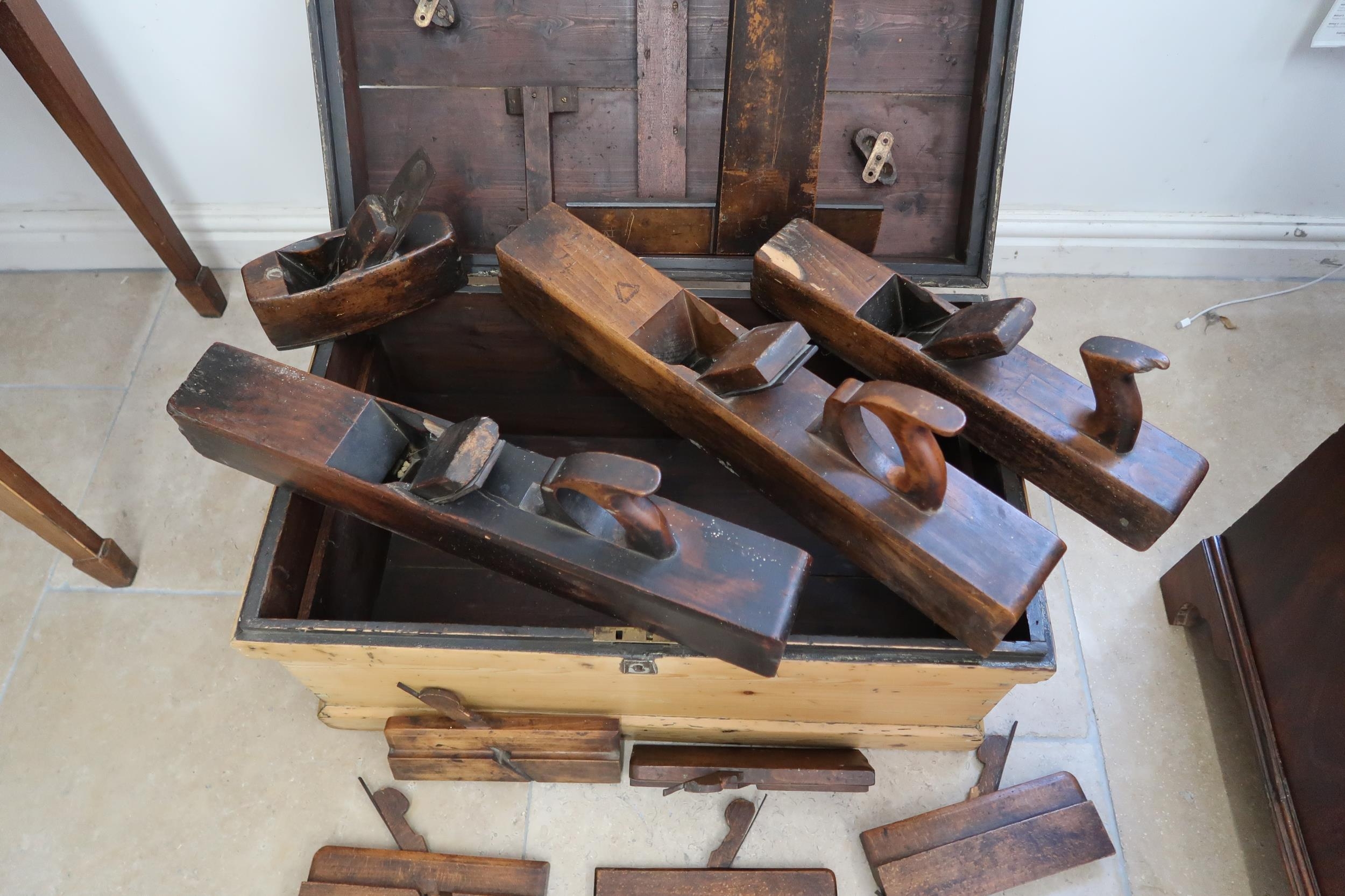 A 19th century pine chest with a collection of early woodworking tools