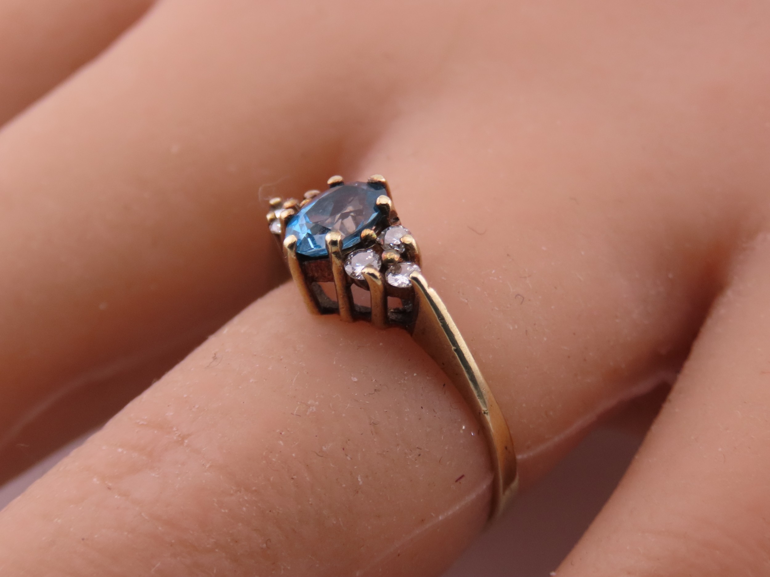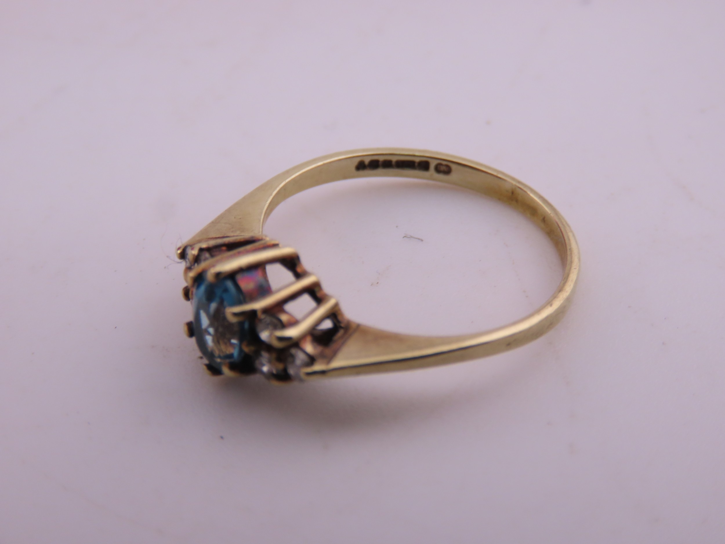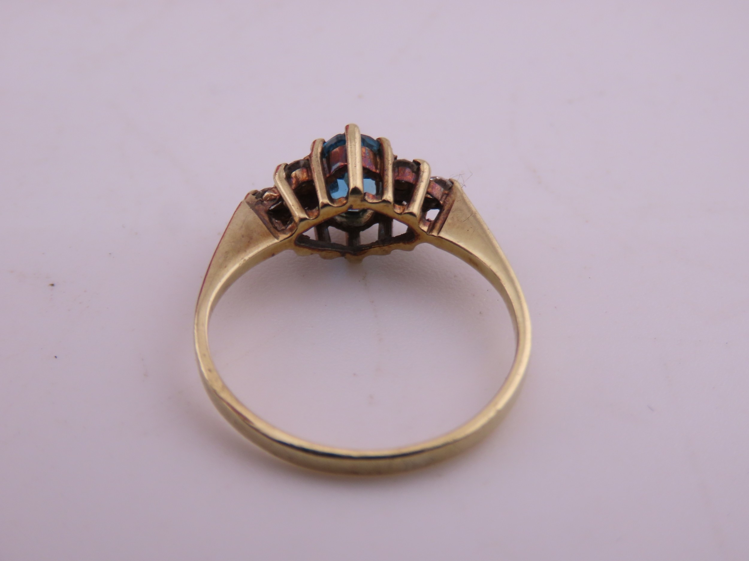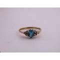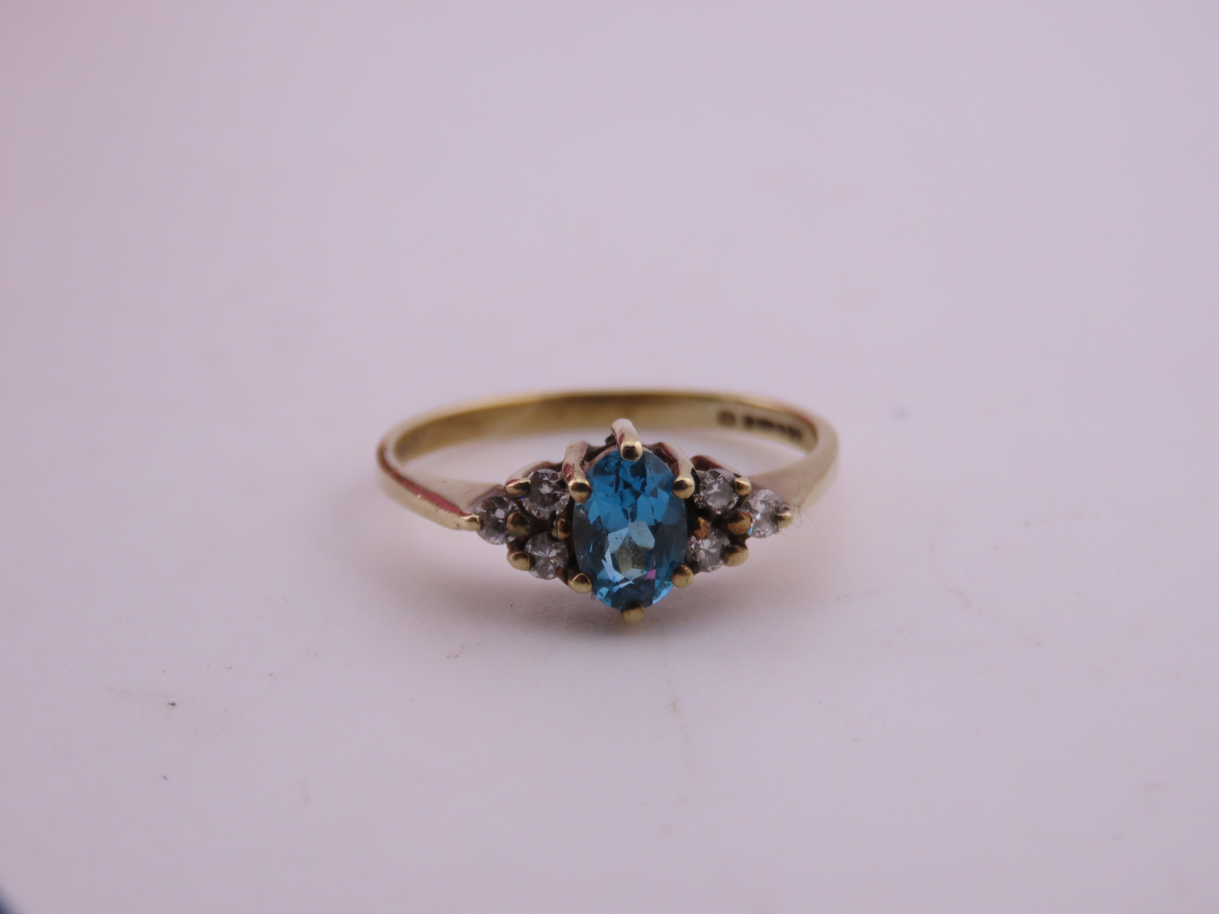 A 9 carat gold topaz and diamond ring set with an oval cut blue topaz flanked by small accent diamonds, mounted in a traditional 9 carat gold setting with tapered shoulders, ring size K, gross weight approximately 1.6 grams.