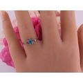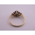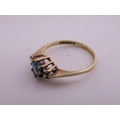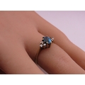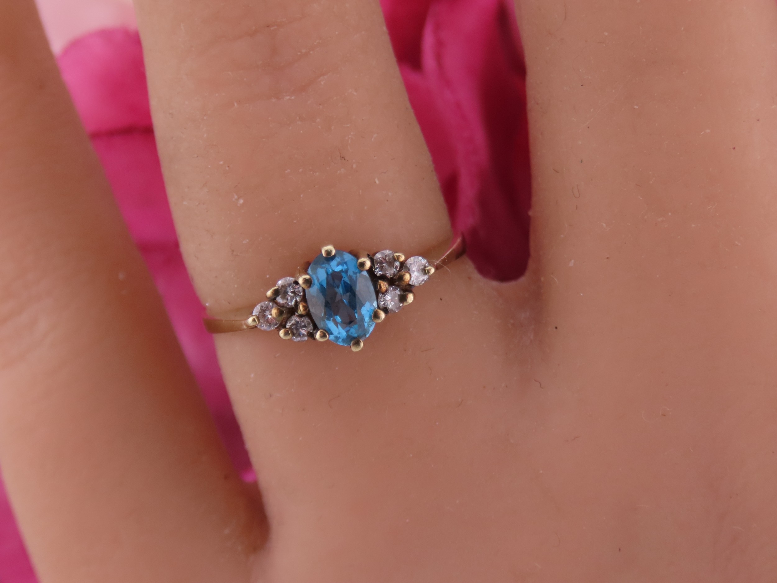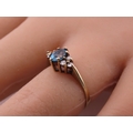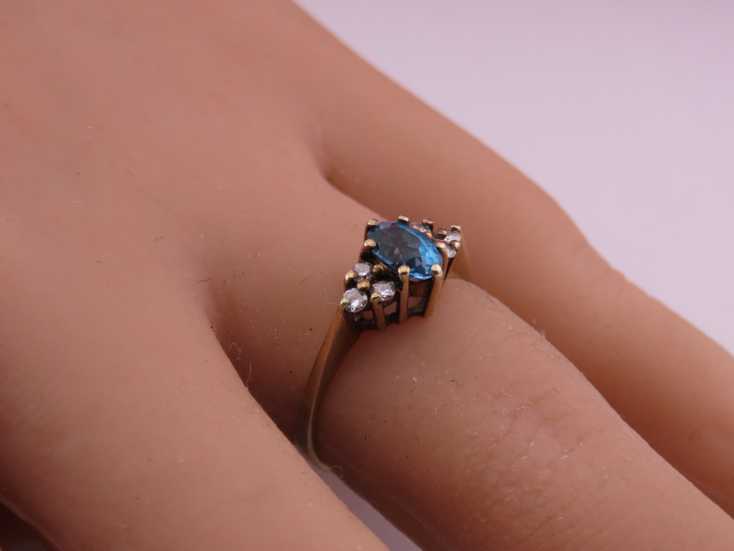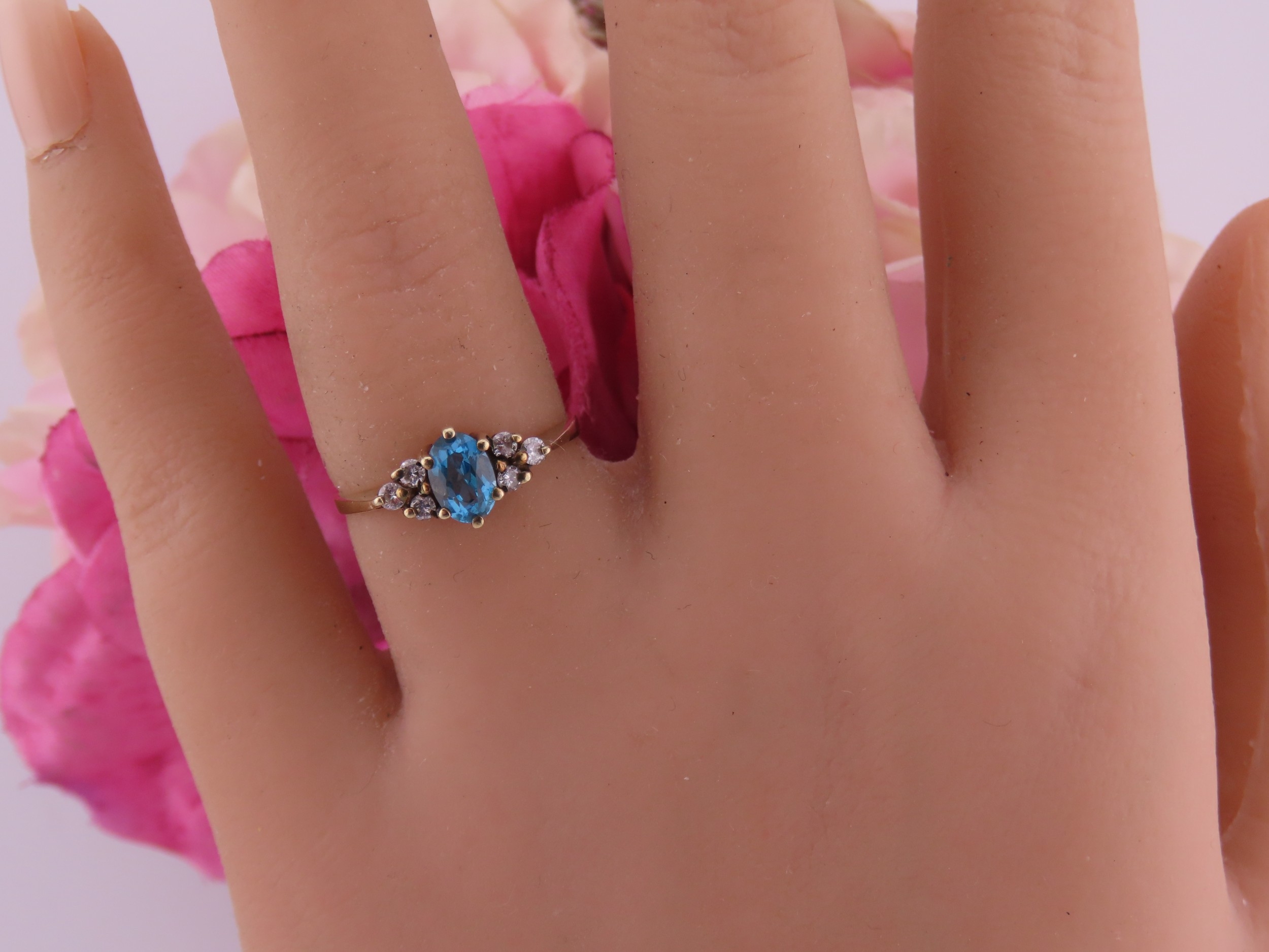 A 9 carat gold topaz and diamond ring set with an oval cut blue topaz flanked by small accent diamonds, mounted in a traditional 9 carat gold setting with tapered shoulders, ring size K, gross weight approximately 1.6 grams.