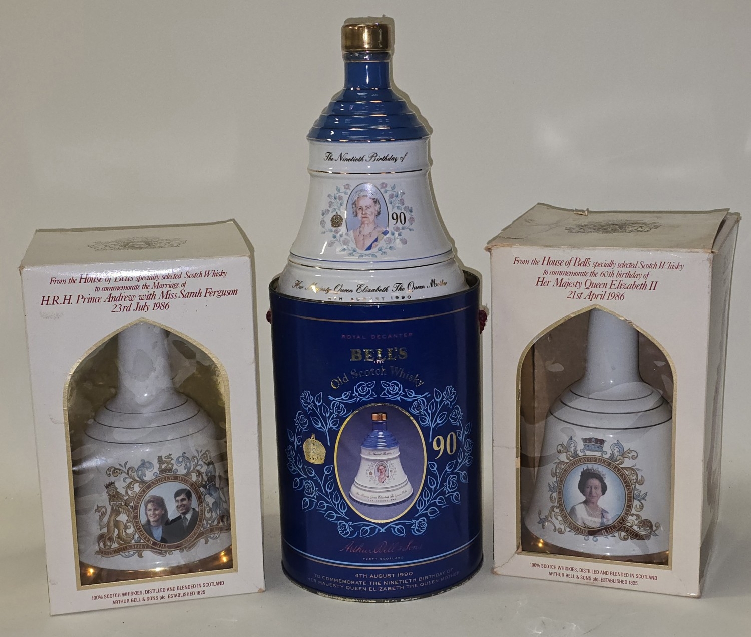 Bell's Whisky commemorative decanters to include Queen Mother 90th Birthday 1990, Queen Elizabeth II 60th Birthday 1986 and Wedding of Prince Andrew and Sarah Ferguson 1986. All bottles still sealed.