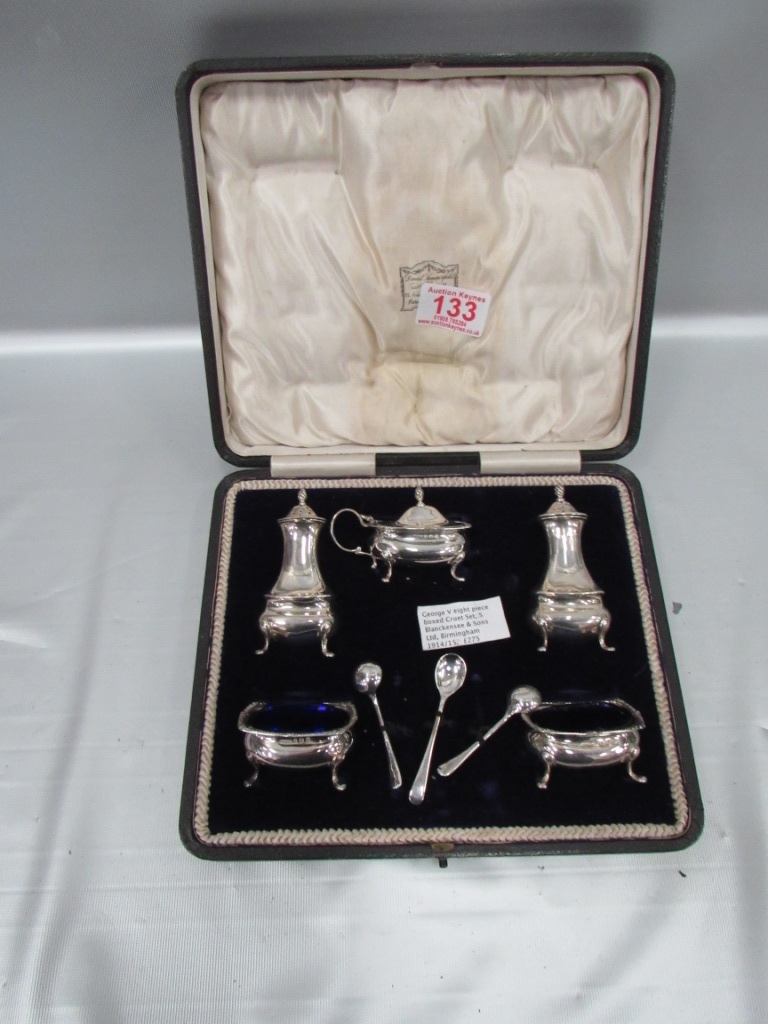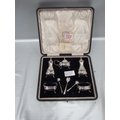 H/M silver George V eight piece cruet set. Liners in tact, no significant damage.