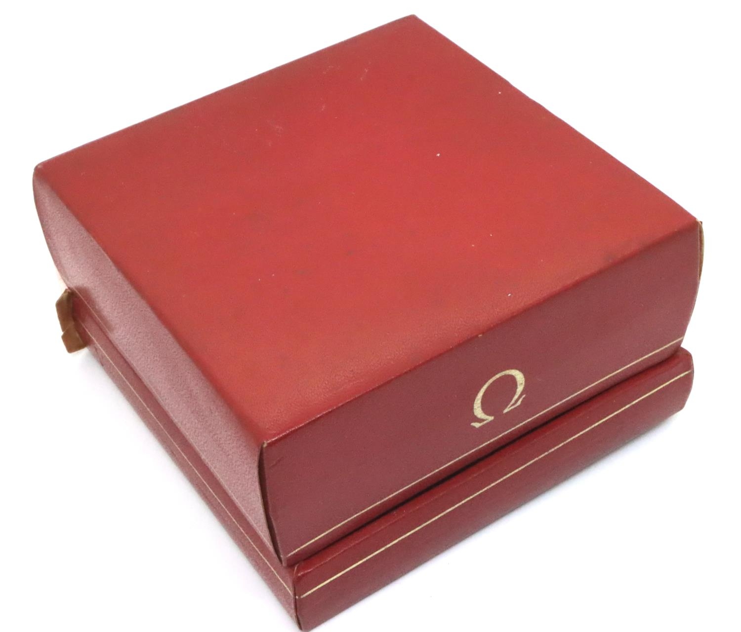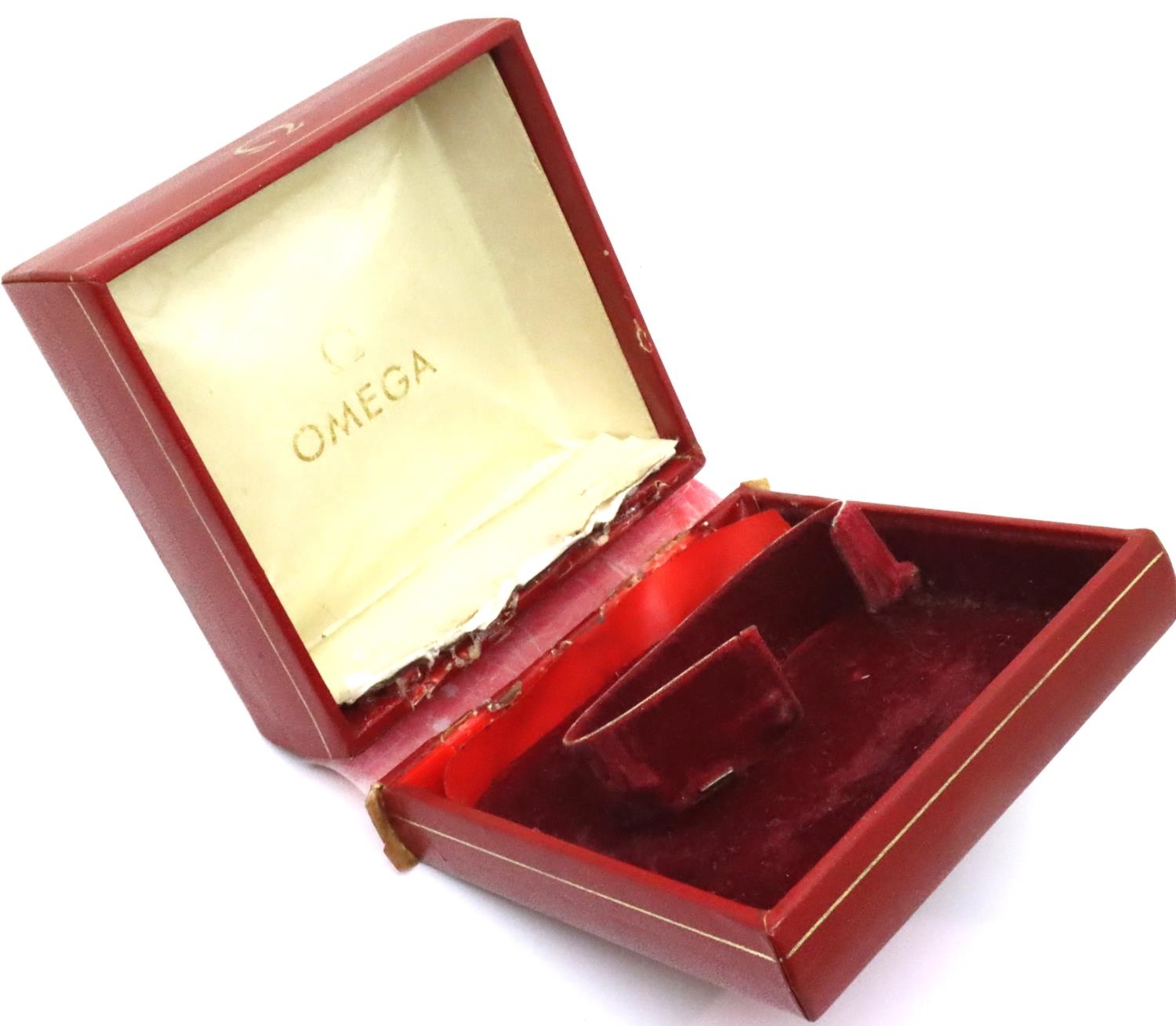 Omega watch box circa 1970s (at fault). P&P Group 1 (£14+VAT for the first lot and £1+VAT for subsequent lots)