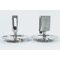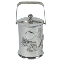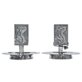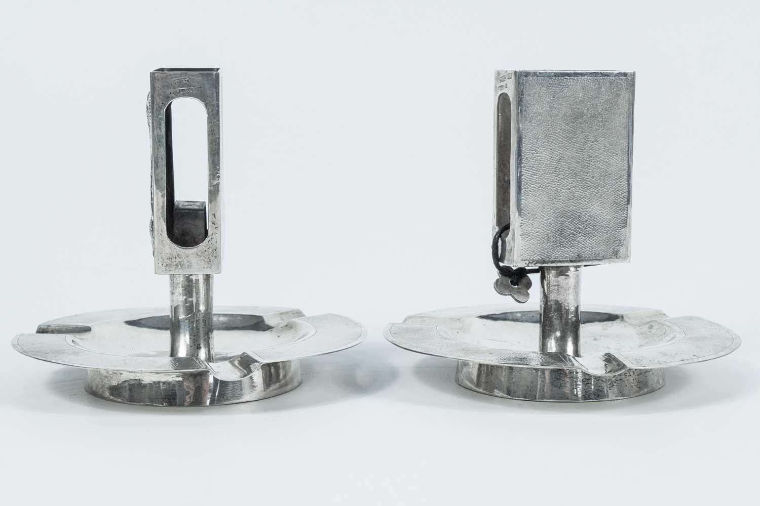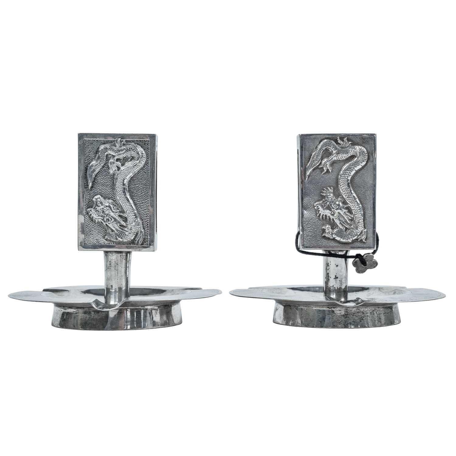 A pair of Chinese silver smokers stands, circa 1900, stamped 'C.J. Co, Sterling'. Each with a dragon decorated matchbox holder on a circular ashtray with three cigarette holders, height 10.5cm, diameter 11.5cm, weight 144 and 162 grams. (2) 'C.J.Co' were the China Jewellery Company who were active in Shanghai between 1875 and 1920.