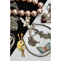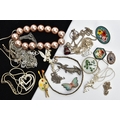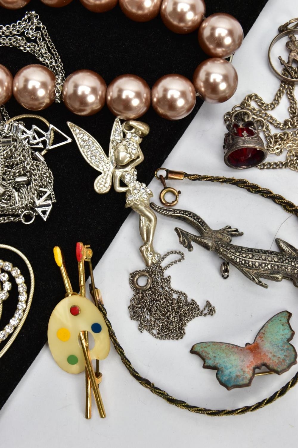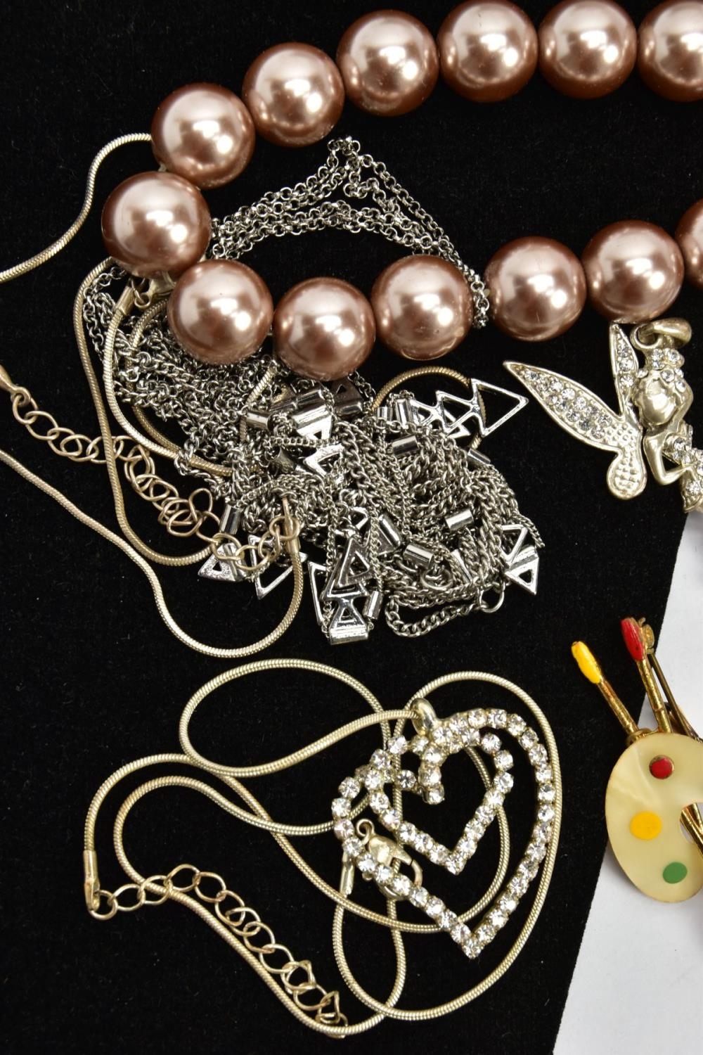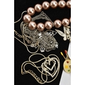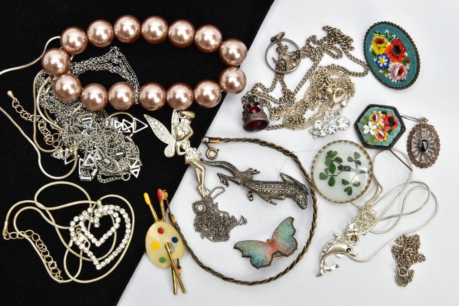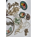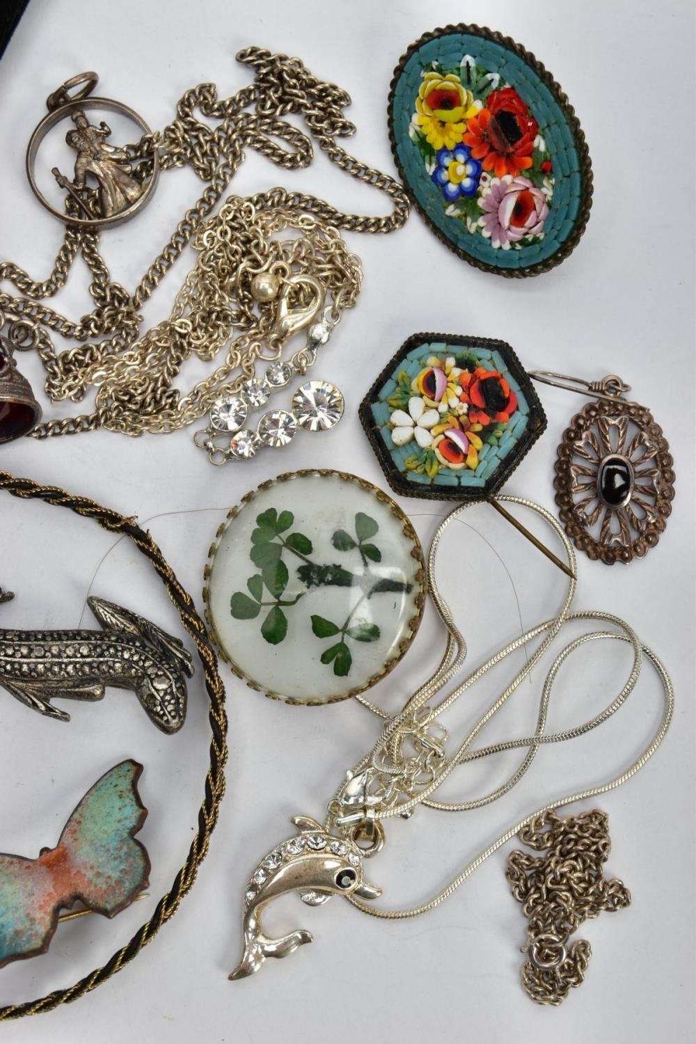 AN ASSORTMENT OF WHITE METAL AND COSTUME JEWELLERY, to include two micro mosaic brooches, a selection of white metal chains and jewellery, a pearl simulant stretch bracelet