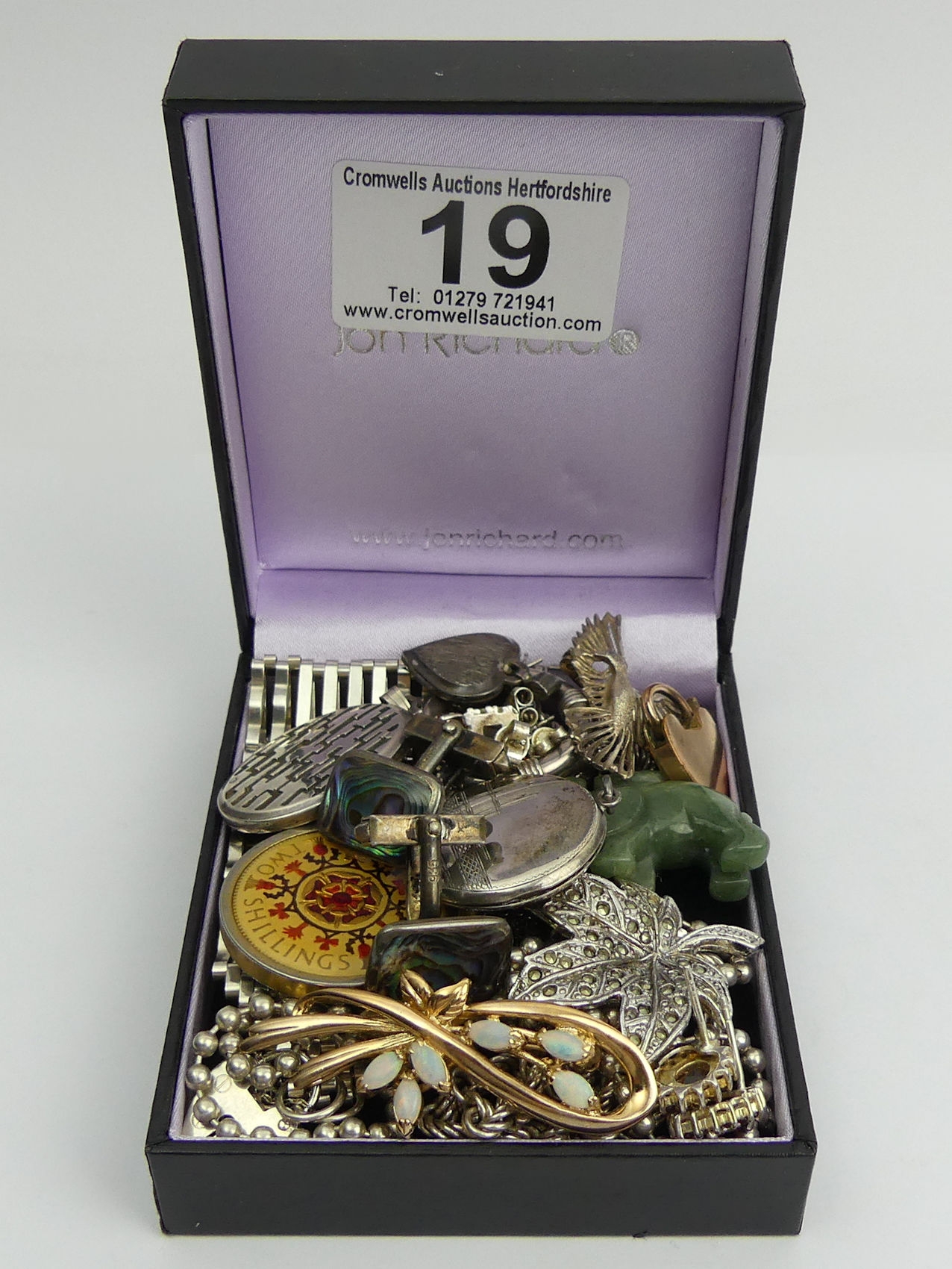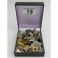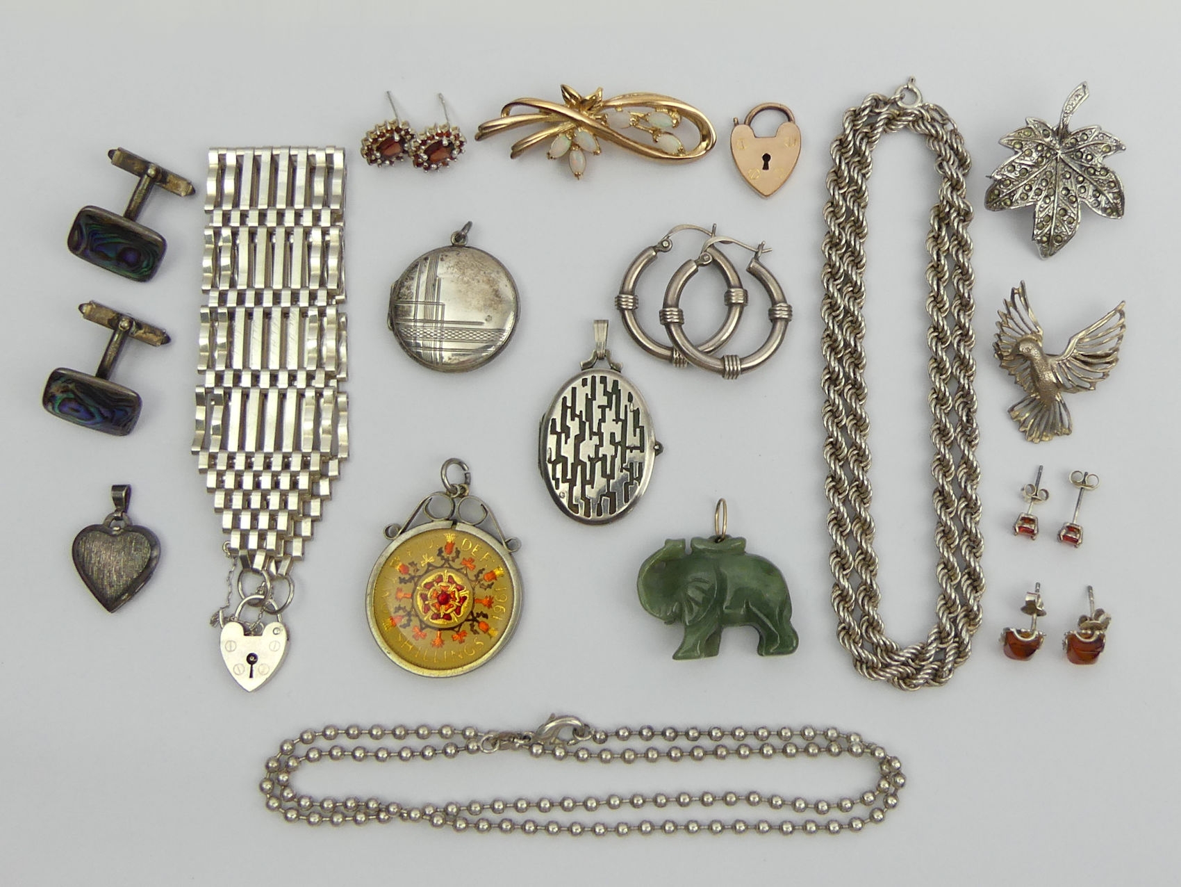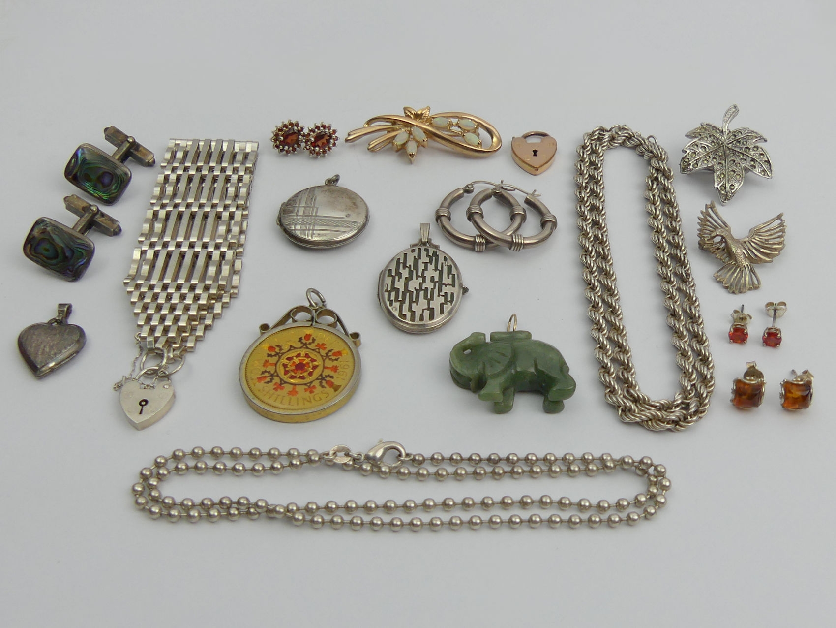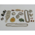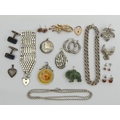 A box of mostly silver jewellery including earrings, brooches and an 8 bar silver gate bracelet, 145 grams gross. UK Postage £12.