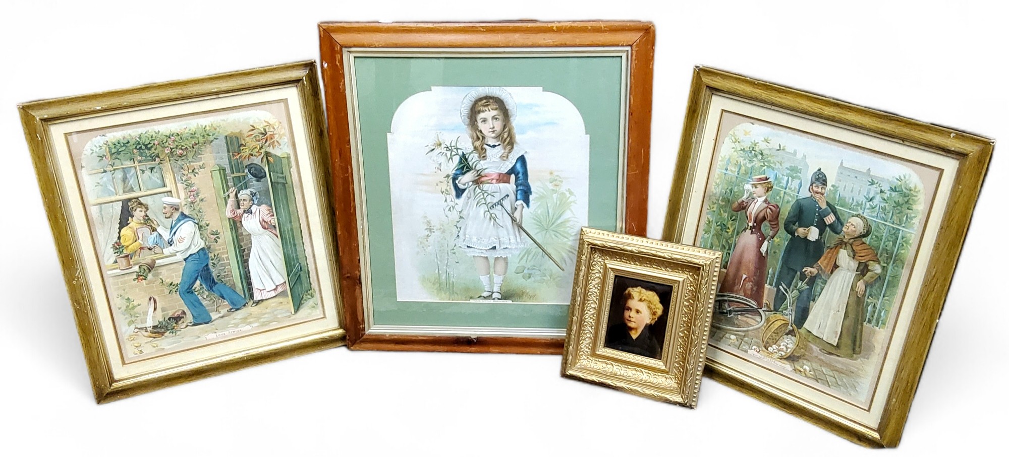 Pictures & Prints - a late Victorian chrystoleum portrait of a young girl, bold gilt frame; Three Edwardian advertisement posters / plates titled Our Little Gardener, "Trouble, What About These Yere Heggs" and 'Love-Struck'; The Chatsworth Estate - W. Marshall (20th Century) Edensor Village, Hunting Tower, White Lodge, Golden Gates and Chatsworth House, dated 1995, watercolours, framed