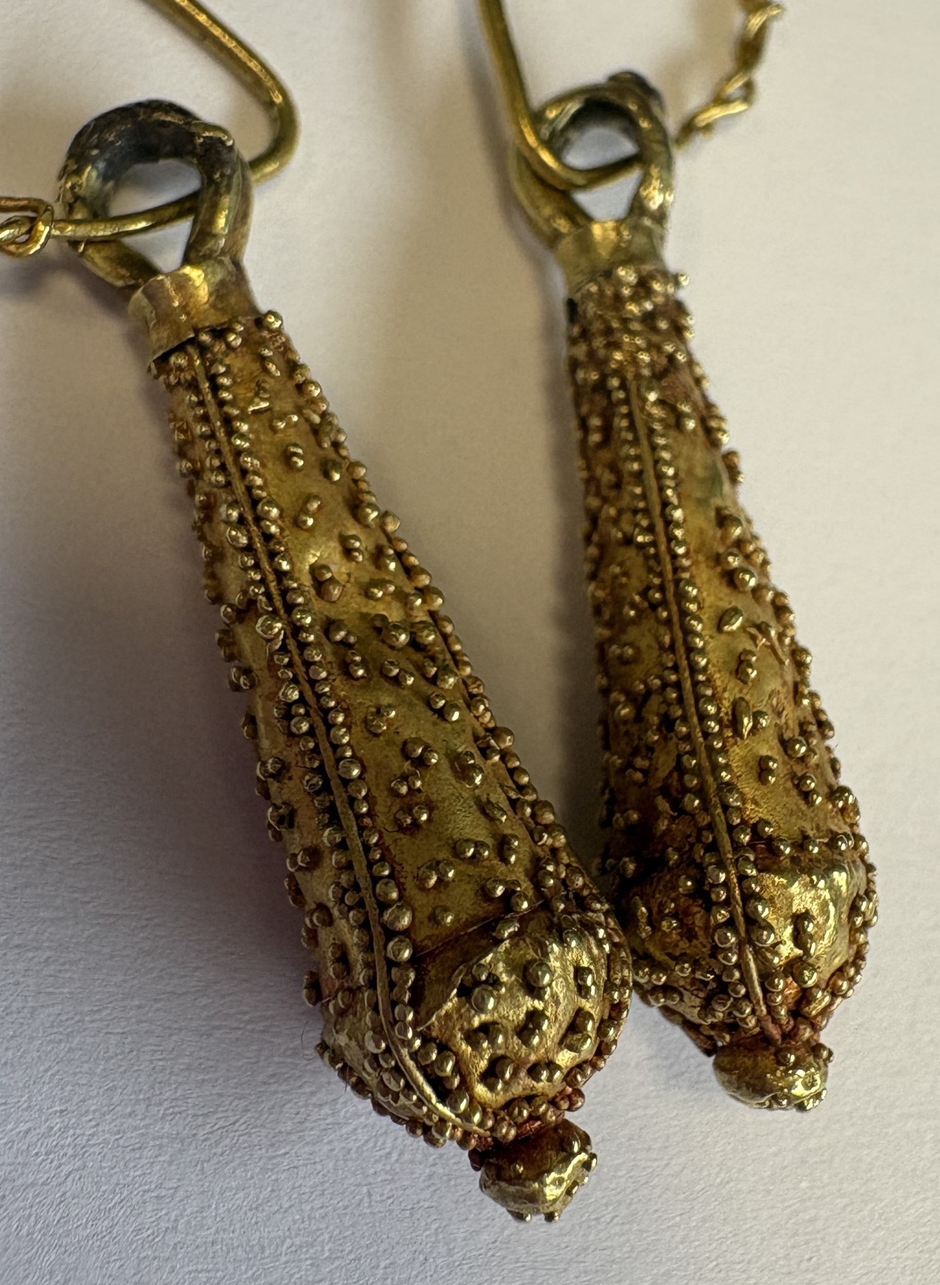 A good pair of Georgian gold tapering earrings with ball decoration. Approx. 4 grams. Est. £200 - £300.