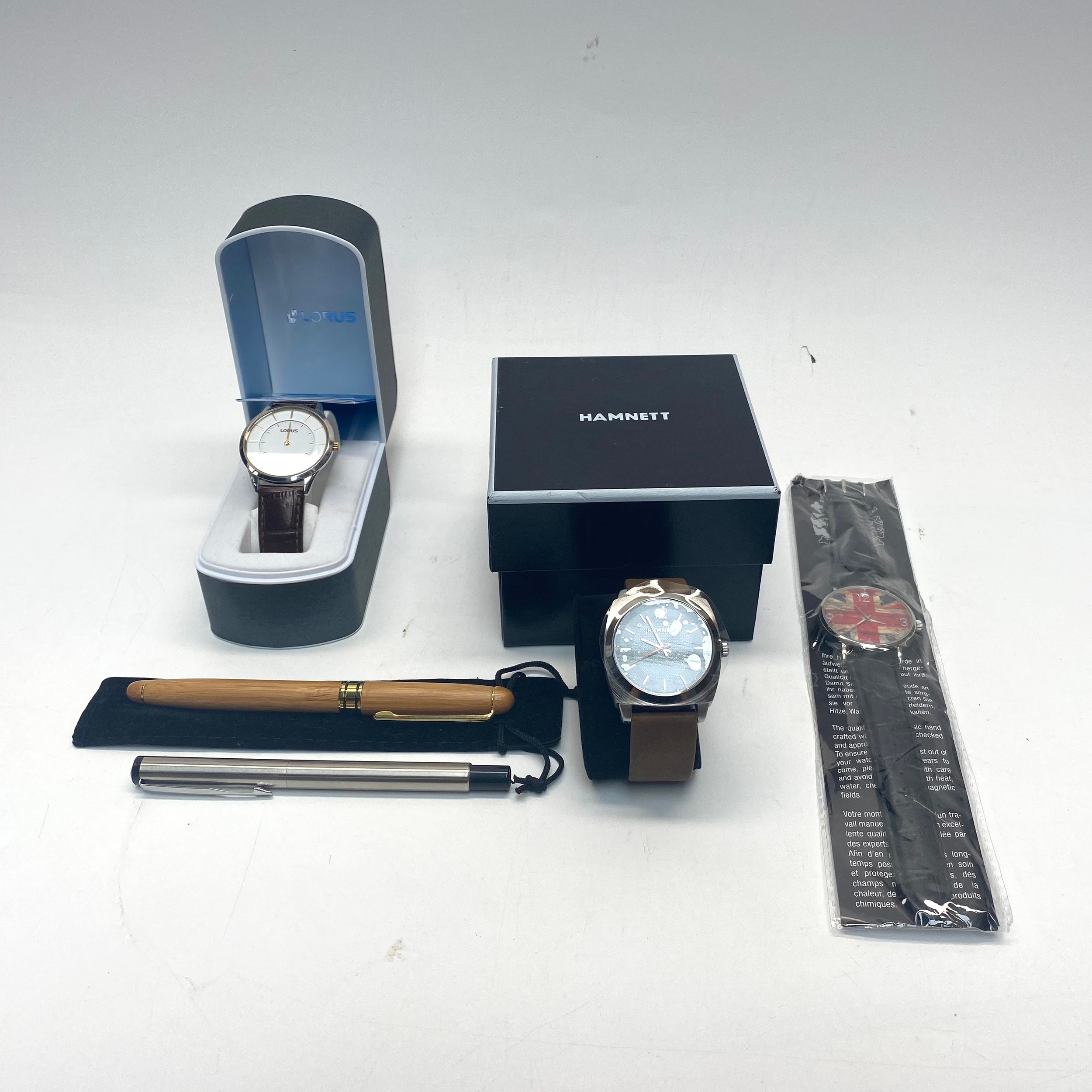 Lorus Ultra slim white dial watch RTA 39AX9 watch, Union Jack watch, Hamnett watch (needs batteries). parker pen and hand made wooden pen.