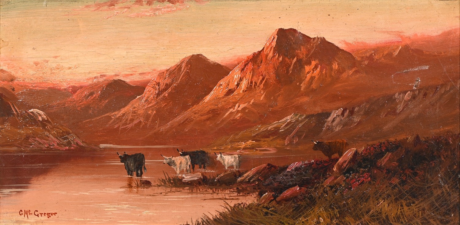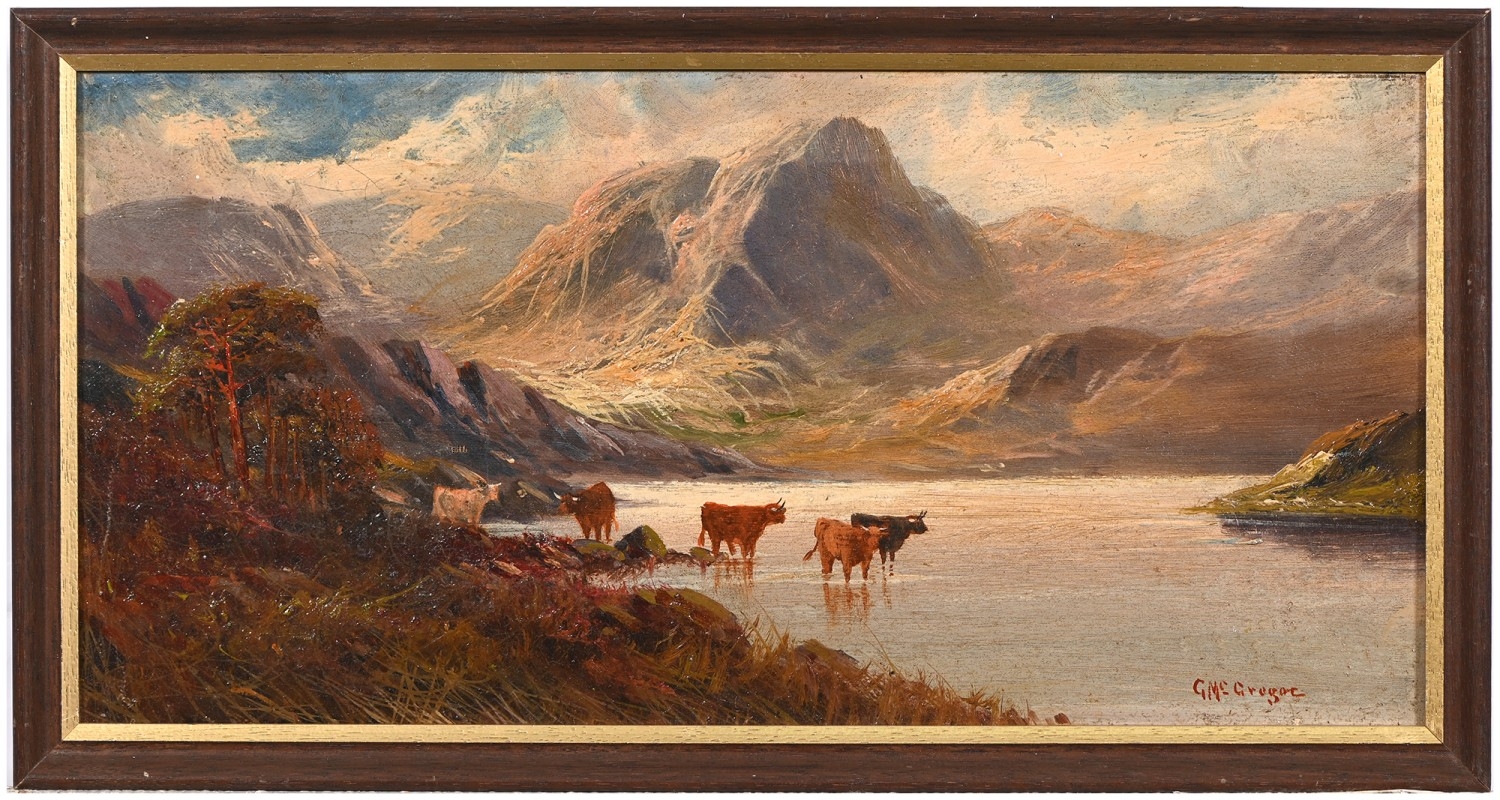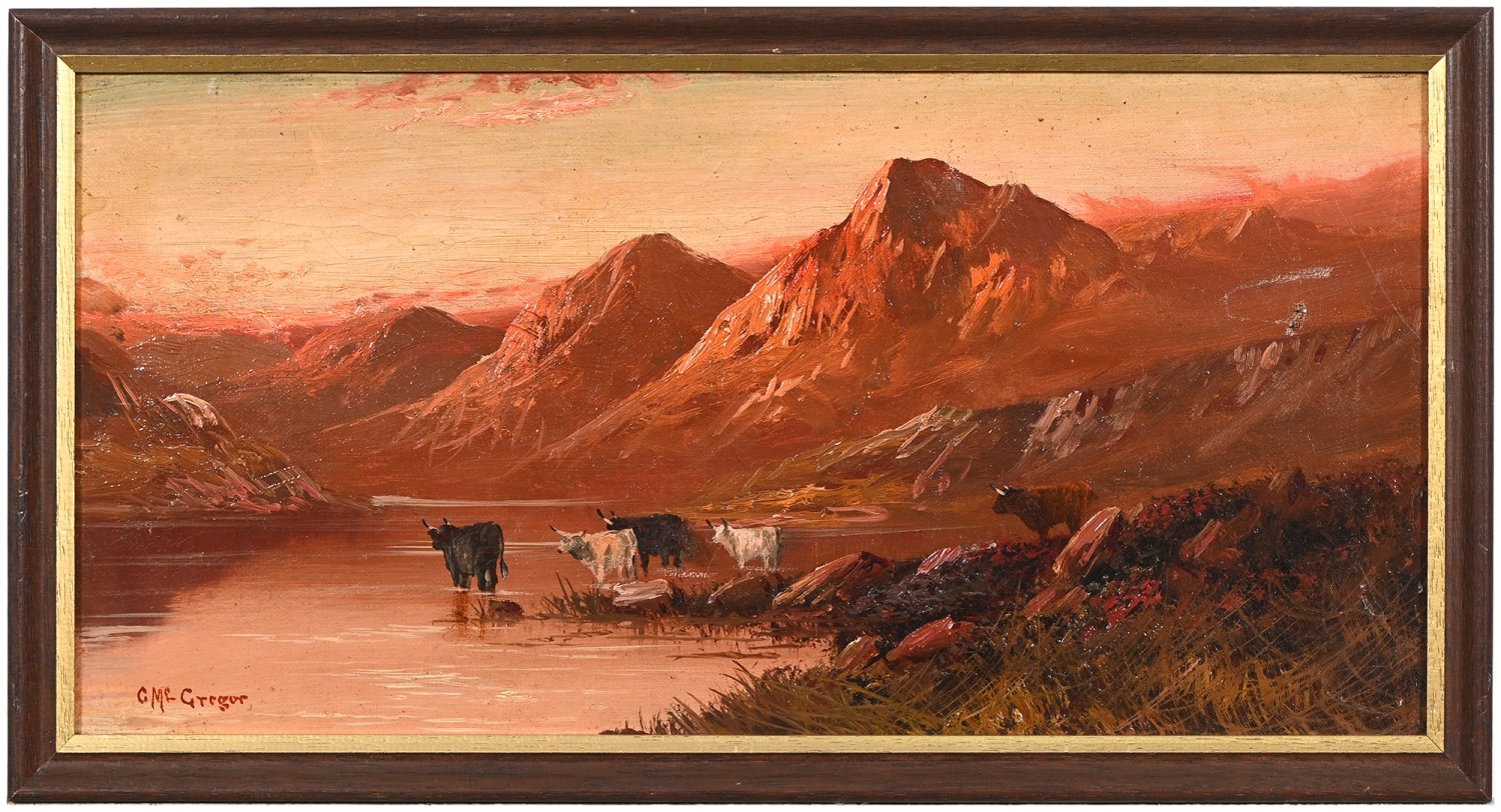 G. McGregor, late 19th/early 20th century - Cattle Watering by Daylight; Cattle Watering by Sunset, a pair, signed, oil on canvas, 21.5 x 41cm; another Scottish landscape, indistinctly signed, oil on board, 20 x 14cm, (3)