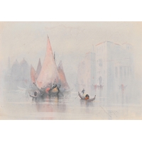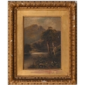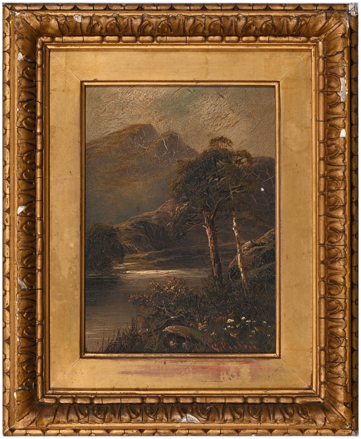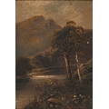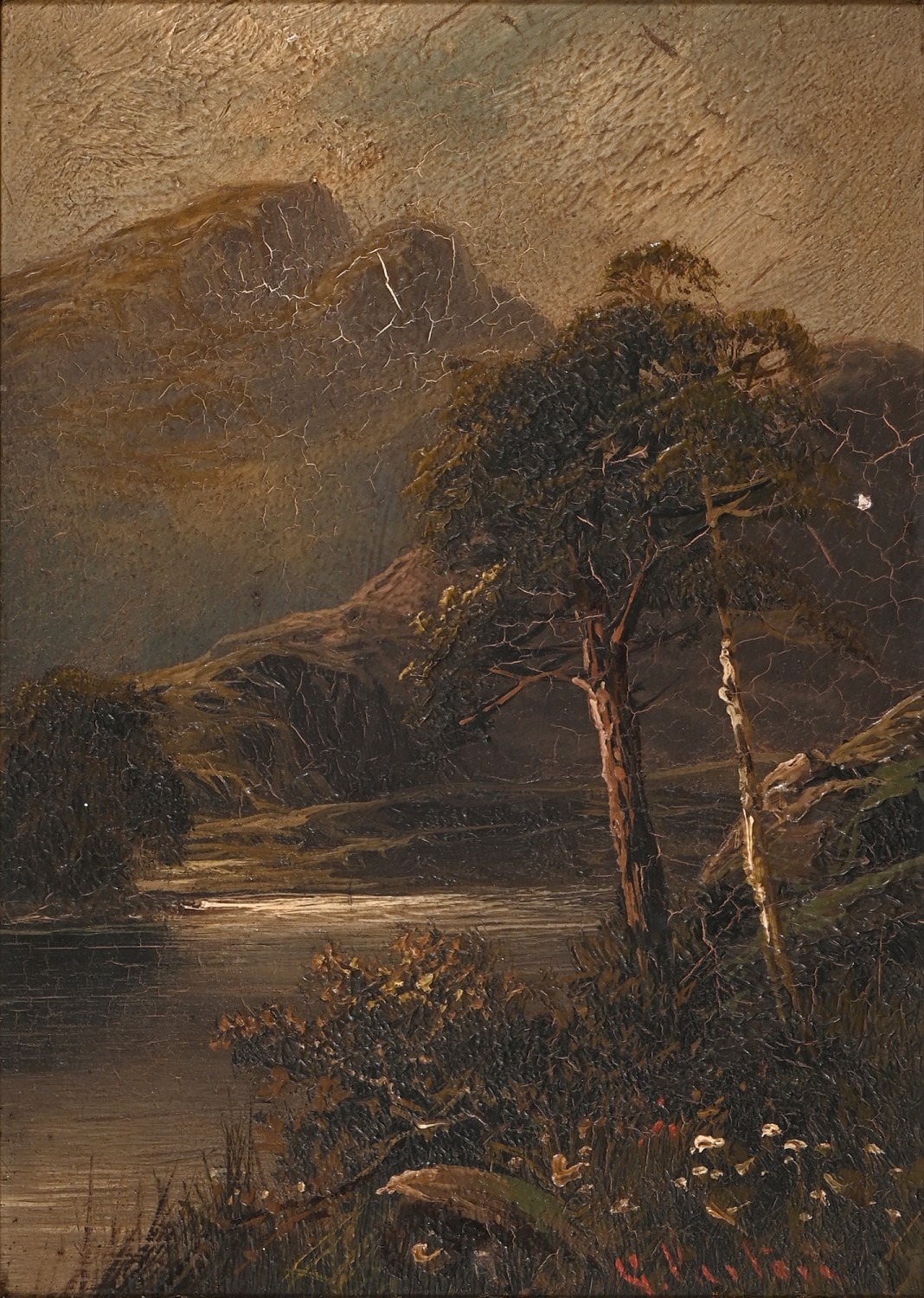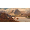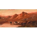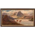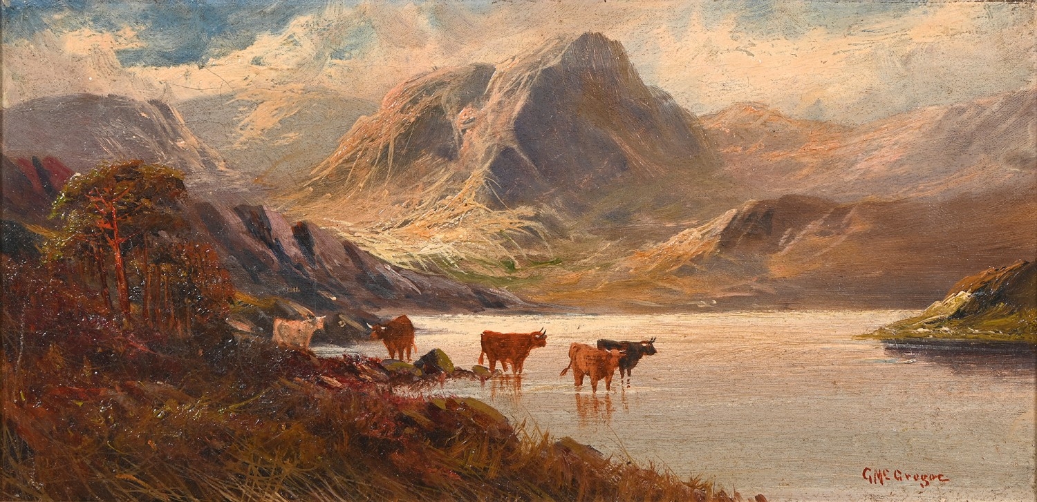 G. McGregor, late 19th/early 20th century - Cattle Watering by Daylight; Cattle Watering by Sunset, a pair, signed, oil on canvas, 21.5 x 41cm; another Scottish landscape, indistinctly signed, oil on board, 20 x 14cm, (3)