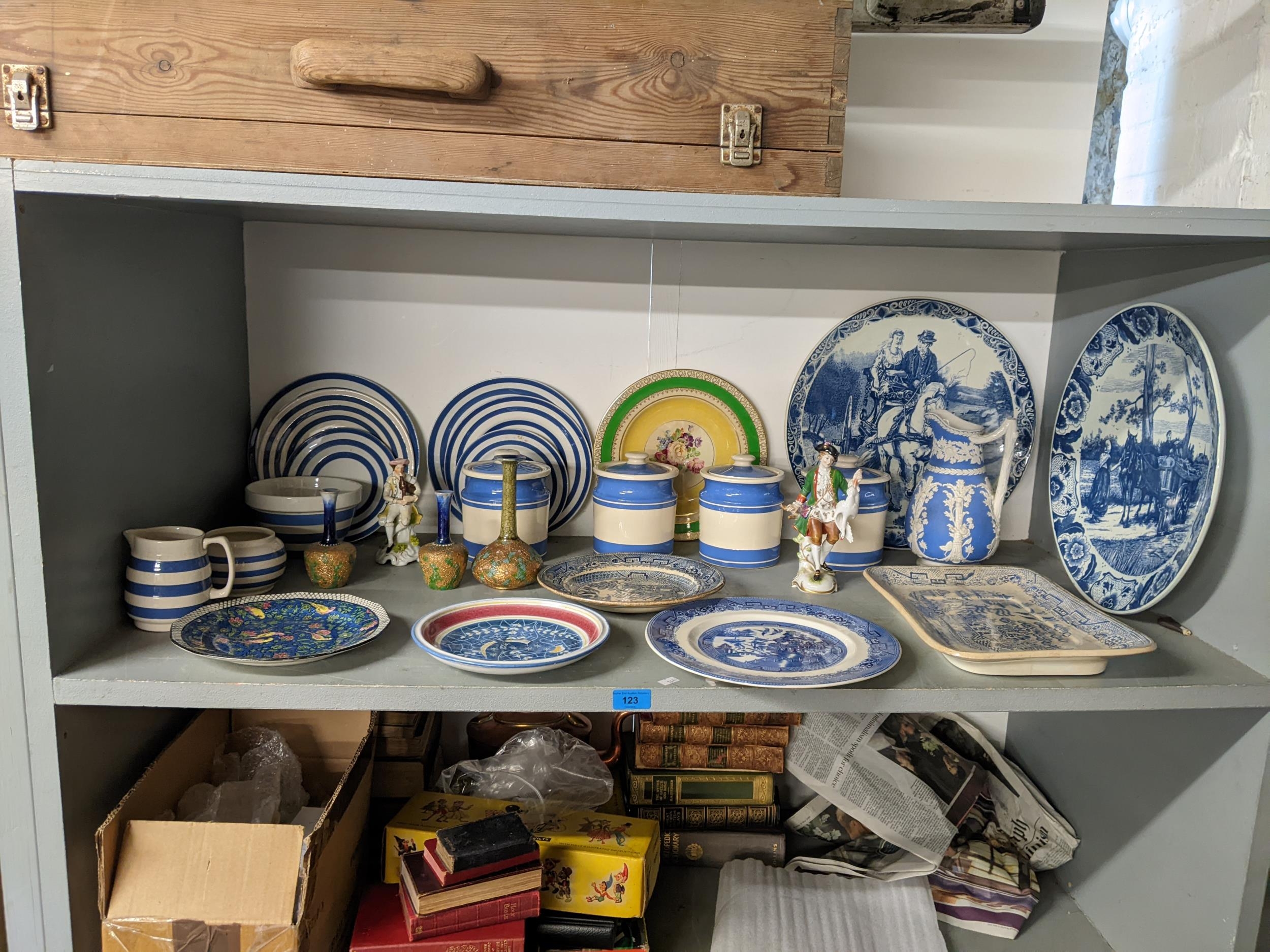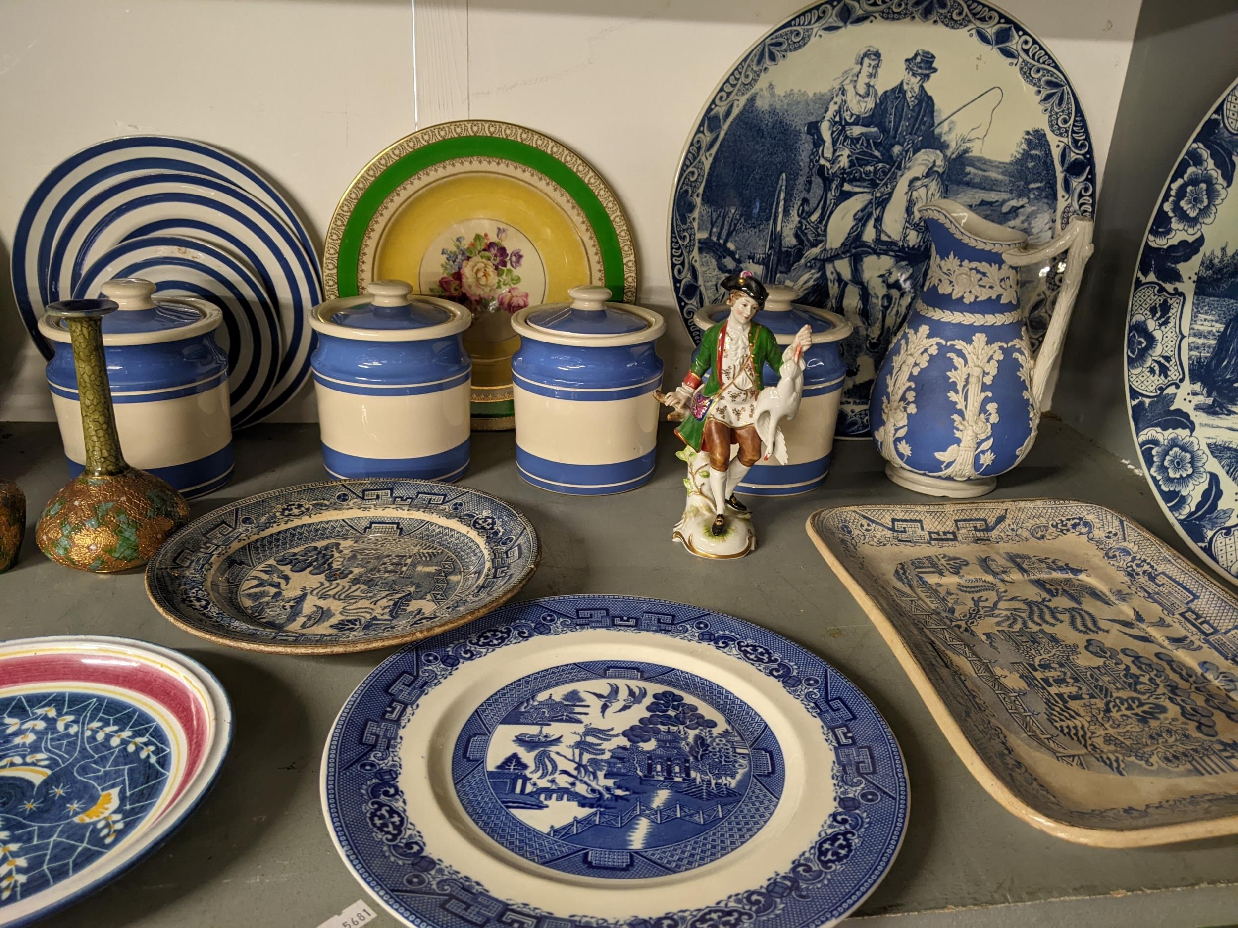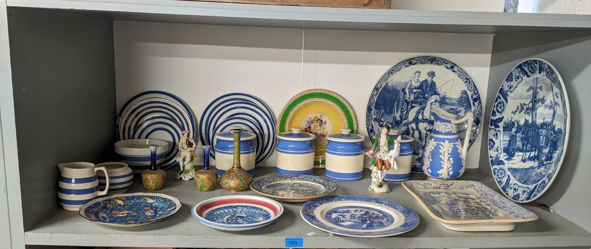 Ceramics to include T G Green storage jars with black backstamps, Doulton Slaters patent vases, Cornish Ware pottery decorative plates and other items