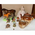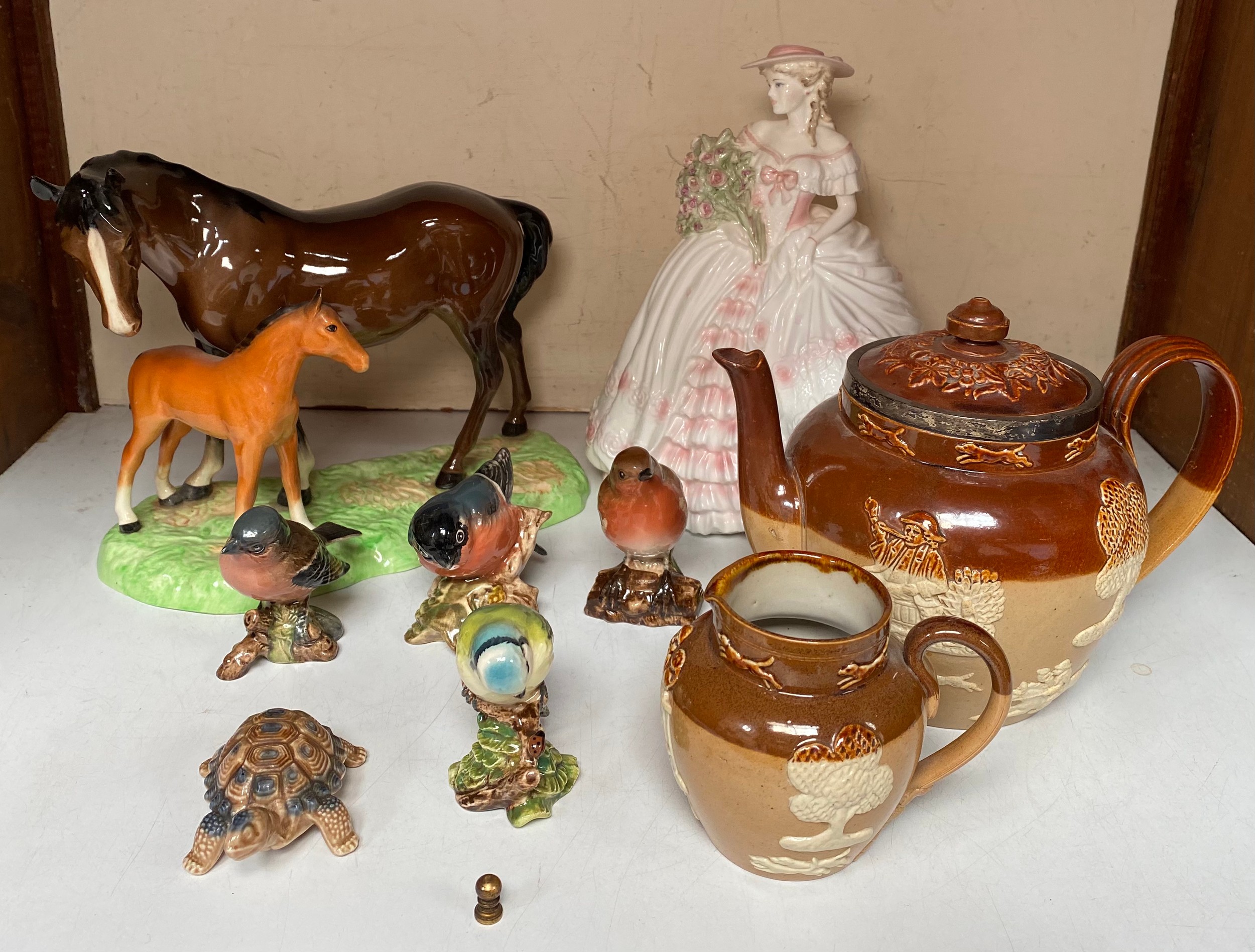 A small collection of assorted mixed ceramics comprising a Coalport figure ‘Rose’, various Beswick figures including a figure-group of horses and a silver-mounted Doulton Lambeth teapot decorated with a hunting scene and a matching small jug lacking mount (SECTION 9)