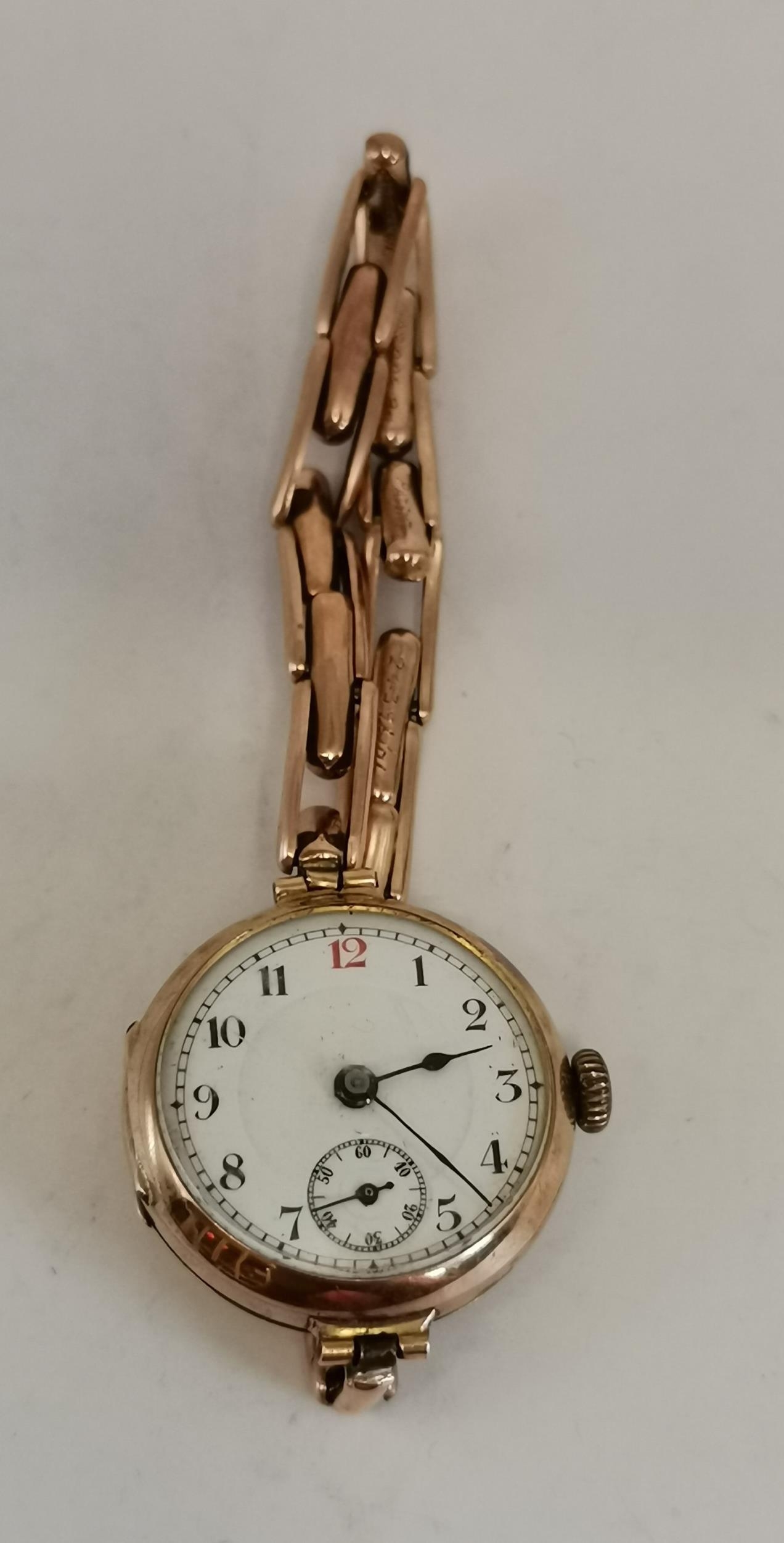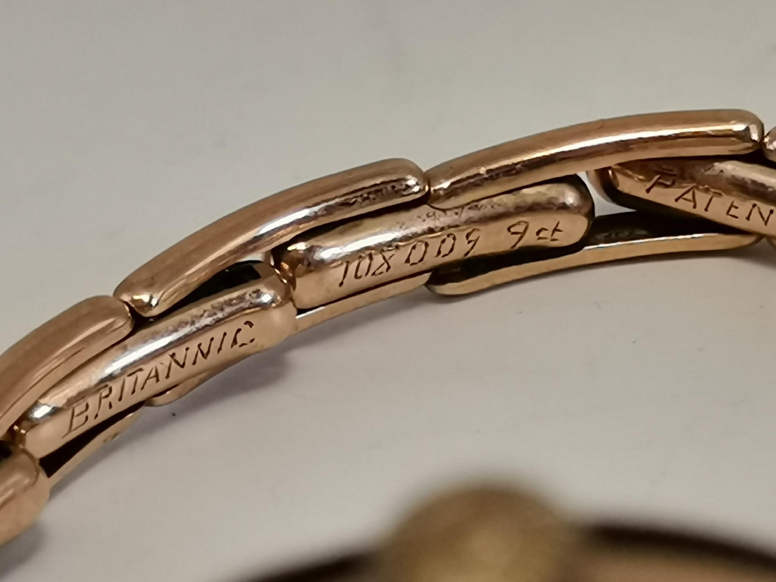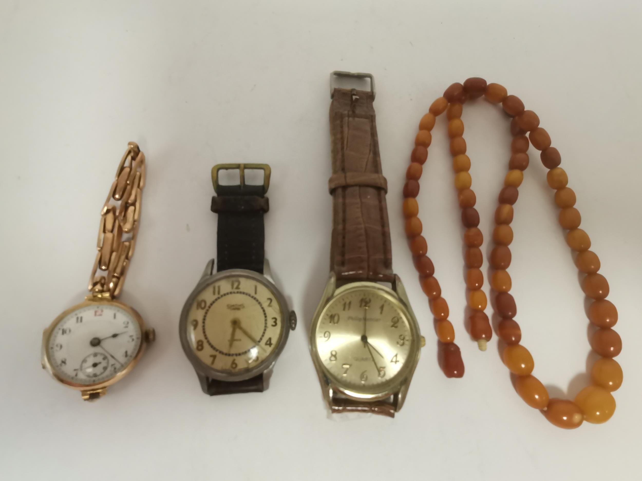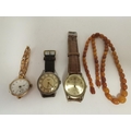 A lady's 9 carat gold wristwatch, the white circular dial unsigned, with Arabic numerals, blued steel hands, subsidiary seconds dial at 6 o'clock, the movement marked 15 Jewels, hinged caseback hallmarked 375 and numbered 50240 inside, to an expanding bracelet marked Britannia Patent 9ct, case 25mm diameter, 20.4g gross; together with two other gent's leather strap wristwatches, and a string of graduated amber type beads. (4)