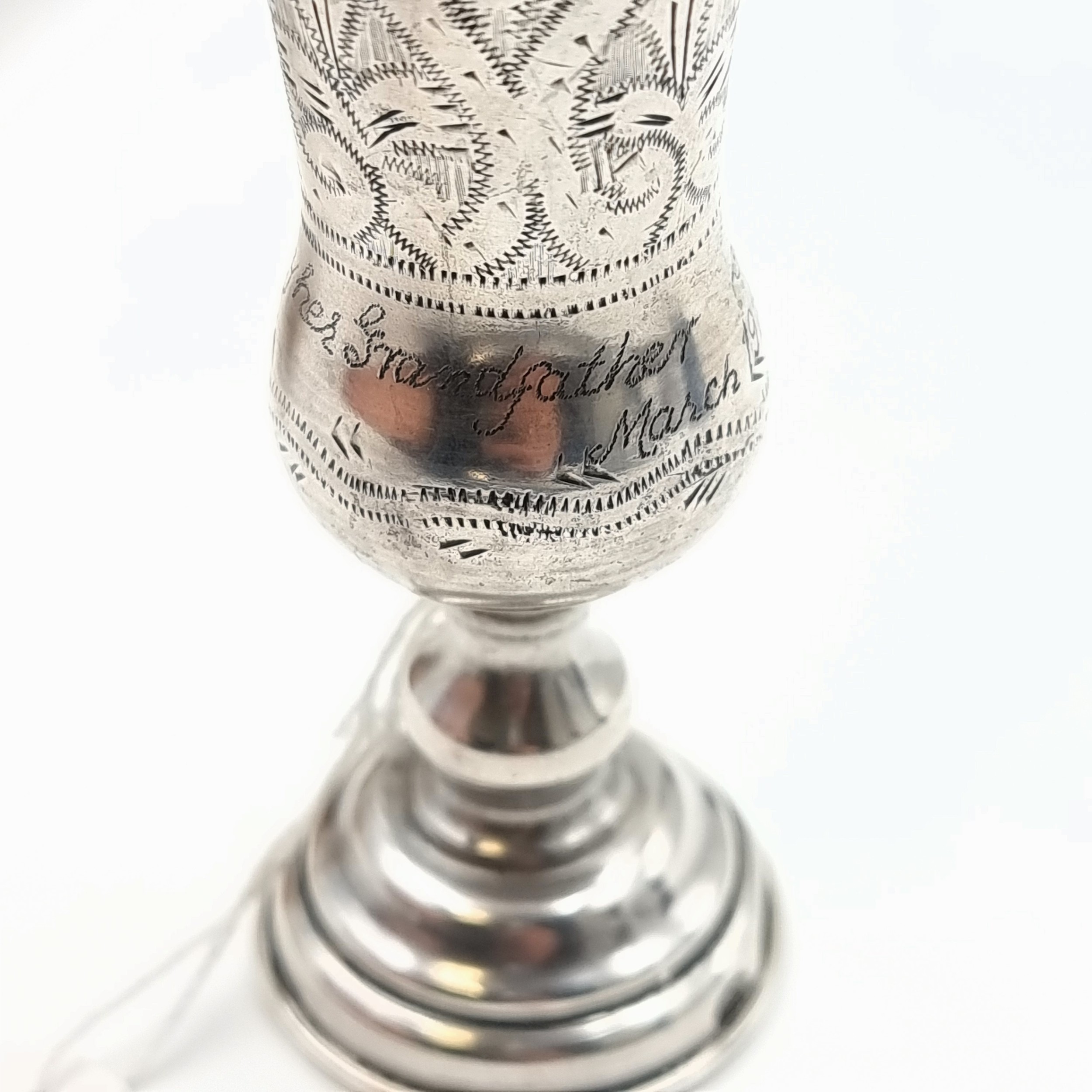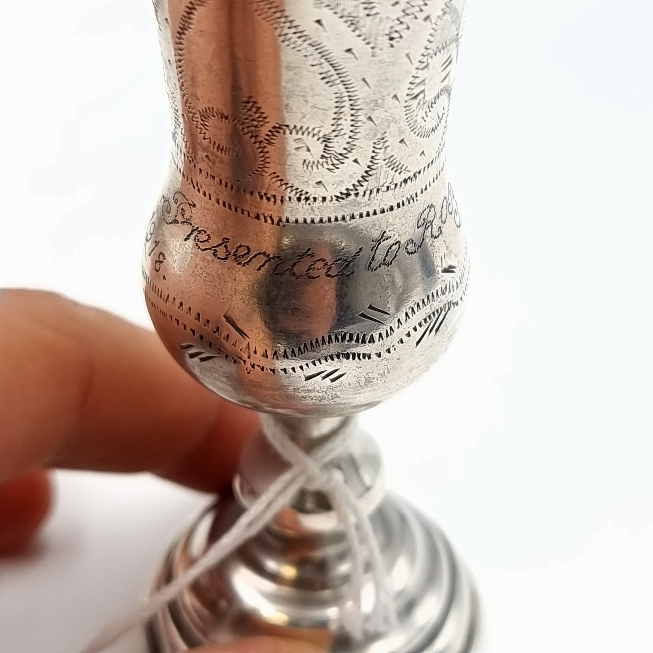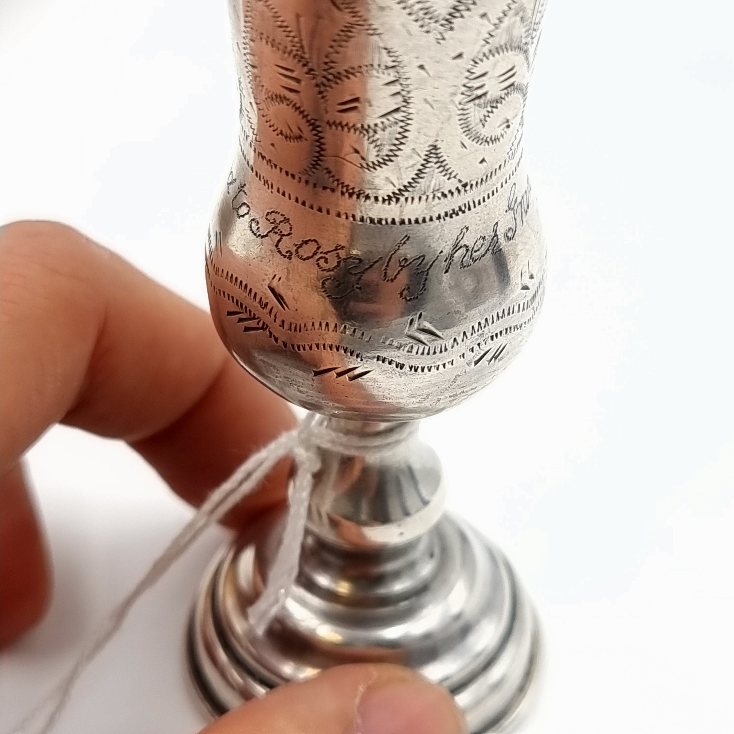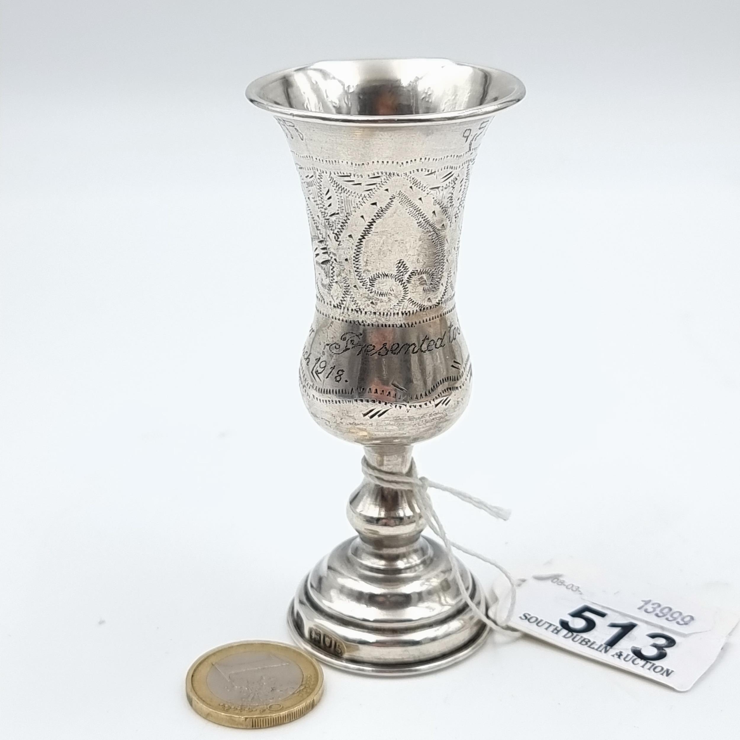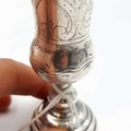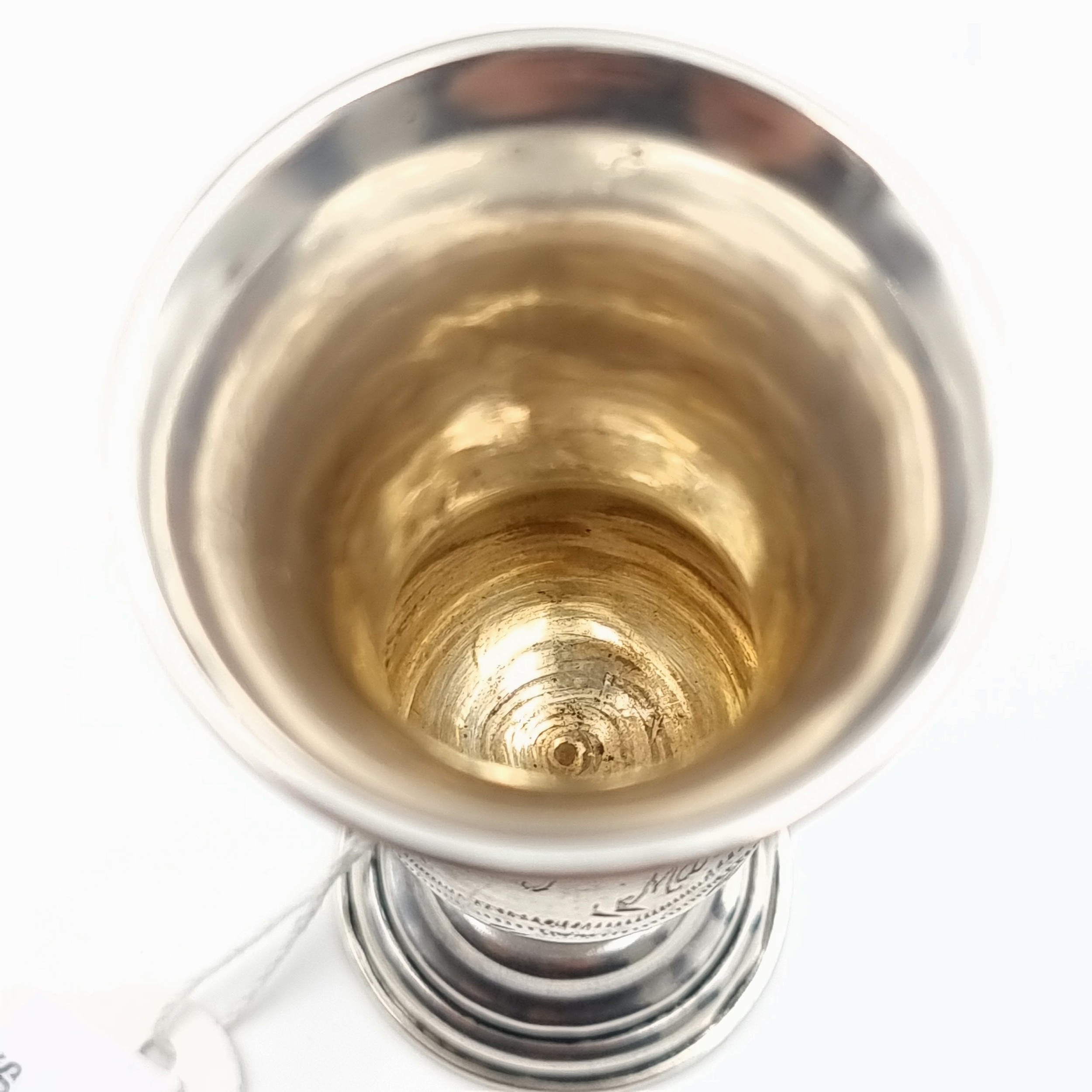 A great example of a Kiddich cup, with a graduated base and beautiful etched detailing to body. Hallmarked London, circa 1905. Height: 9.5cm. Bowl: 4cm. Total weight: 36.19 grams.