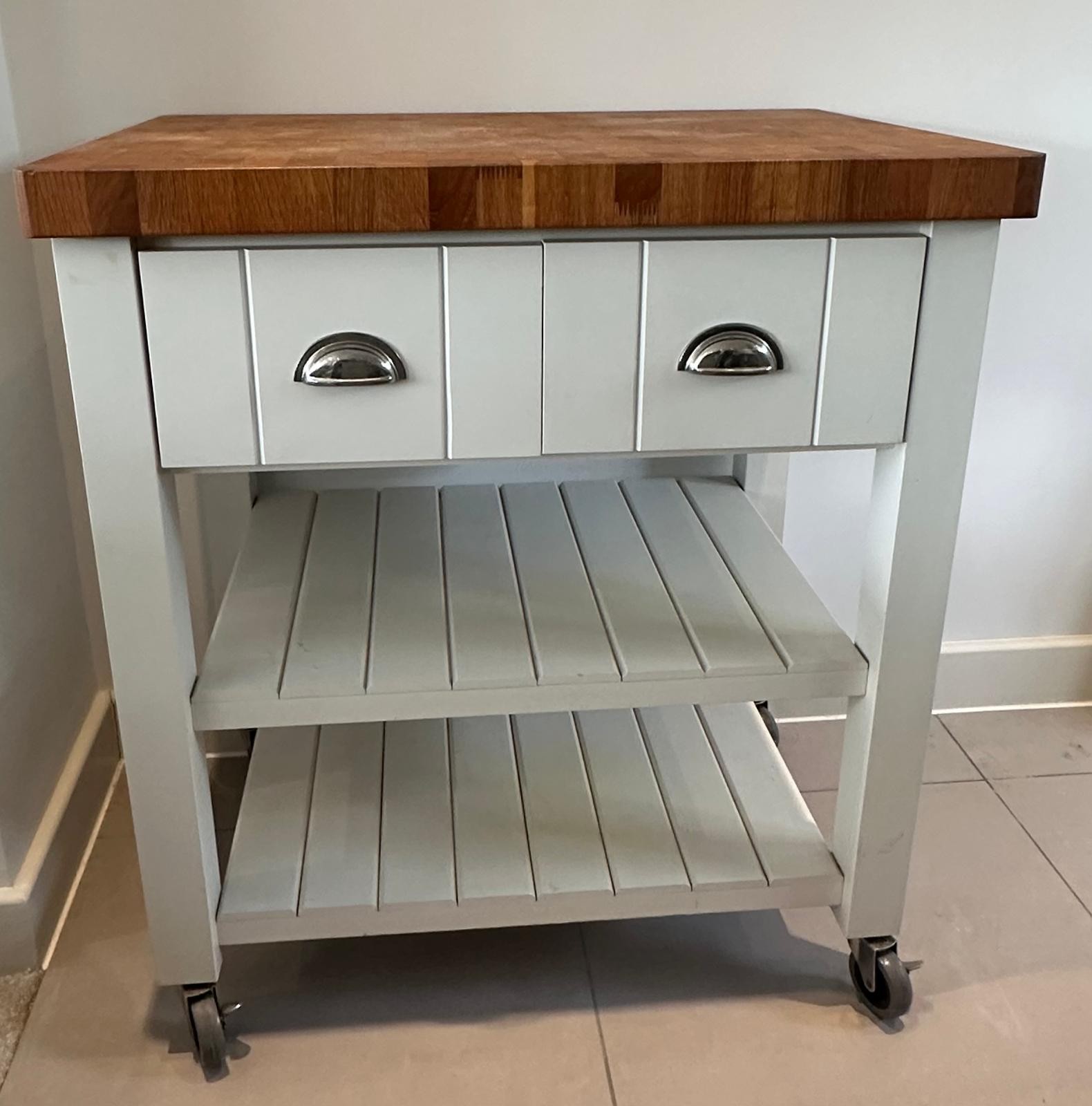 Butchers block trolley with two drawers and shelves by T&G Woodware, Bristol, England