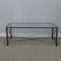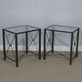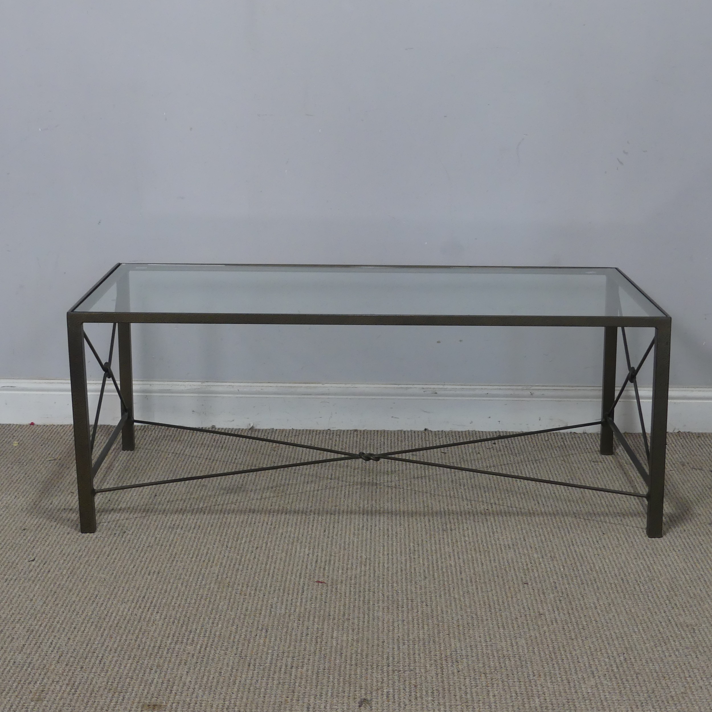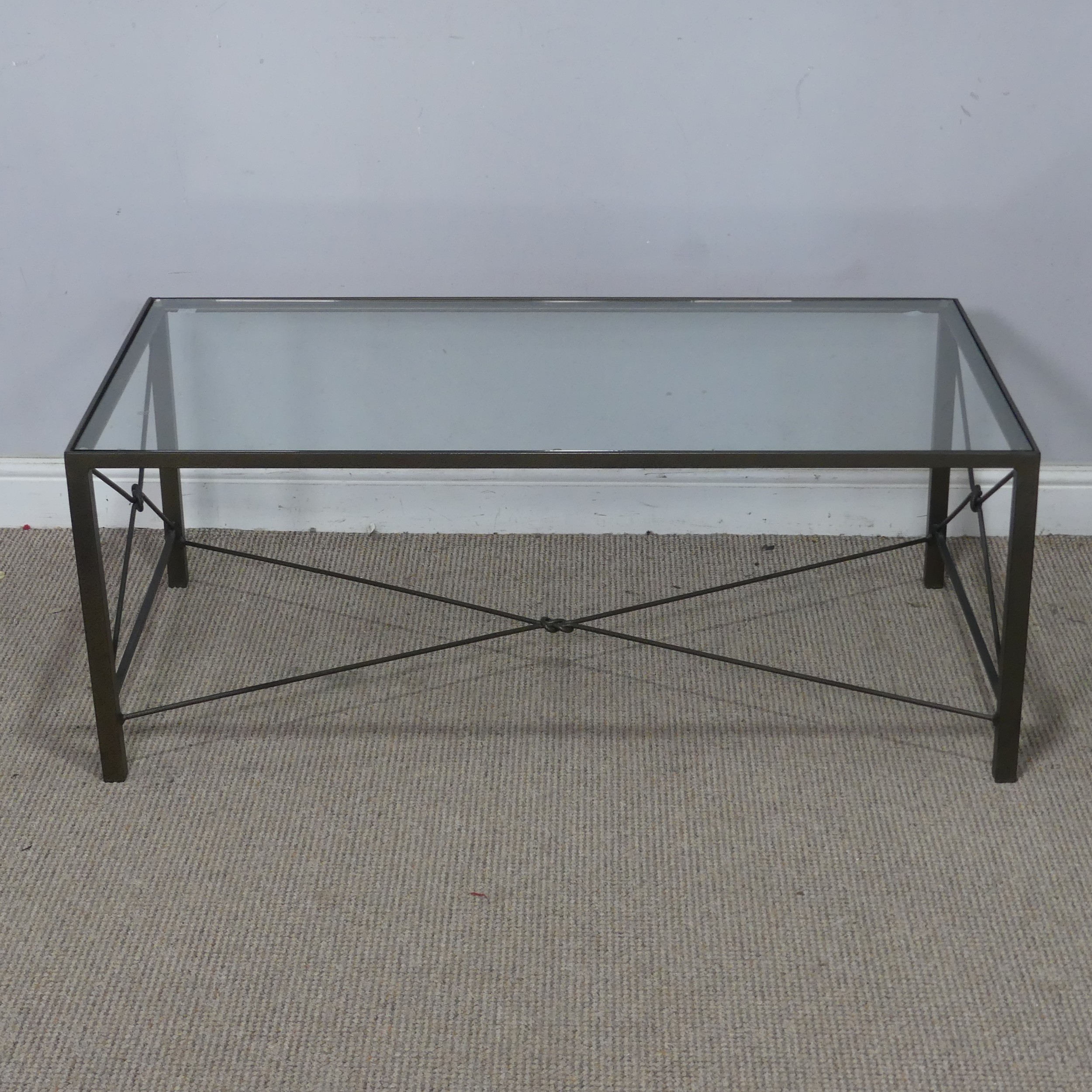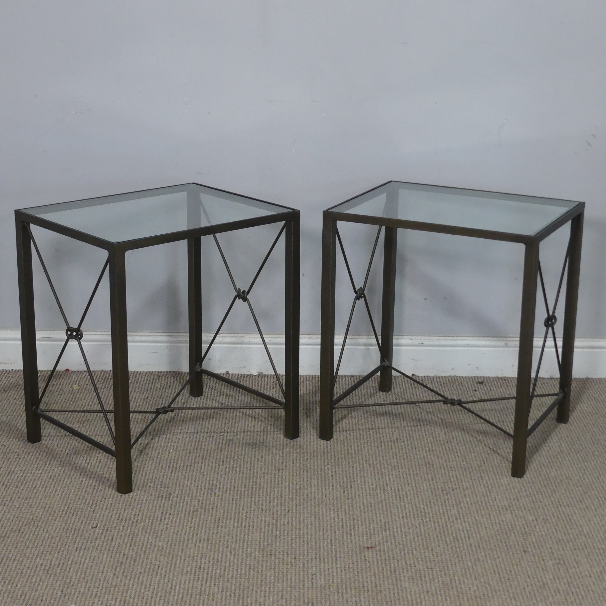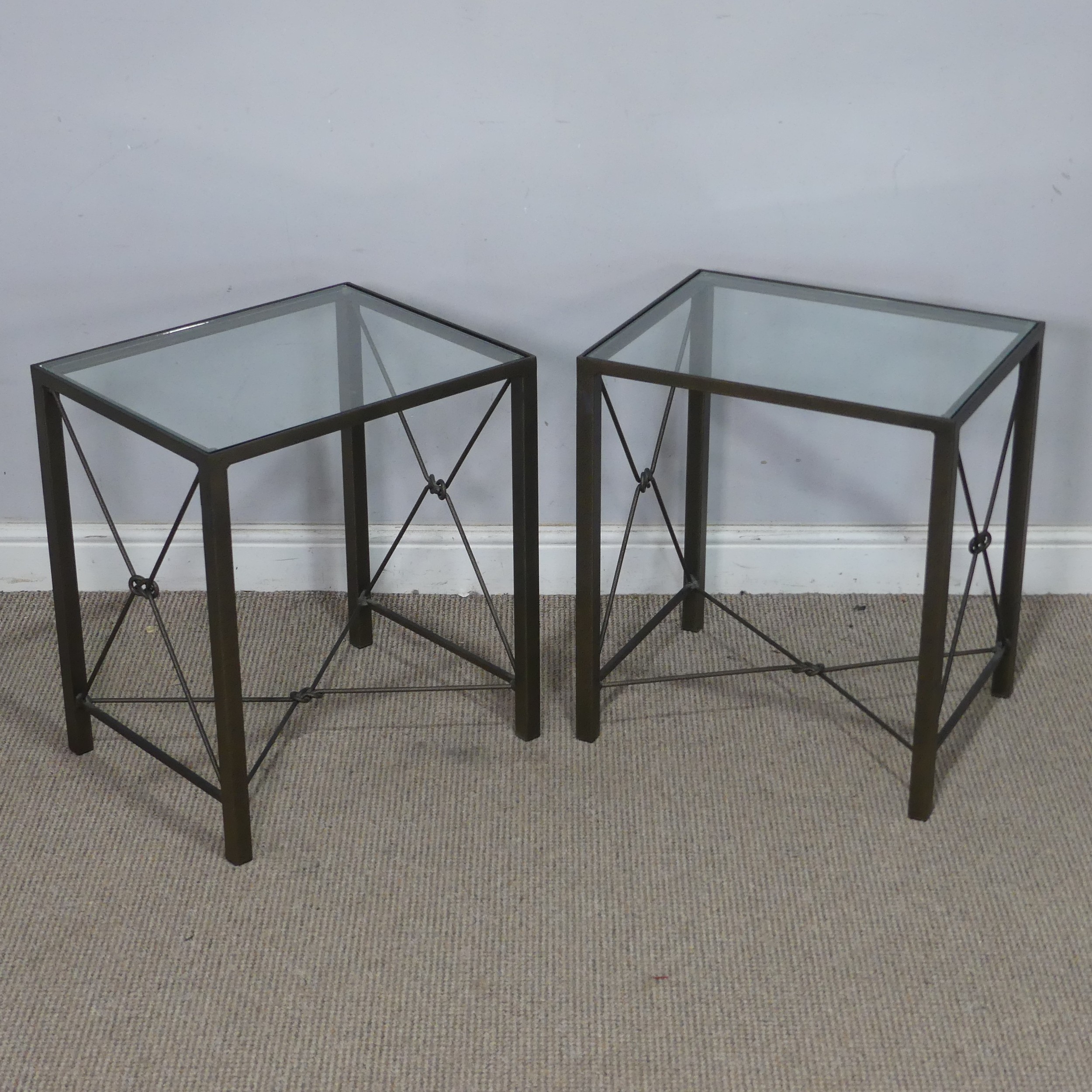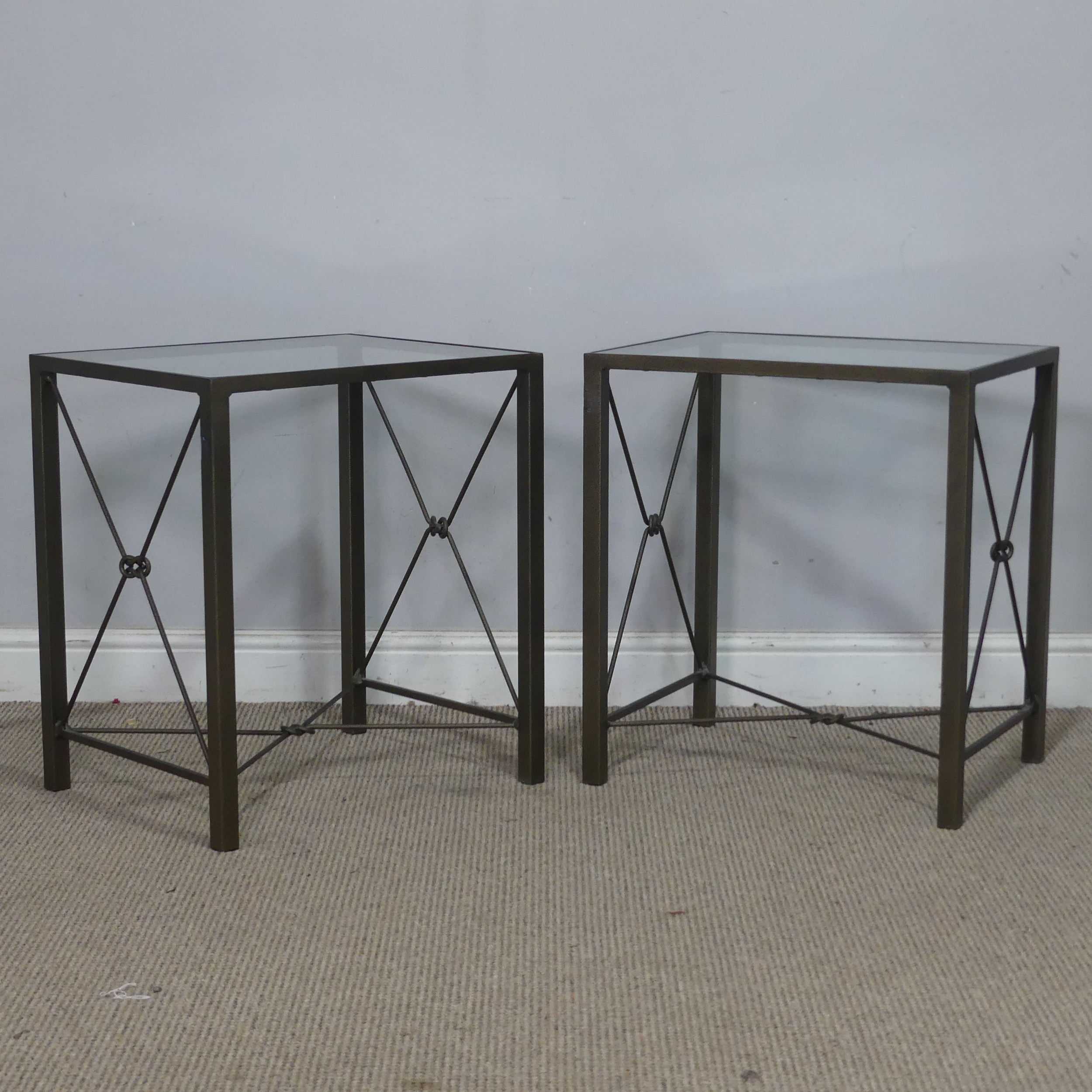 A contemporary glass top coffee Table, with 'zeppelin bend' iron stretchers, W 110 cm x H 42 cm x D 60 cm, together with a matching pair of lamp Tables, W 50 cm x H 56 cm x D 40 cm. (3)