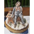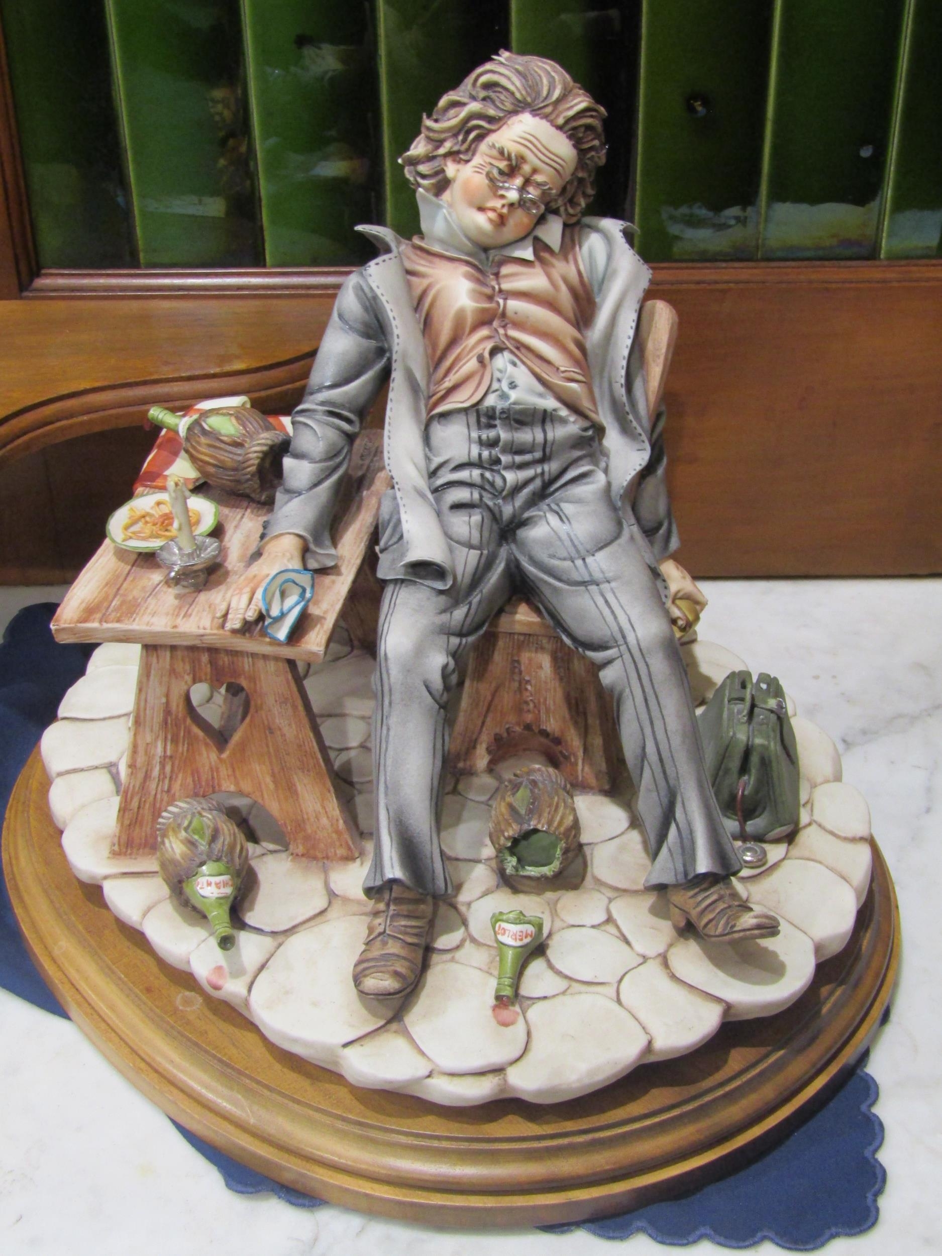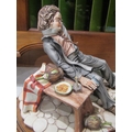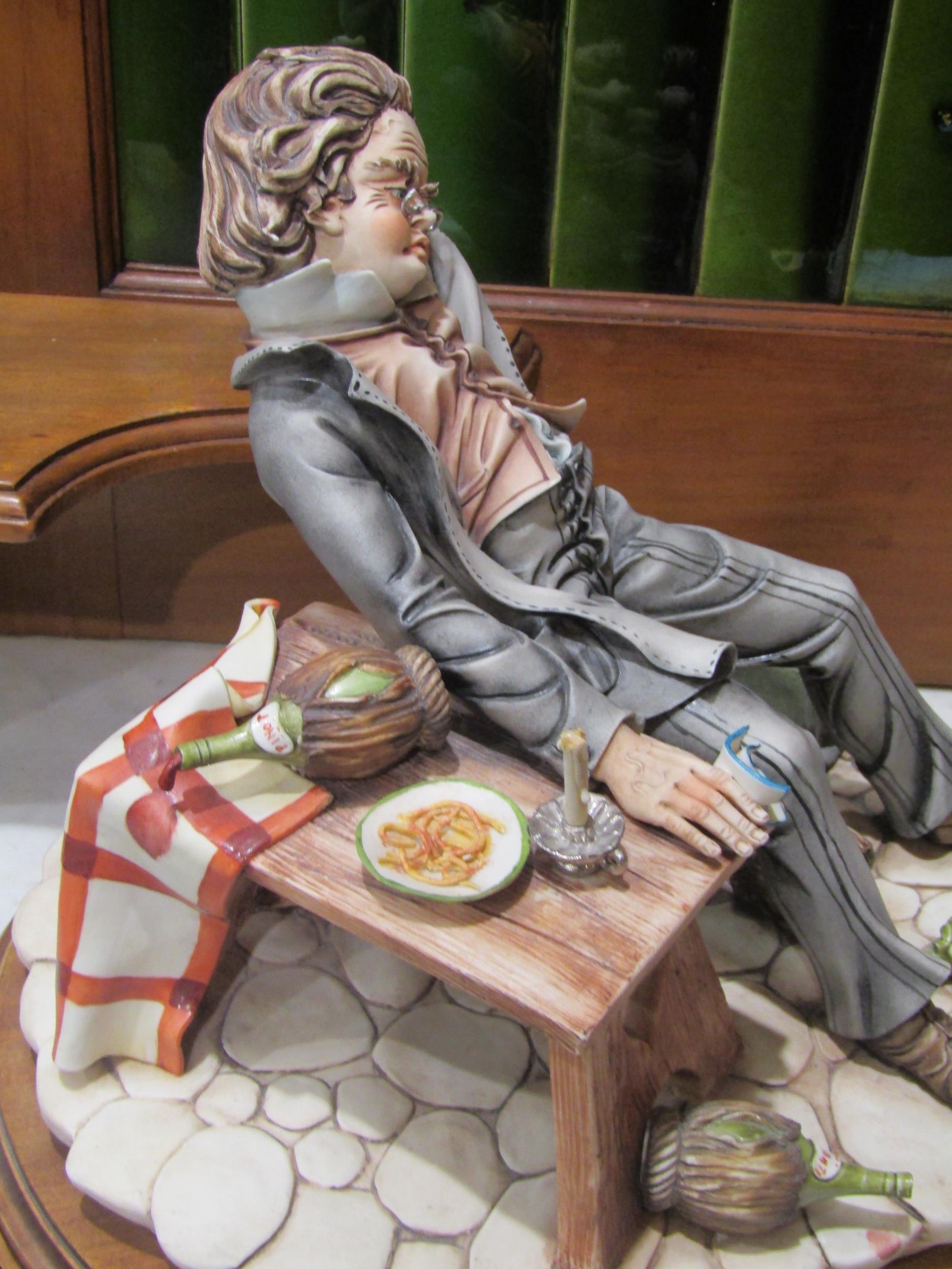 A Capo-di-monte figure of drunken doctor at a wooden table 29cm tall, 35cm long wooden base