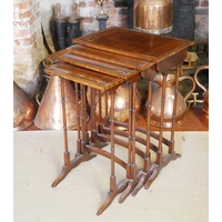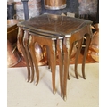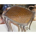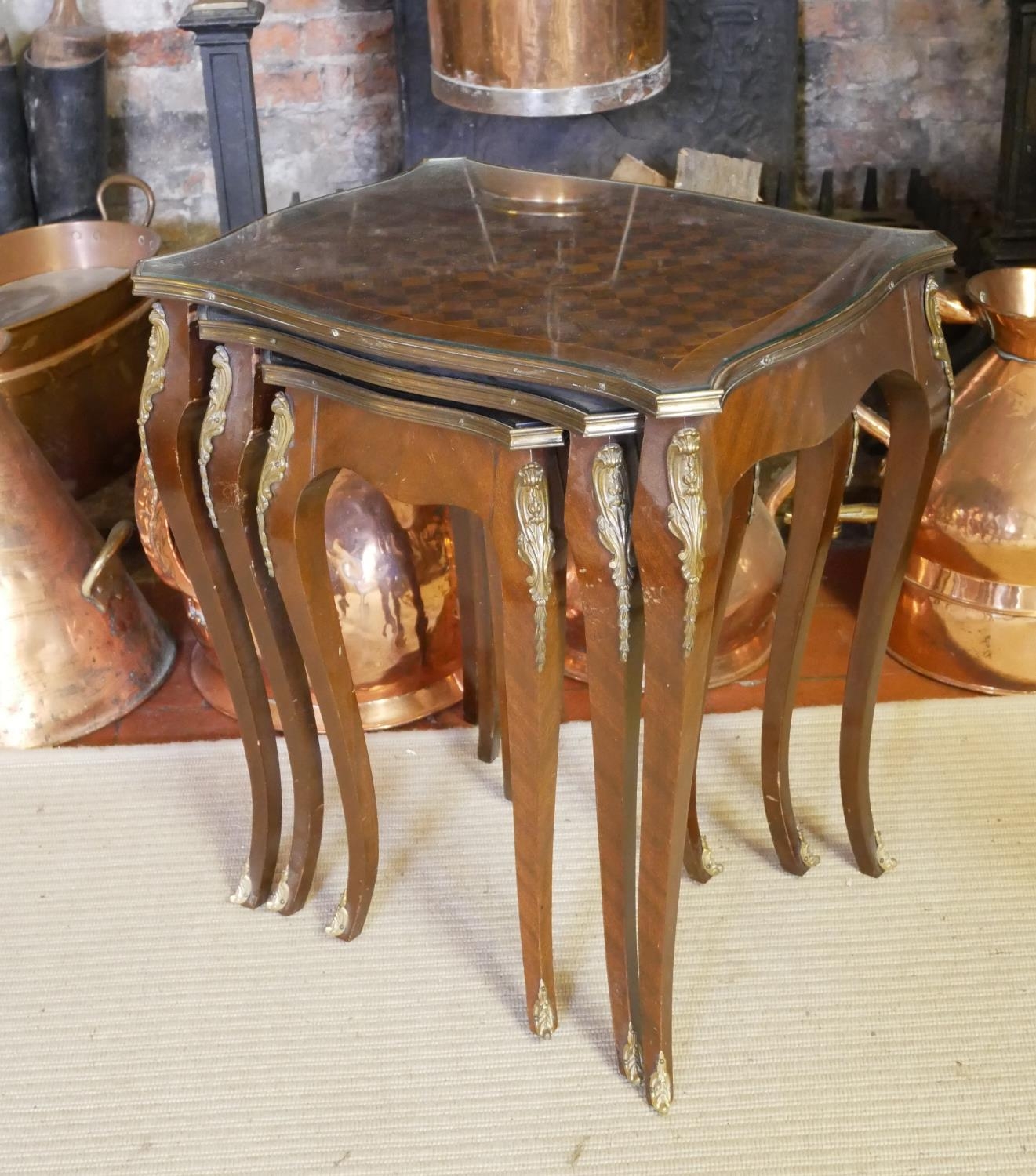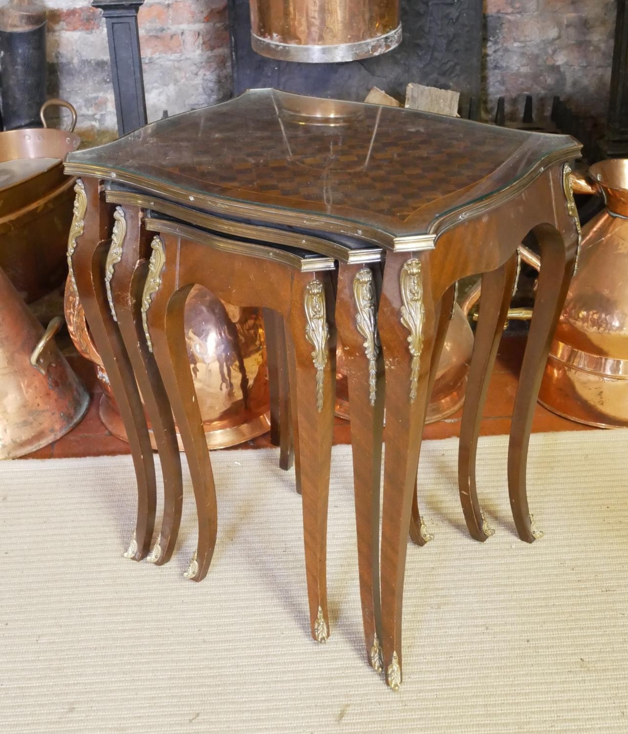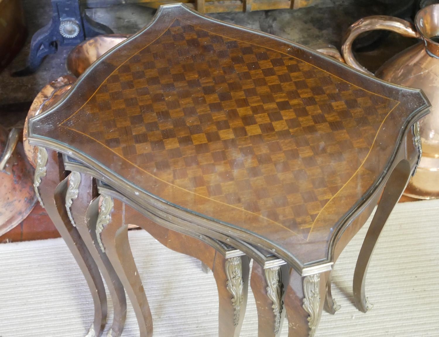 A NEST OF THREE FRENCH MAHOGANY, PARQUETRY AND GILT BRONZE MOUNTED OCCASIONAL SERPENTINE TABLES