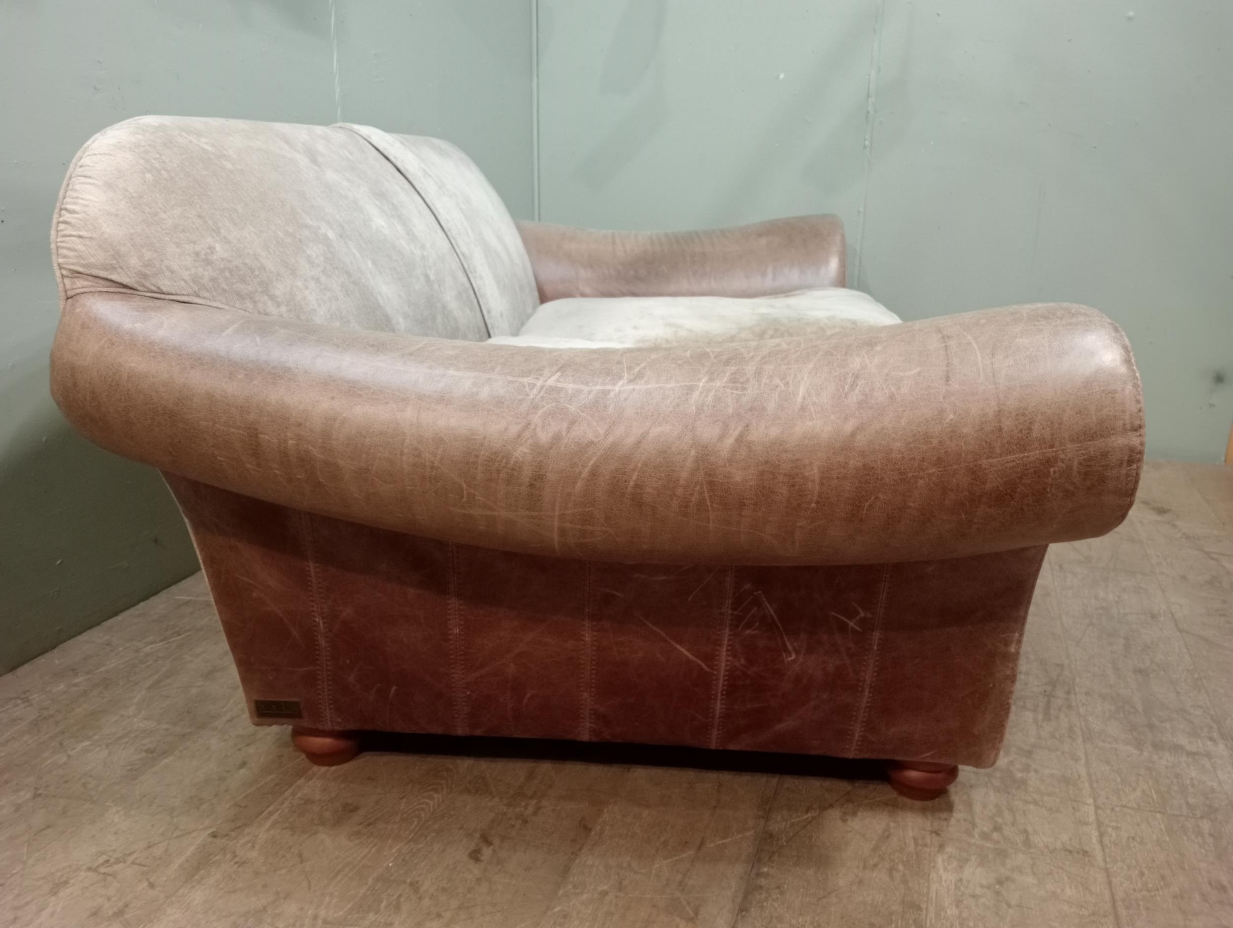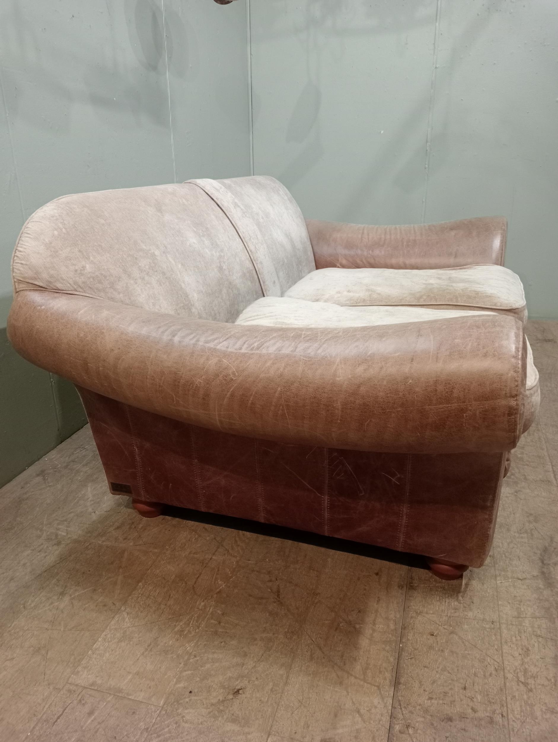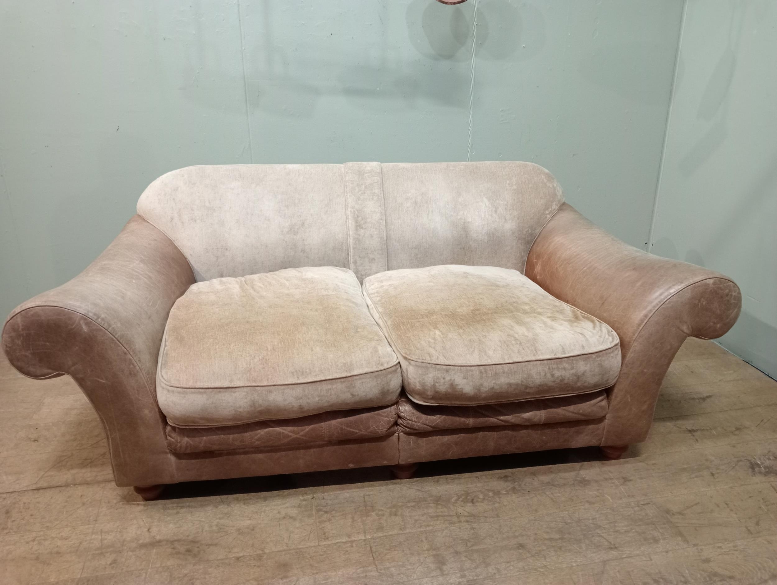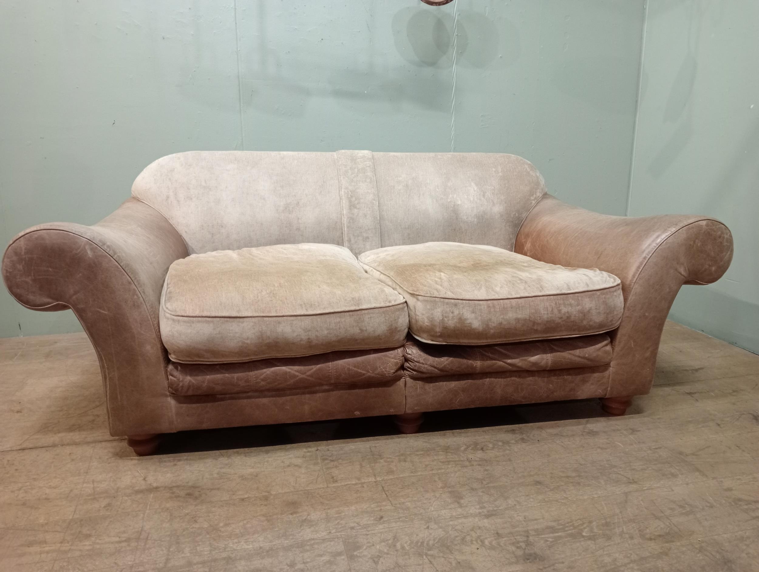 Halo design two seater sofa with suede and leather upholstery on turned feet. {H 80cm x W 195cm x D 100cm }. NOT AVAILABLE TO VIEW IN PERSON.