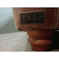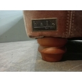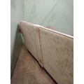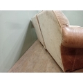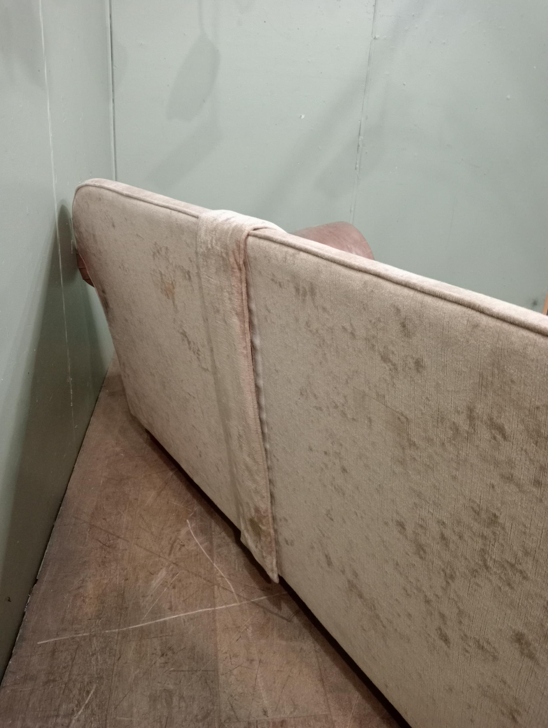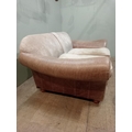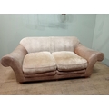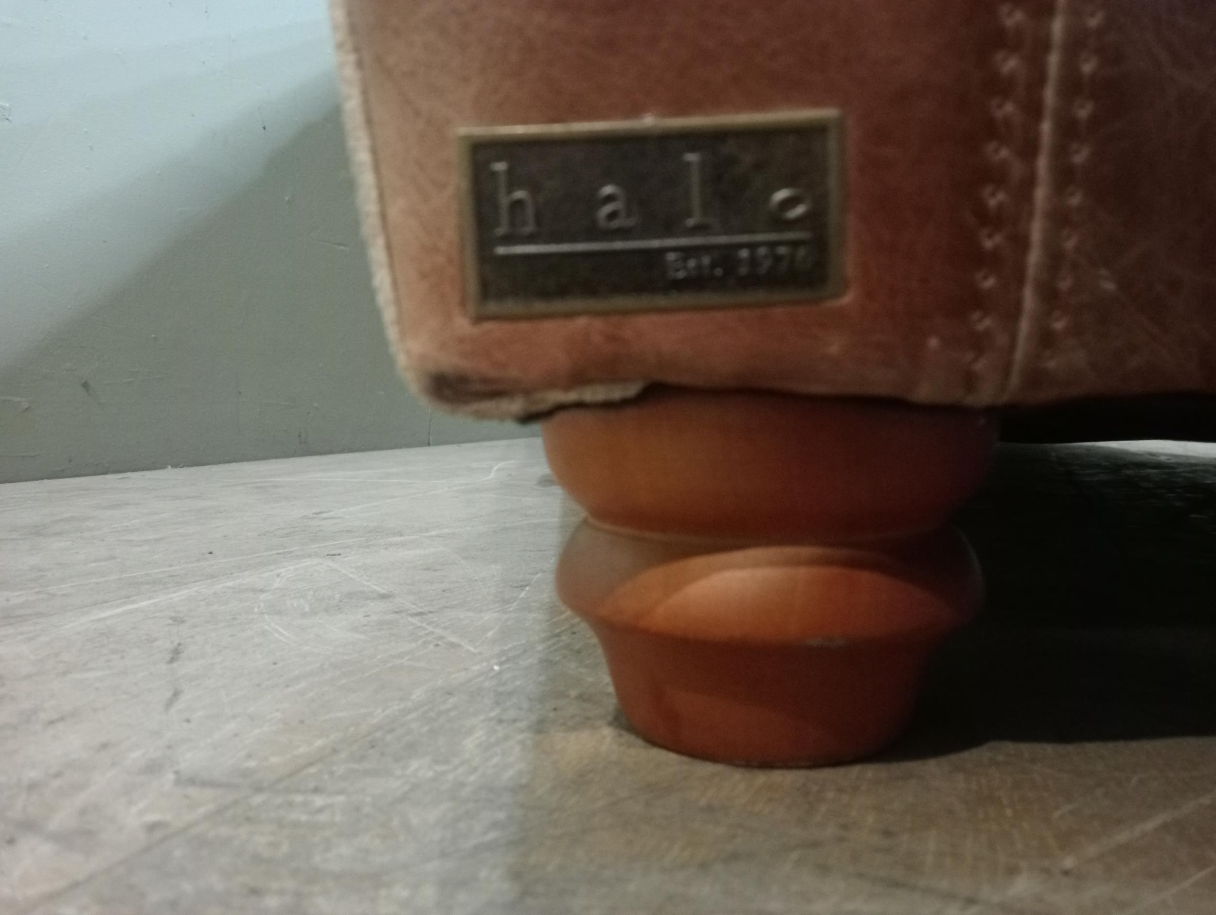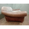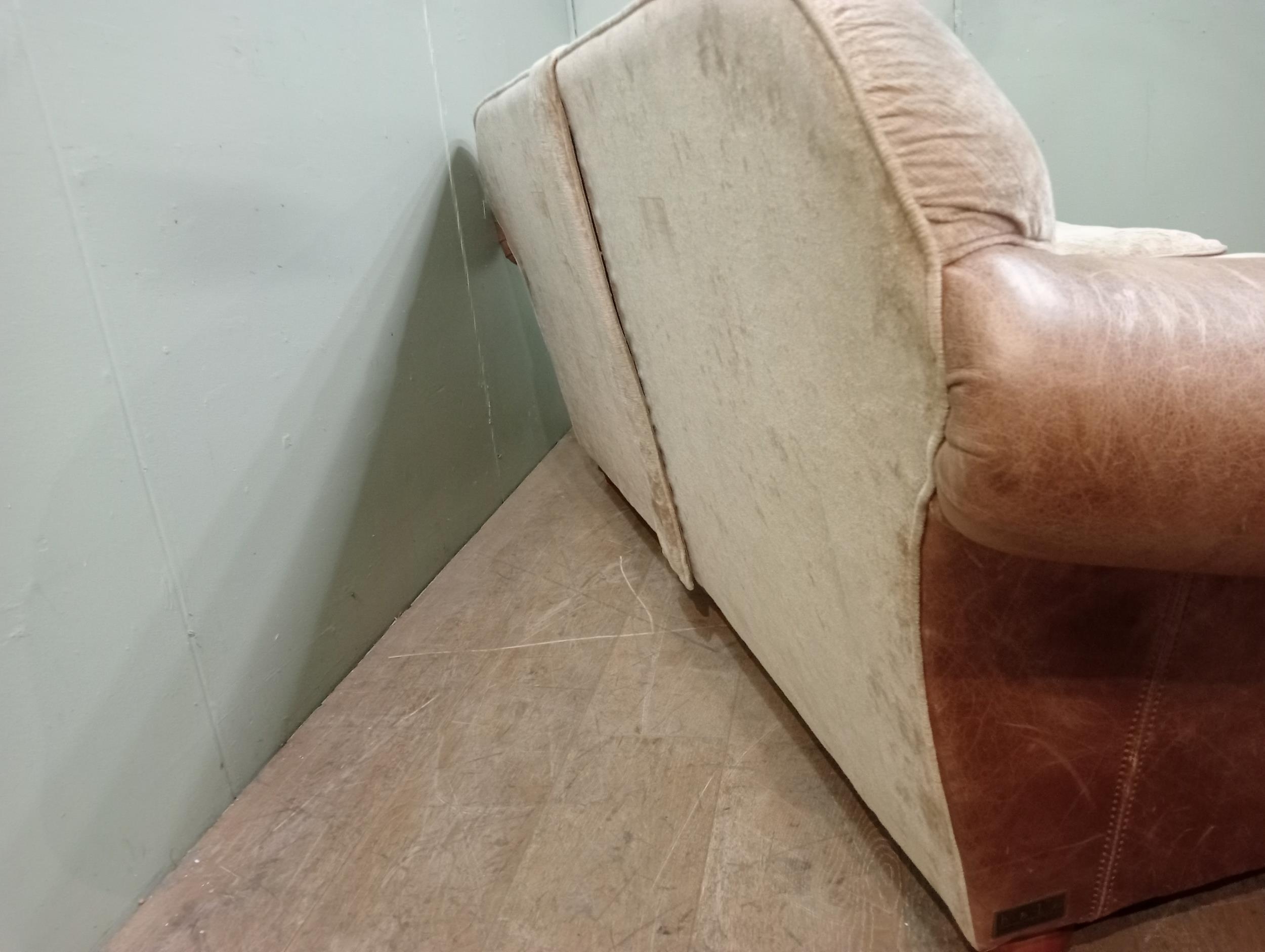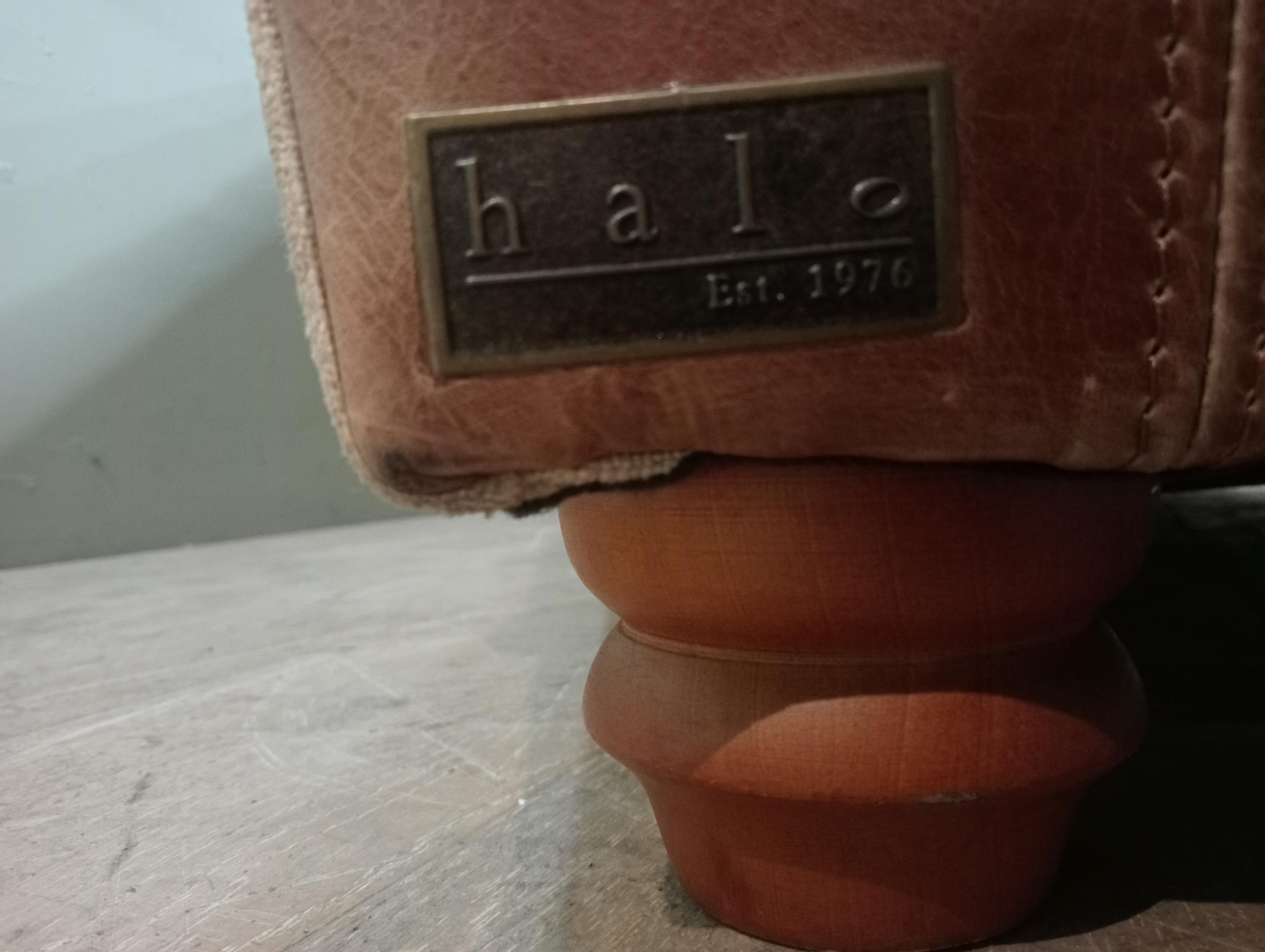 Halo design two seater sofa with suede and leather upholstery on turned feet. {H 80cm x W 195cm x D 100cm }. NOT AVAILABLE TO VIEW IN PERSON.