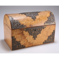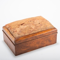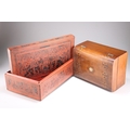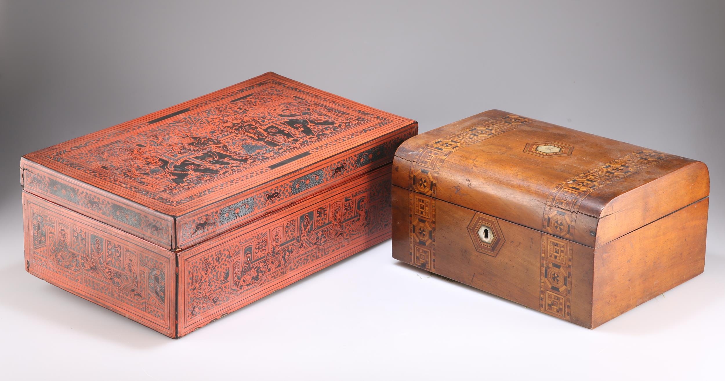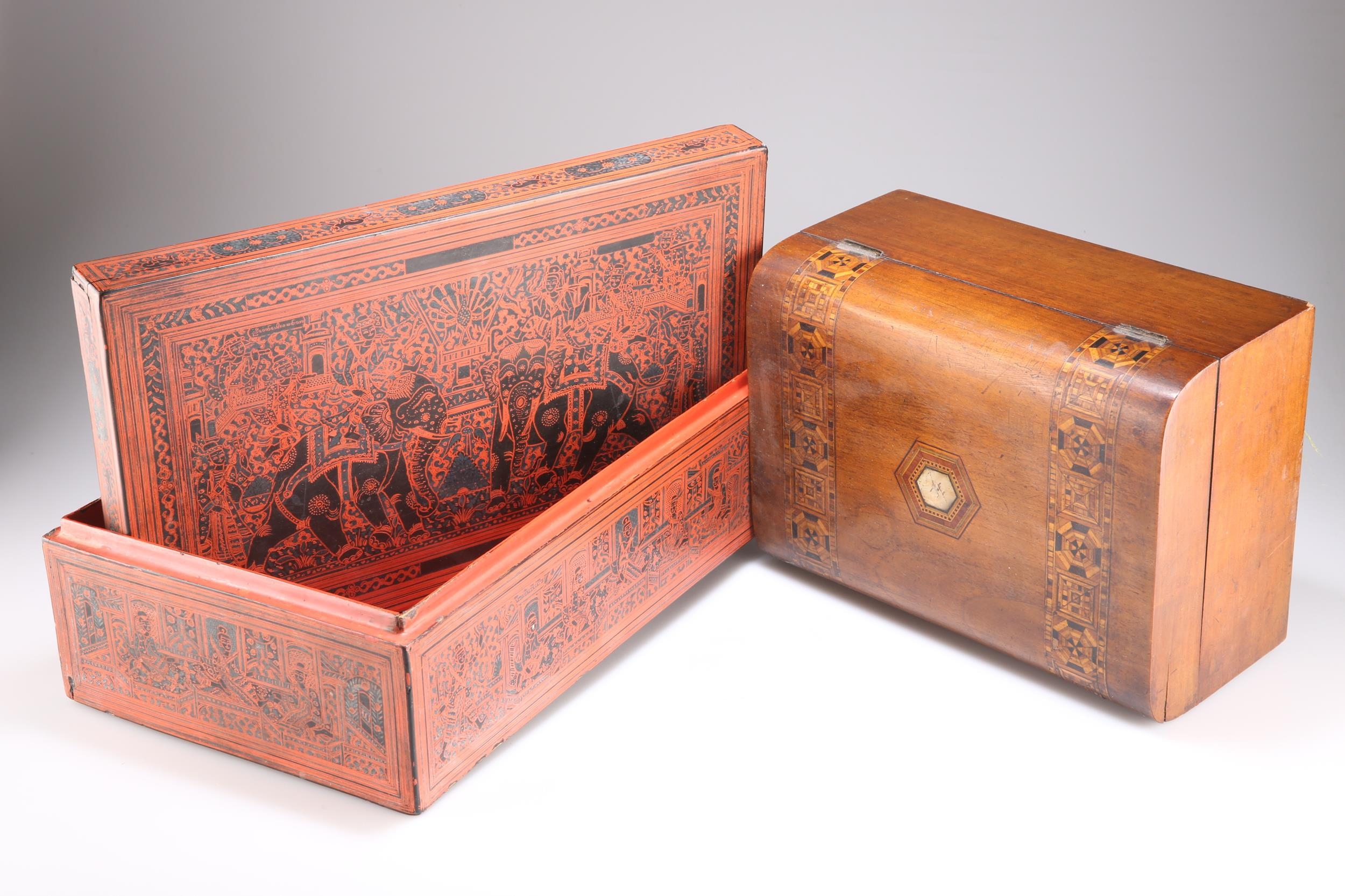 A BURMESE RED LACQUER BOX AND A TUNBRIDGE WARE WORK BOX