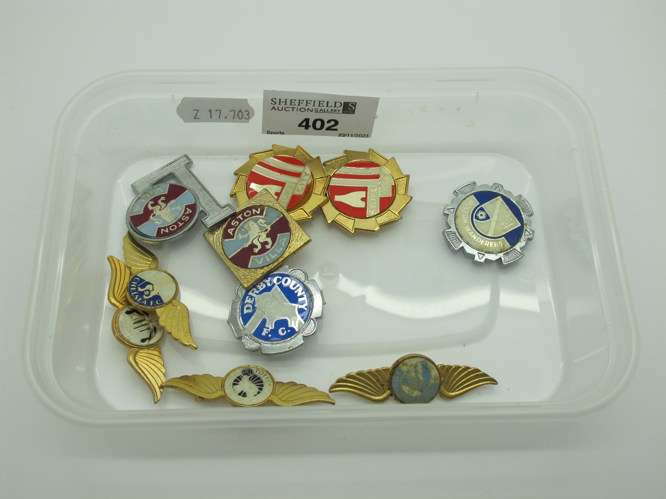 1970s Lapel Badges, Aston Villa, Stoke, Chelsea, Tottenham, Manchester City:- (10)