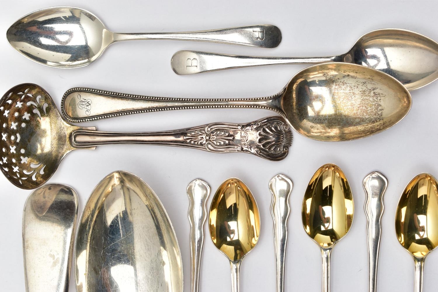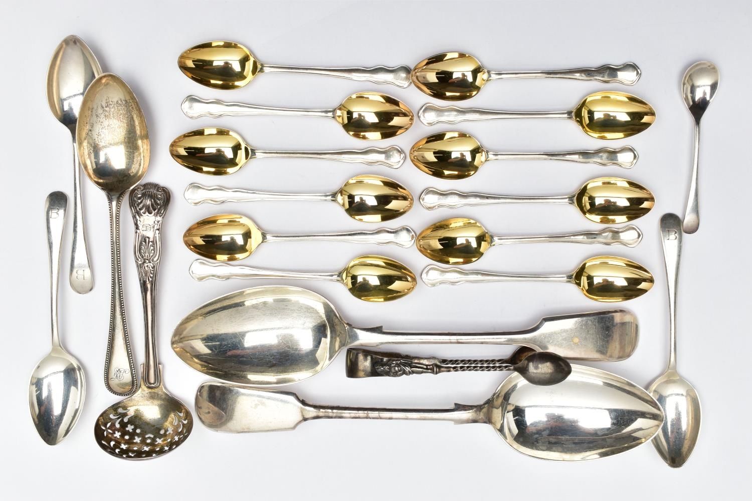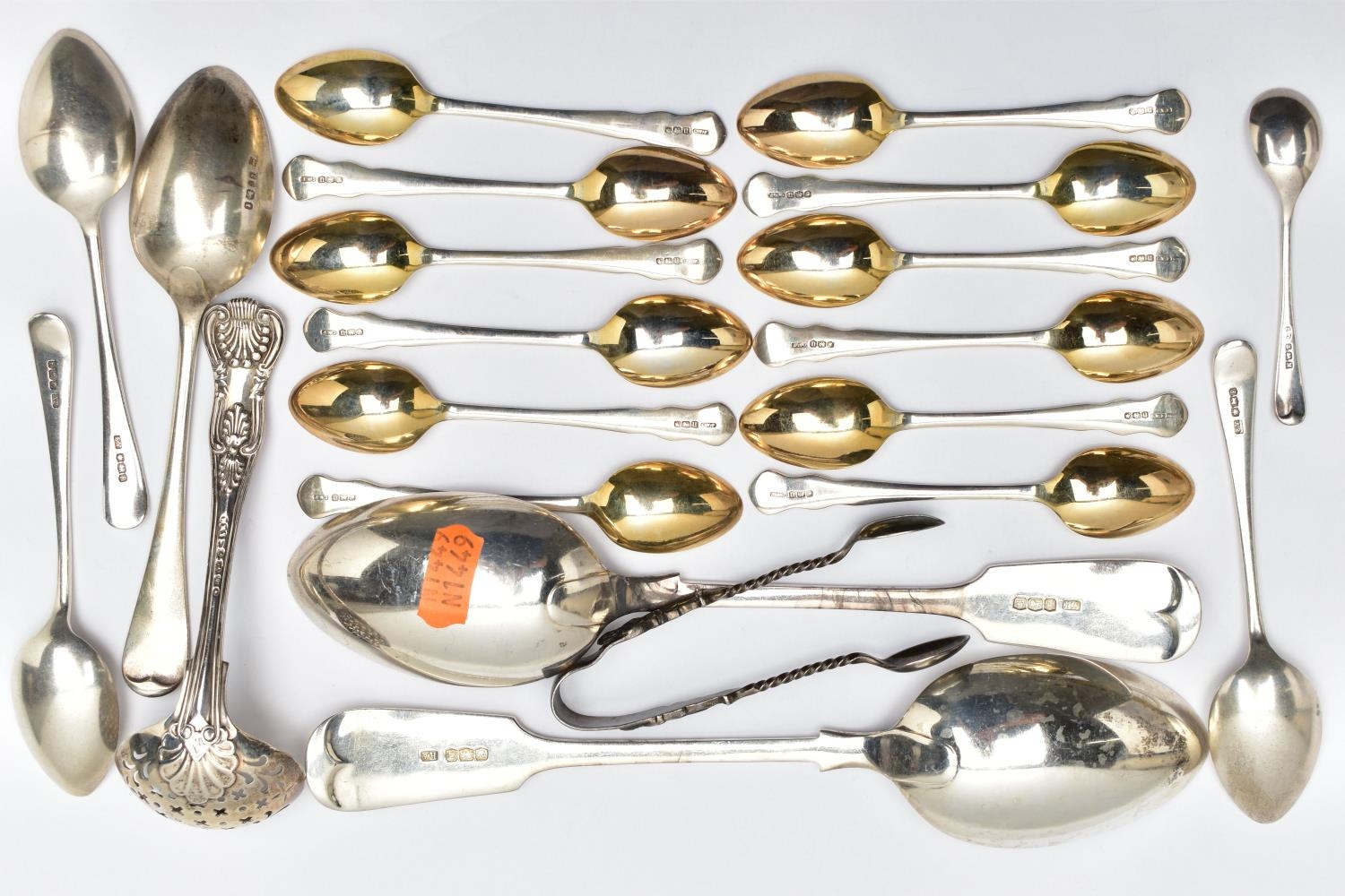 A PARCEL OF 19TH AND 20TH CENTURY SILVER FLATWARE, including a pair of George V Fiddle pattern tablespoons, makers Atkin Brothers, Sheffield 1924, a Victorian Kings pattern sugar caster spoon, gilt bowl, maker William Robert Smily, London 1853, a set of twelve George VI coffee spoons with gilt bowls, makers C W Fletcher & Son Ltd, Sheffield 1937, a set of three George V Old English pattern teaspoons, engraved initial 'B', Sheffield 1932, etc, gross weight 17.10ozt, 531.8 grams (Parcel) (Condition report: generally in useable condition, signs of light to moderate use)