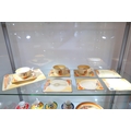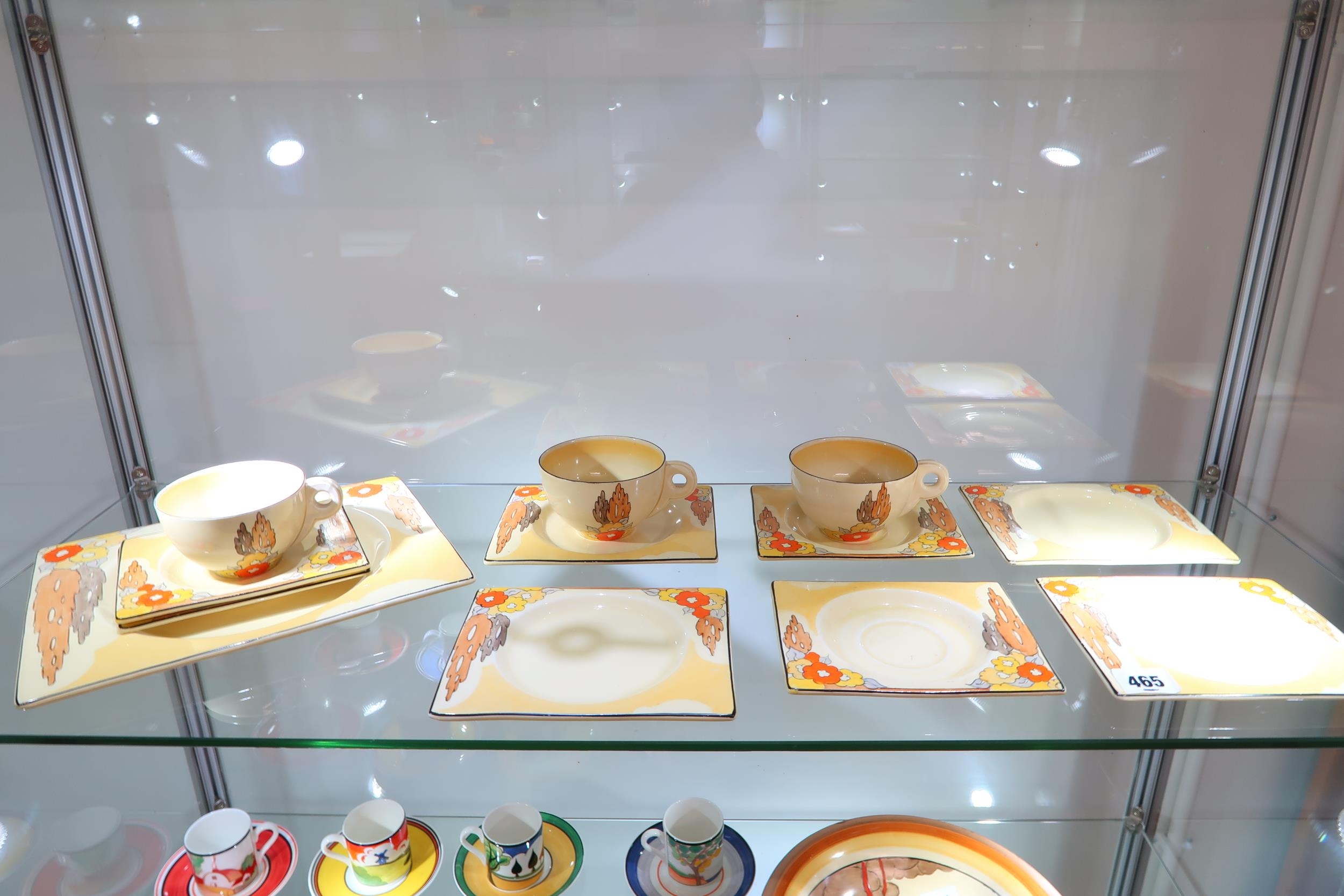 A Clarice Cliff Biaritz - Eight saucers, three cups, a sandwich plate - some crazing