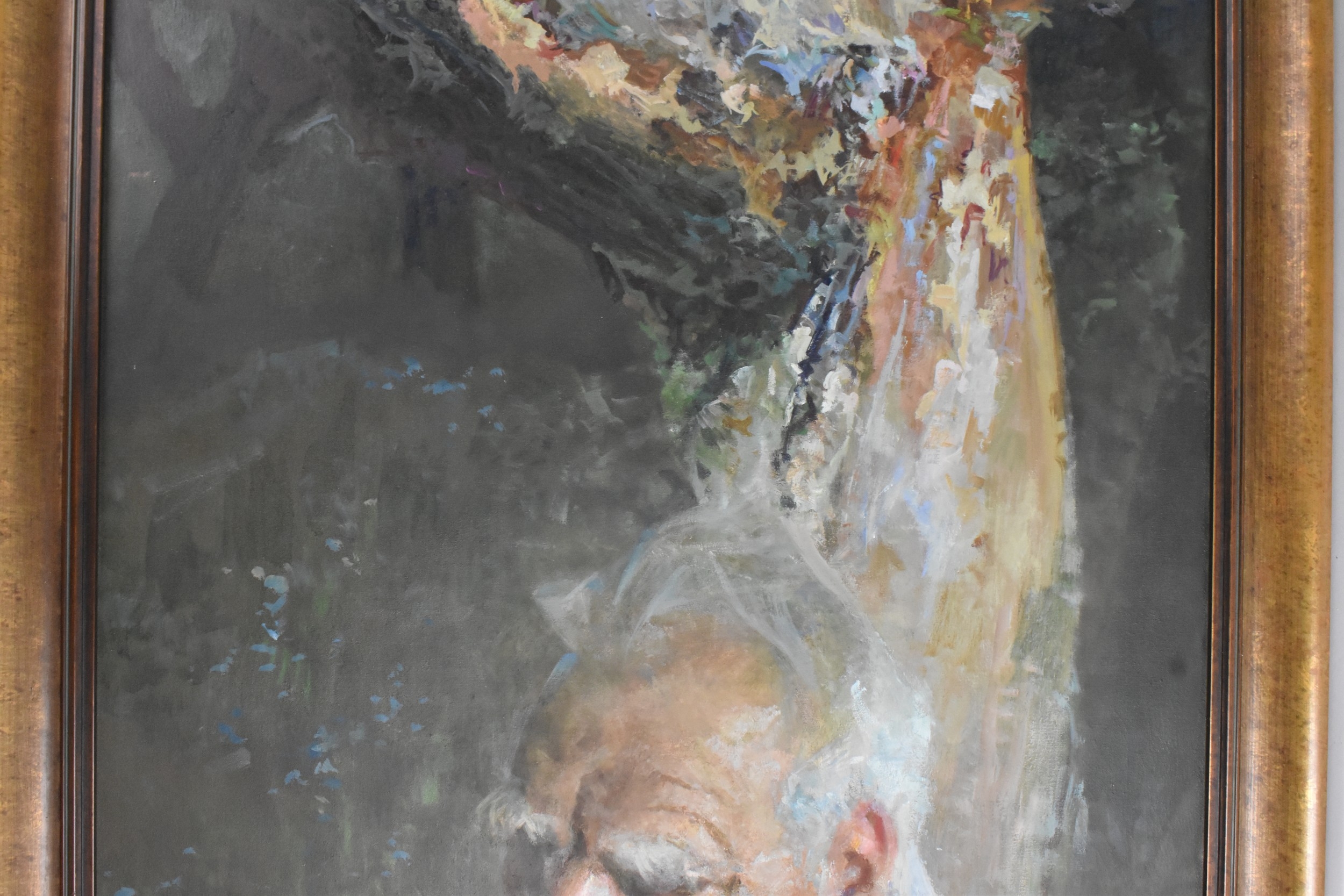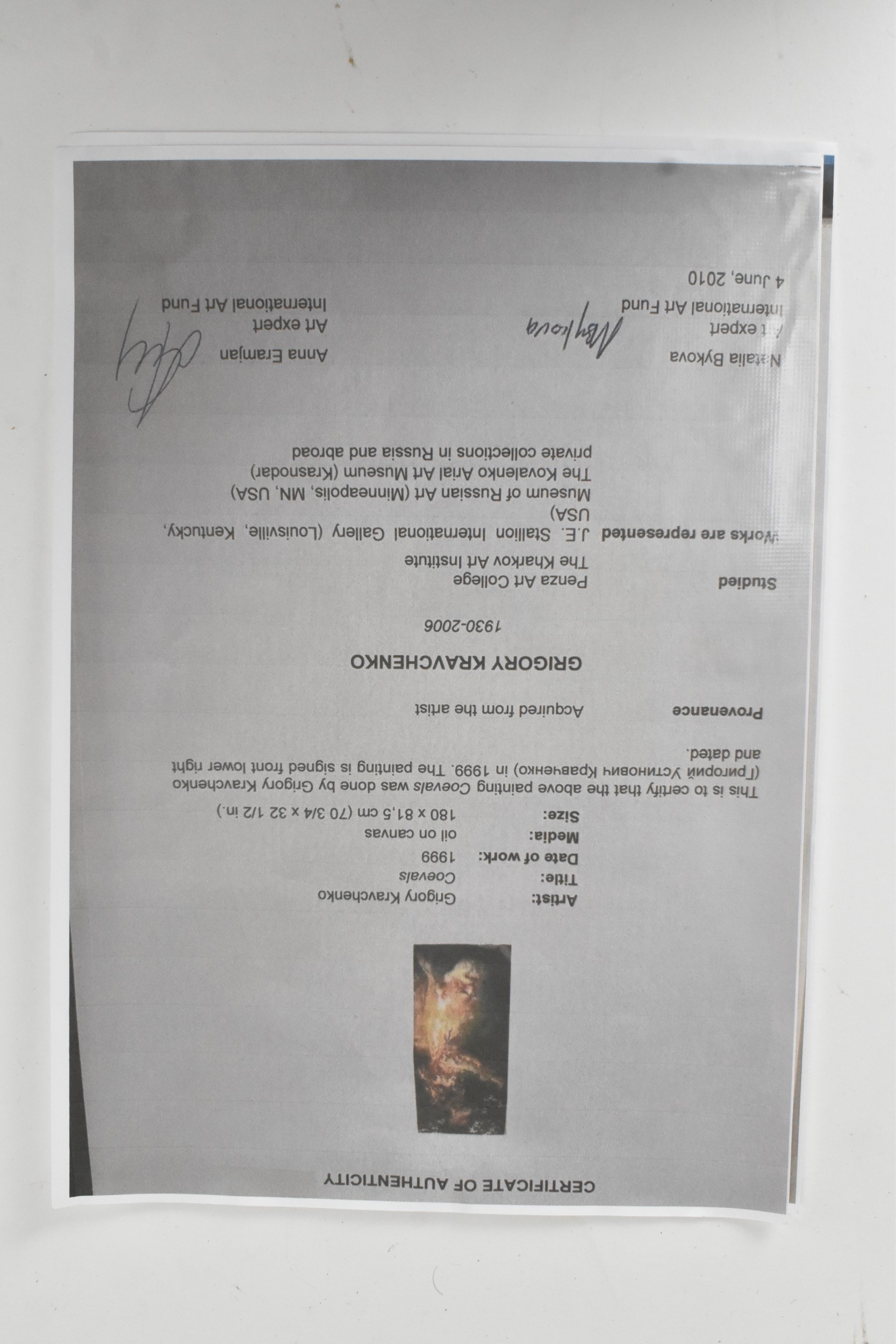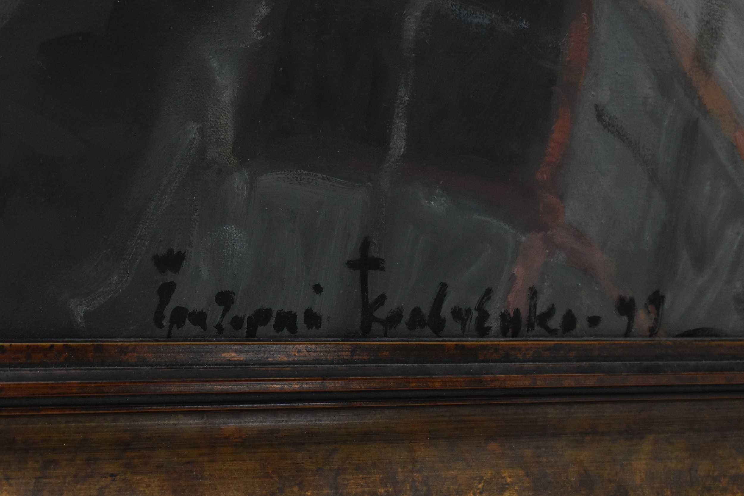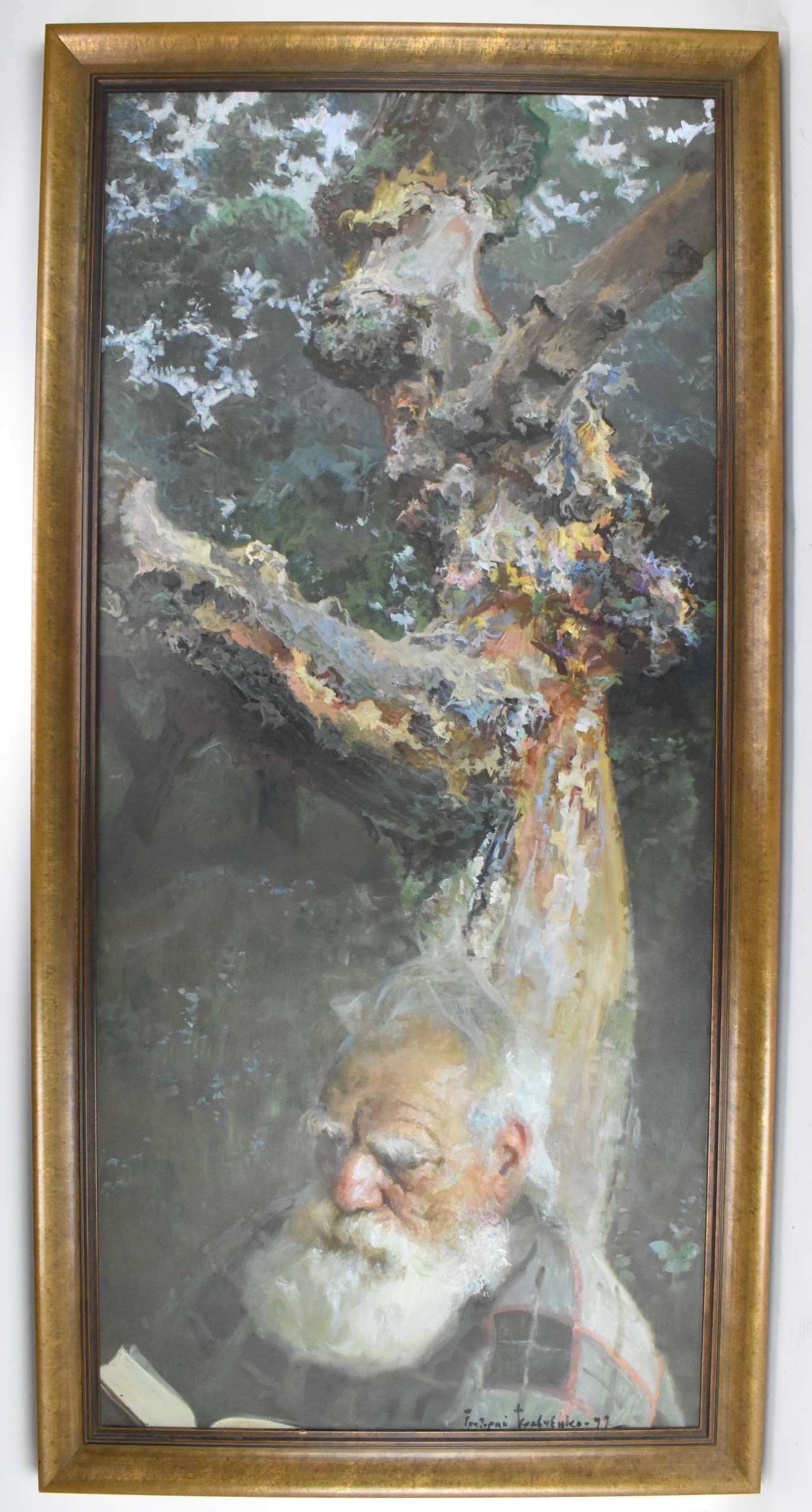 Grigory Kravchenko (1930-2006) An oil on canvas entitled 'Coevals', signed and dated 99 to the lower right corner, with photocopy of certificate of authenticity, 180cm x 81.5cm, the frame 192.5cm x 95cm