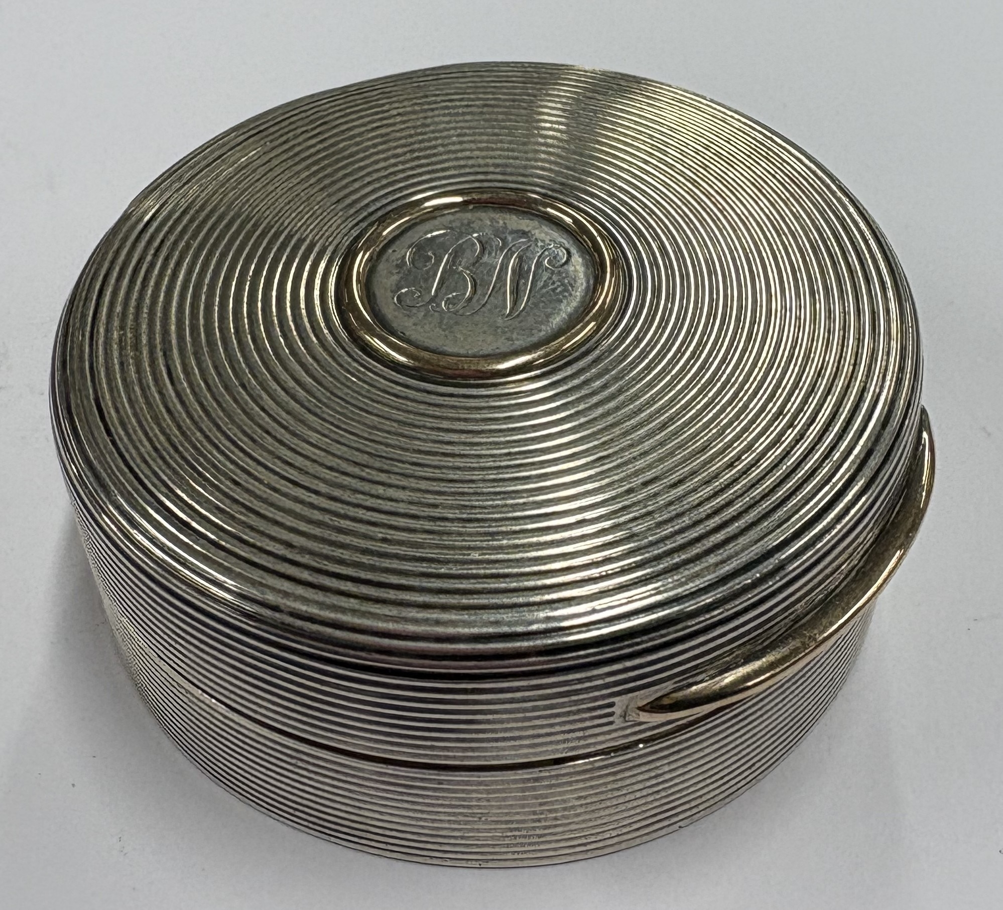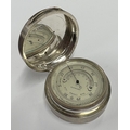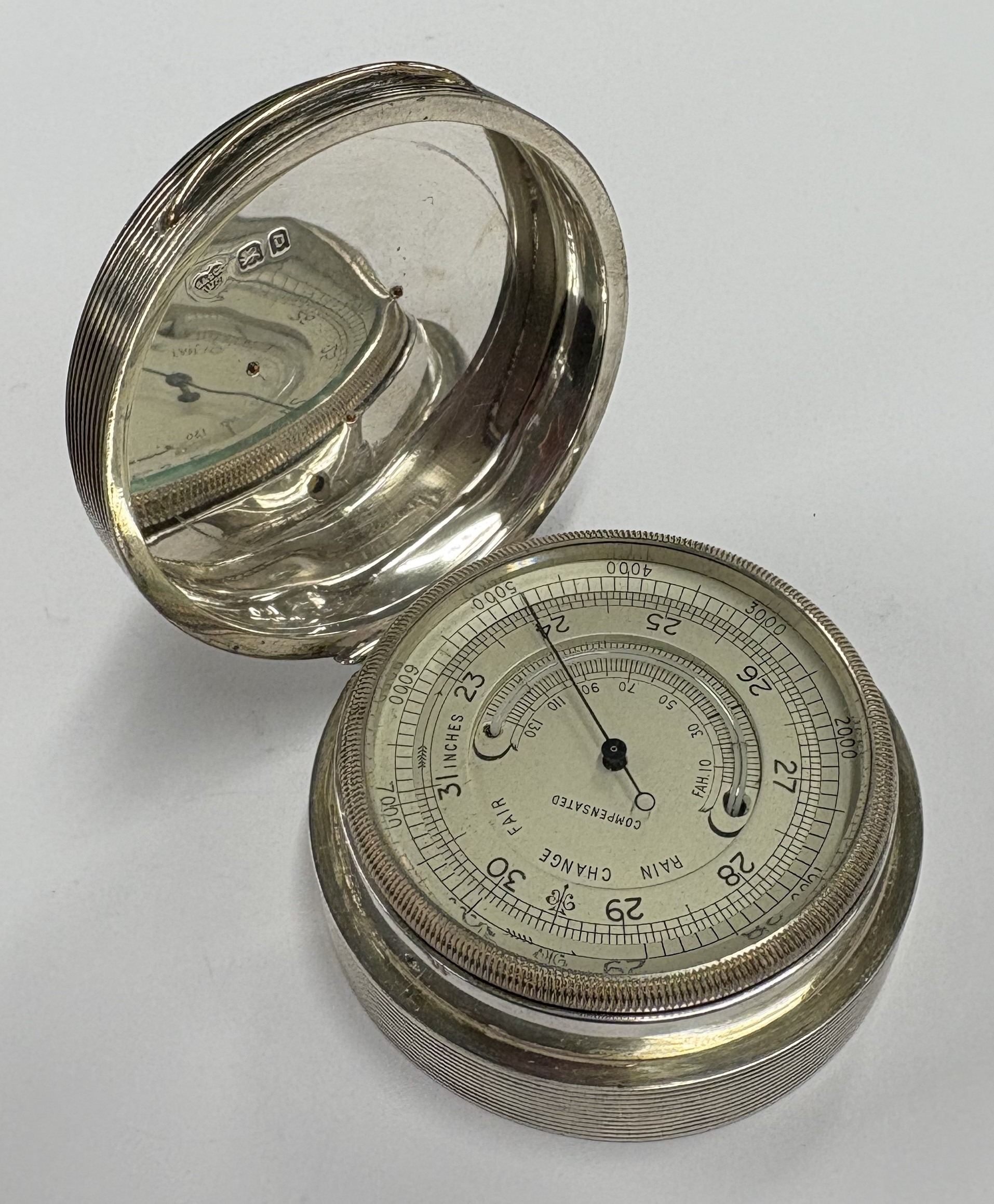 A heavy silver barometer with gold inlaid decoration. London 1929. By Goldsmiths. Approx. 323 grams of gross weight. Est. £400 - £600.