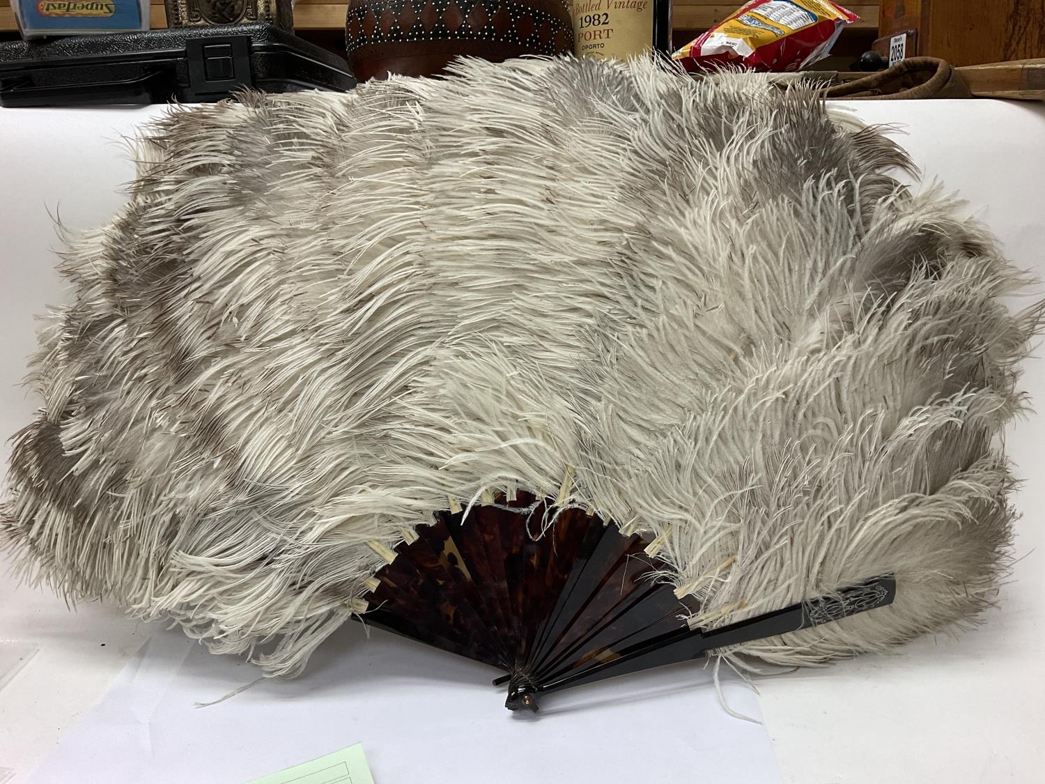 A tortoiseshell and ostrich feather hand fan.