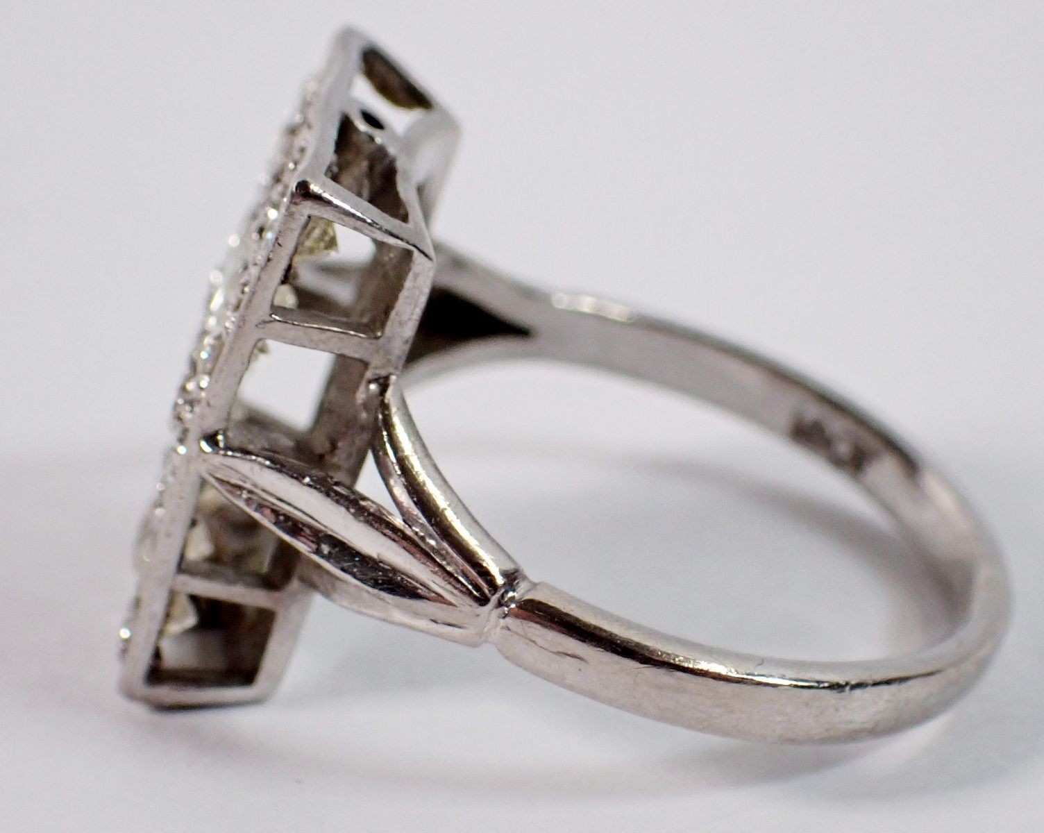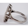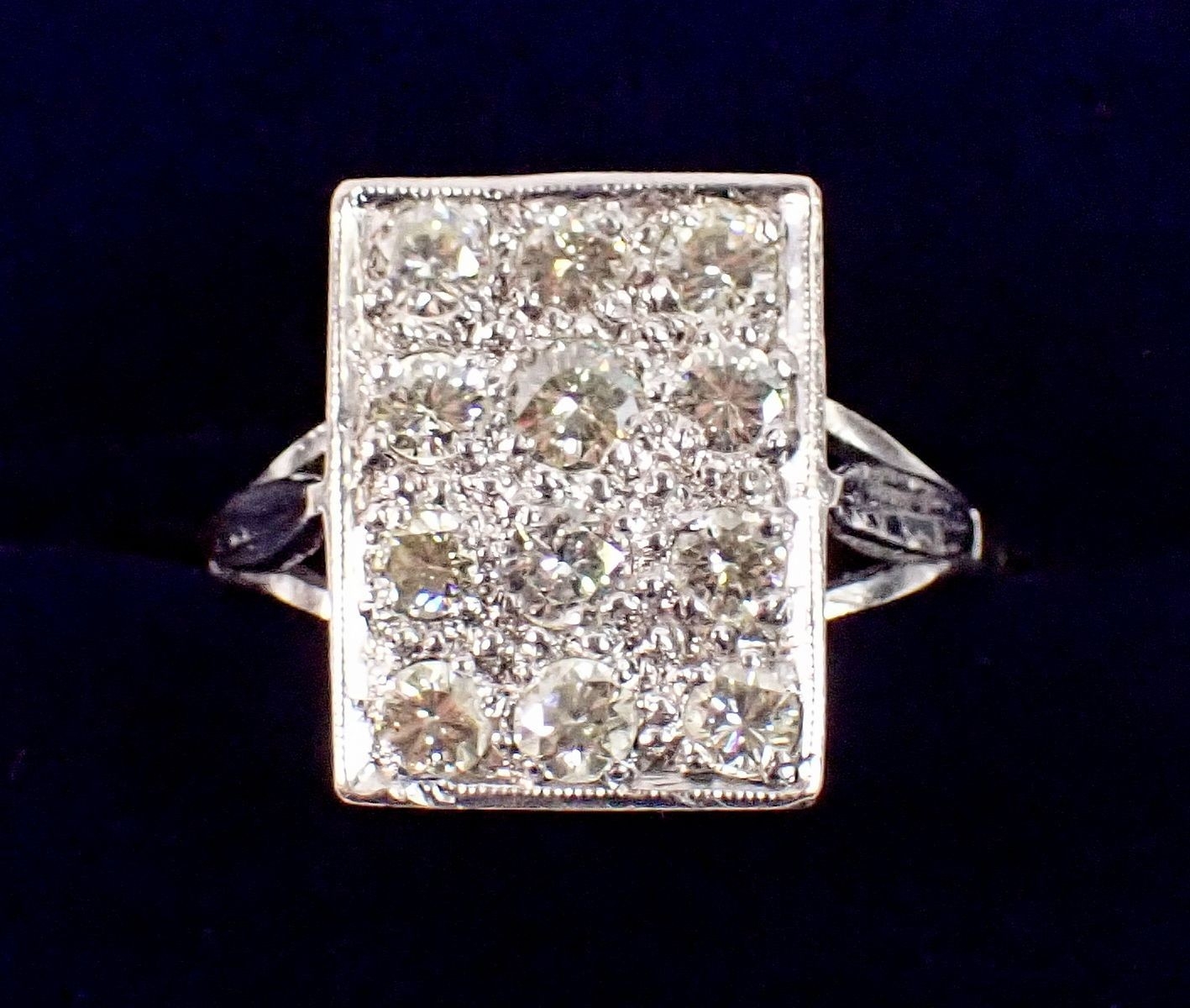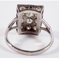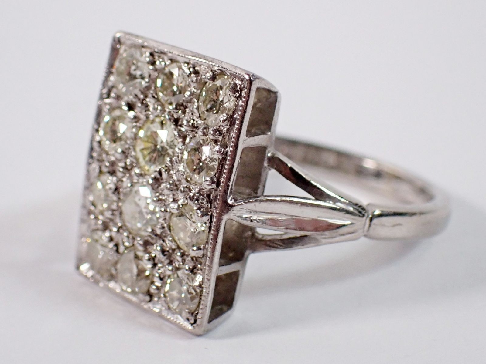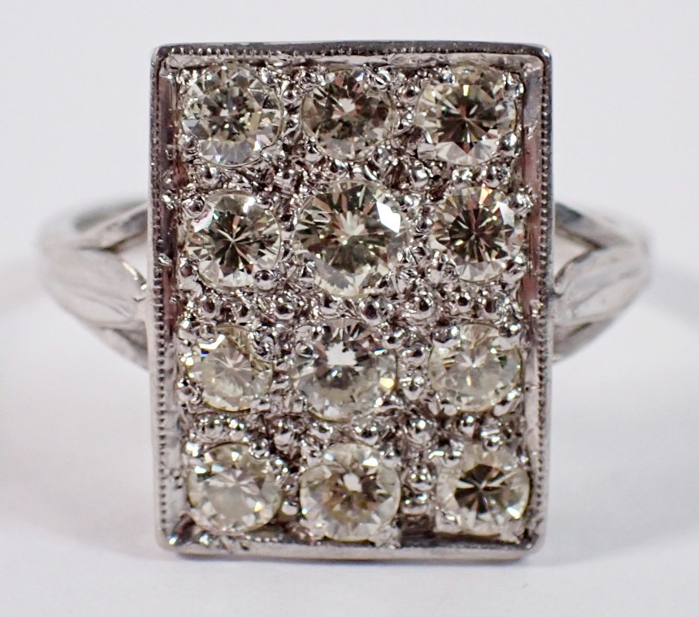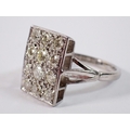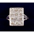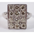 An 18 carat white gold ring with rectangular plaque set twelve diamonds, 11 x 7mm, size P to Q, 5.4g