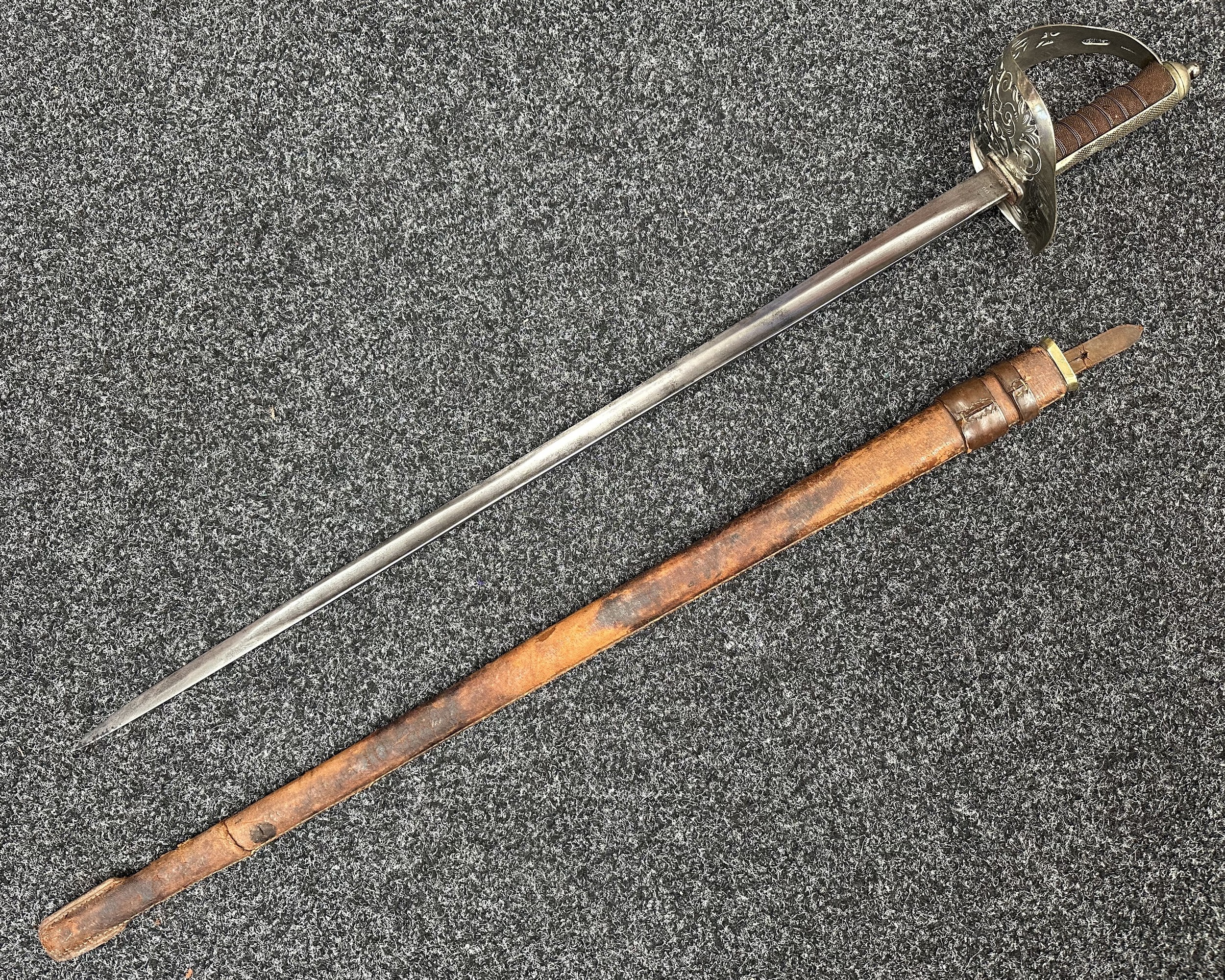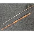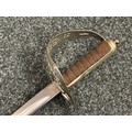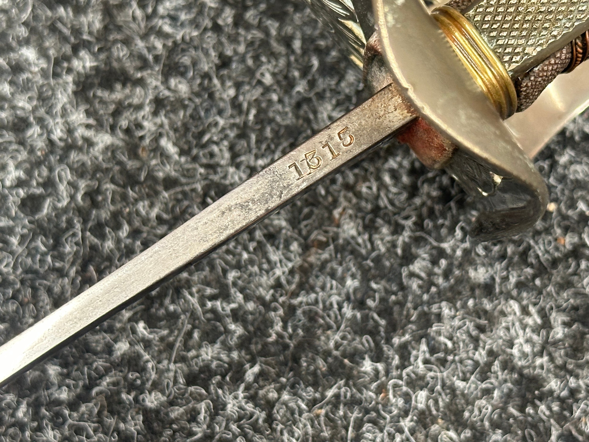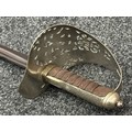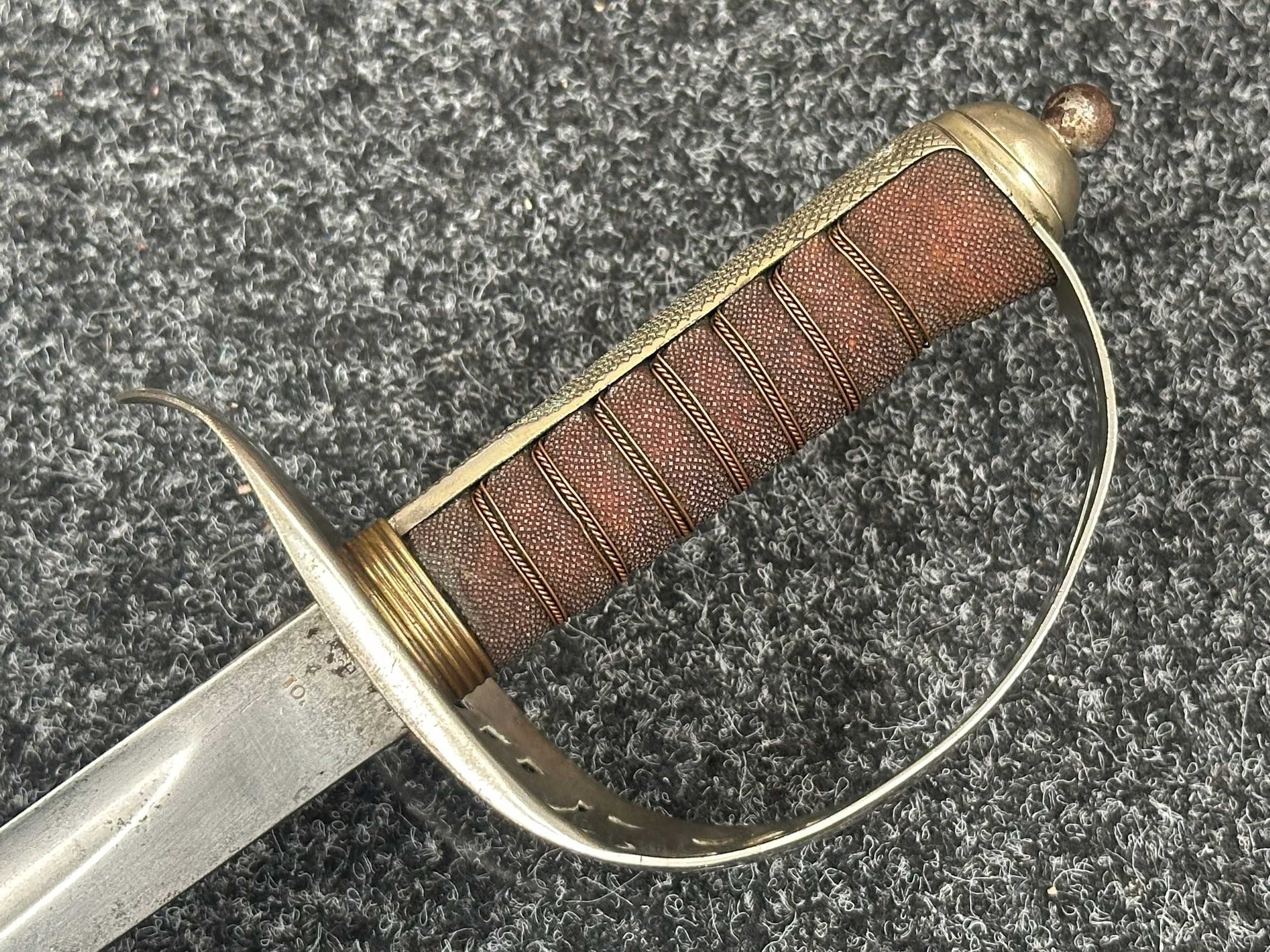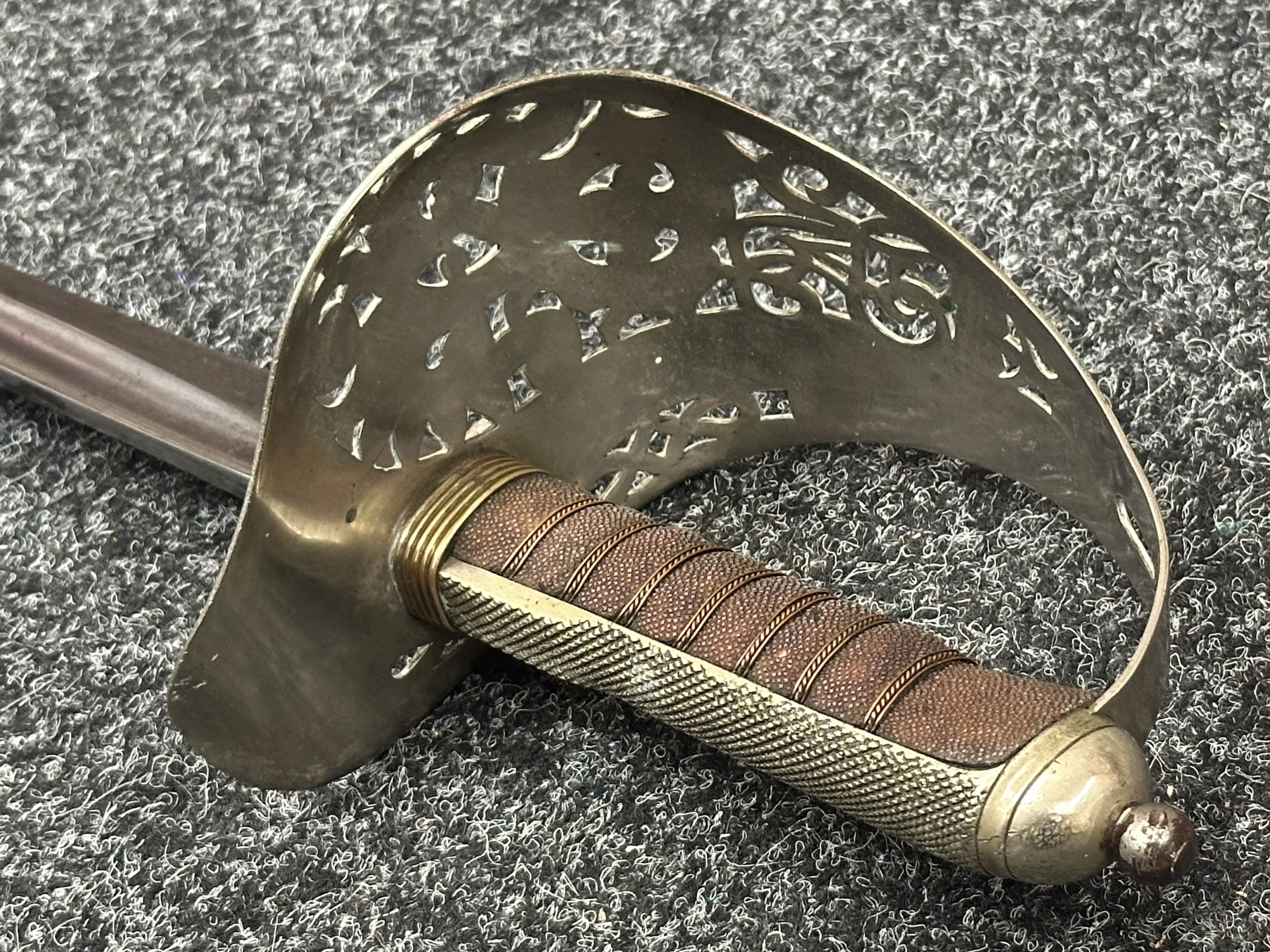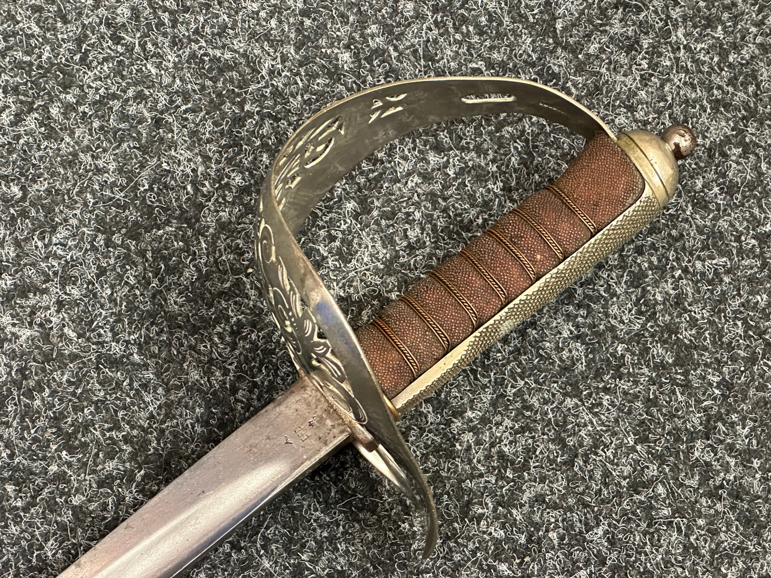 WW1 British GR V Officers 1897 Pattern Sword with plain single edged fullered blade 815mm in length, maker marked "Enfield". Spine of blade stamped "1315". Leather washer to blade. Guard marked "GRV" cypher. Wire bound Shagreen grip. Overall length 98cm. Complete with scabbard.