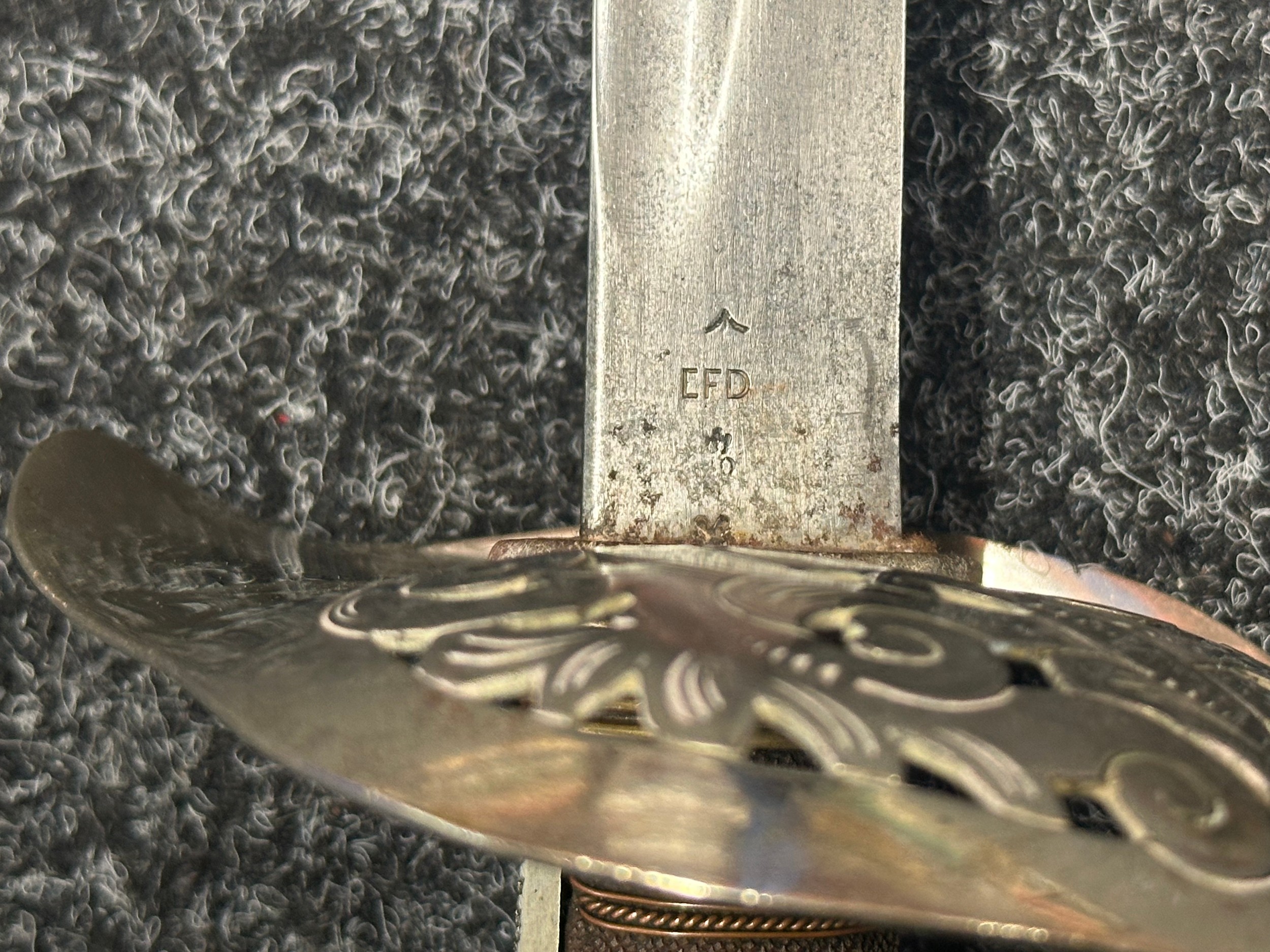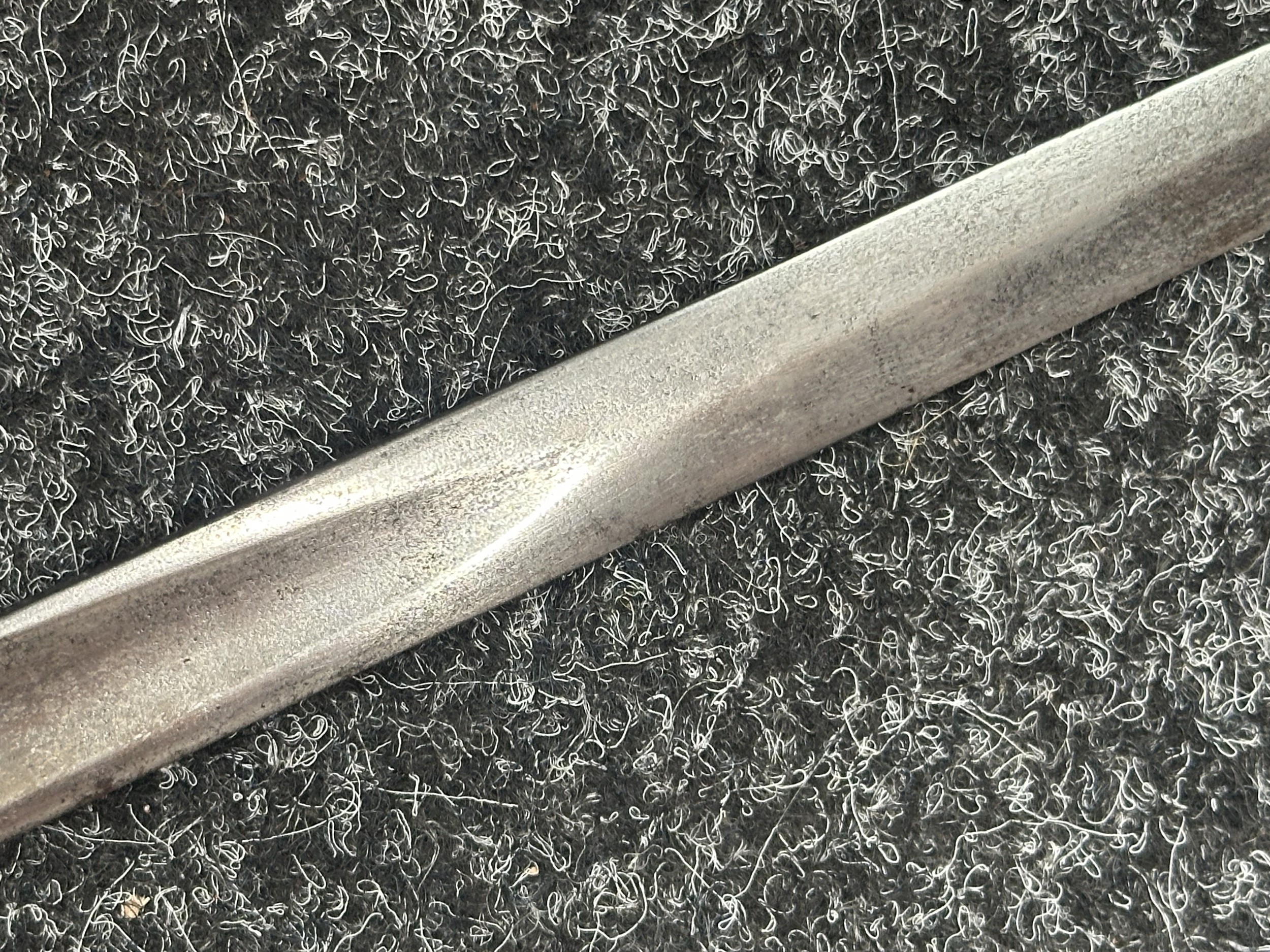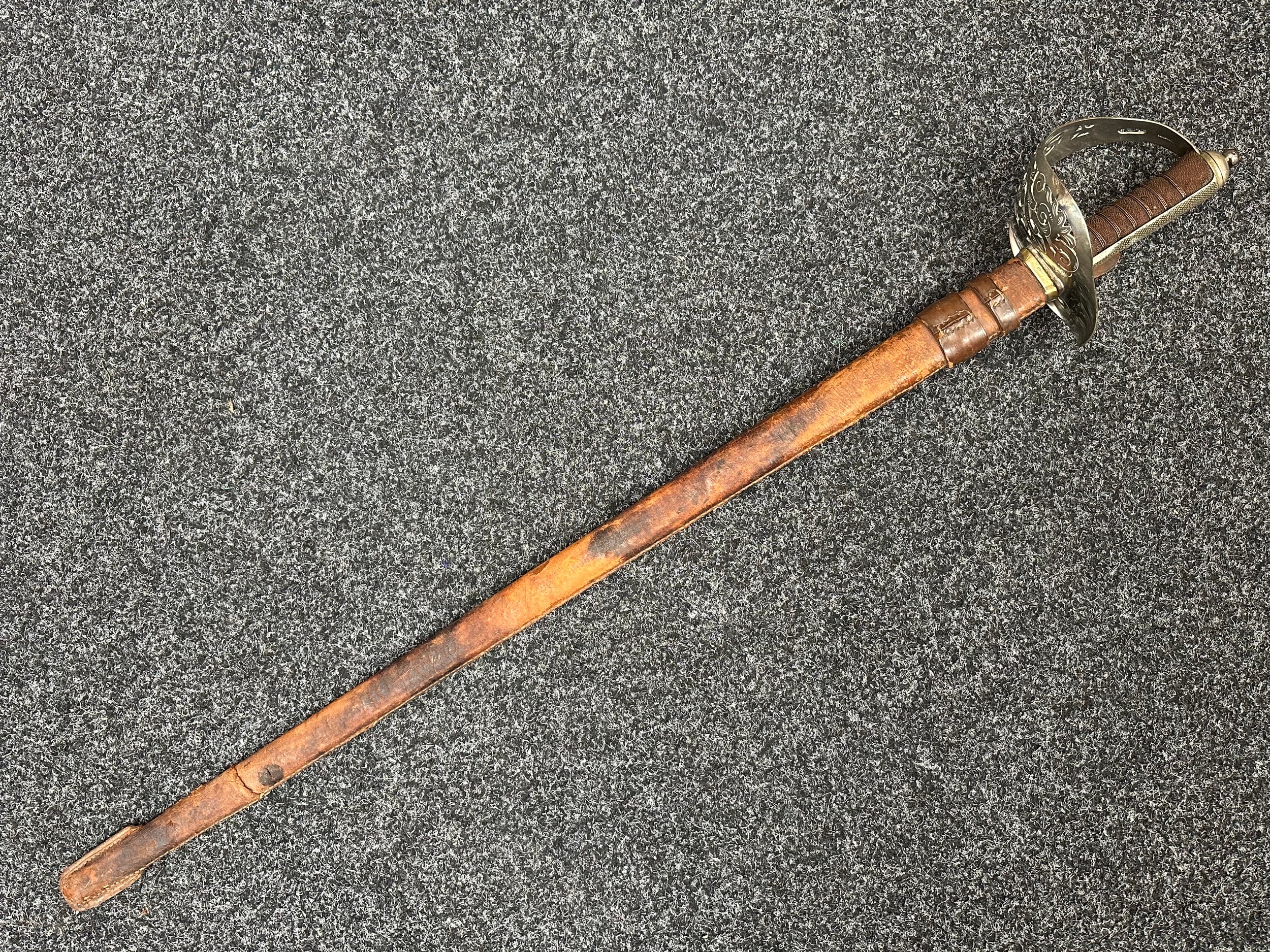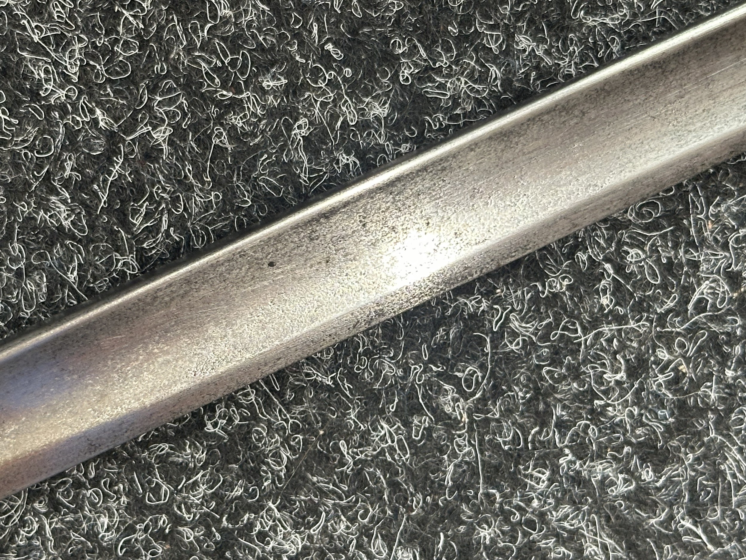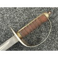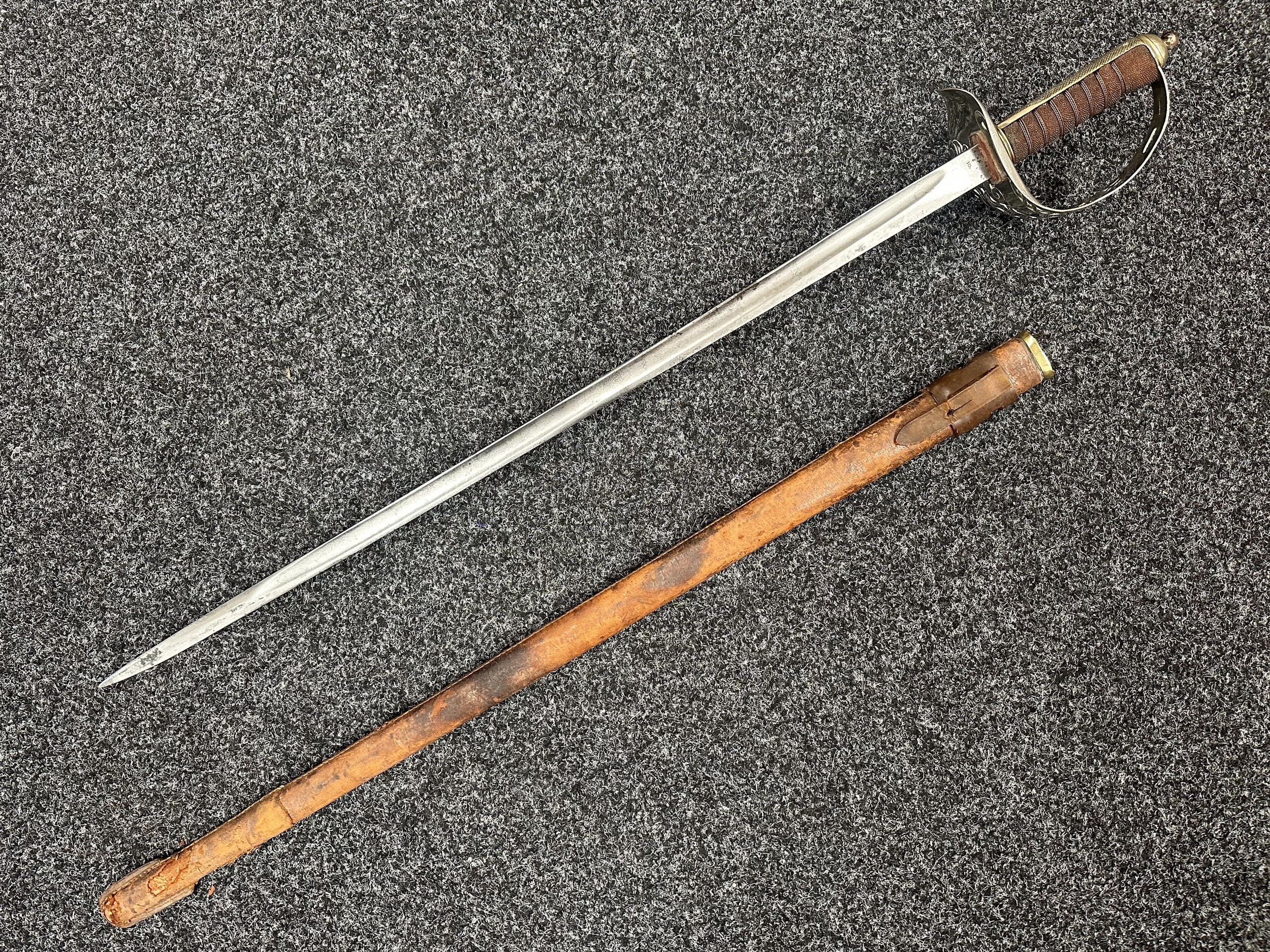 WW1 British GR V Officers 1897 Pattern Sword with plain single edged fullered blade 815mm in length, maker marked "Enfield". Spine of blade stamped "1315". Leather washer to blade. Guard marked "GRV" cypher. Wire bound Shagreen grip. Overall length 98cm. Complete with scabbard.