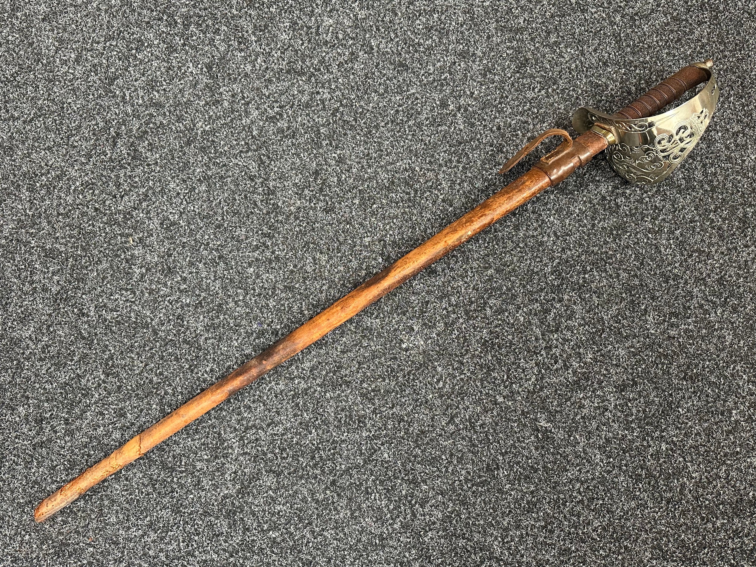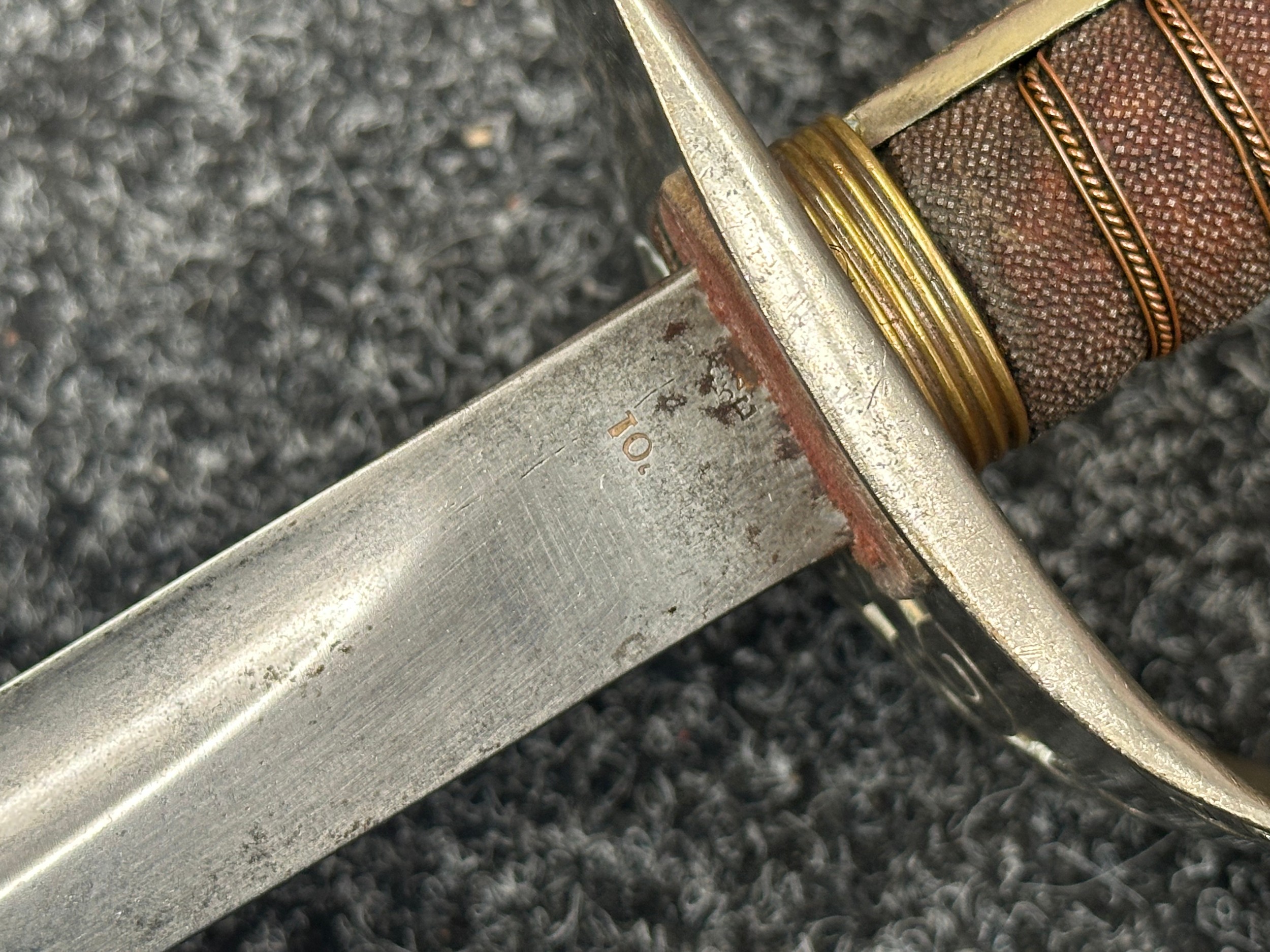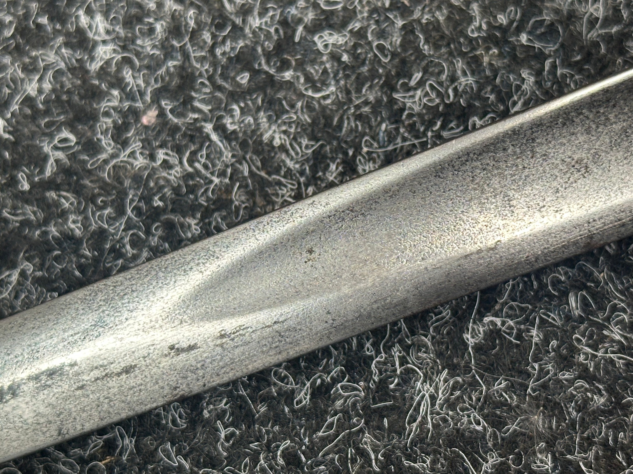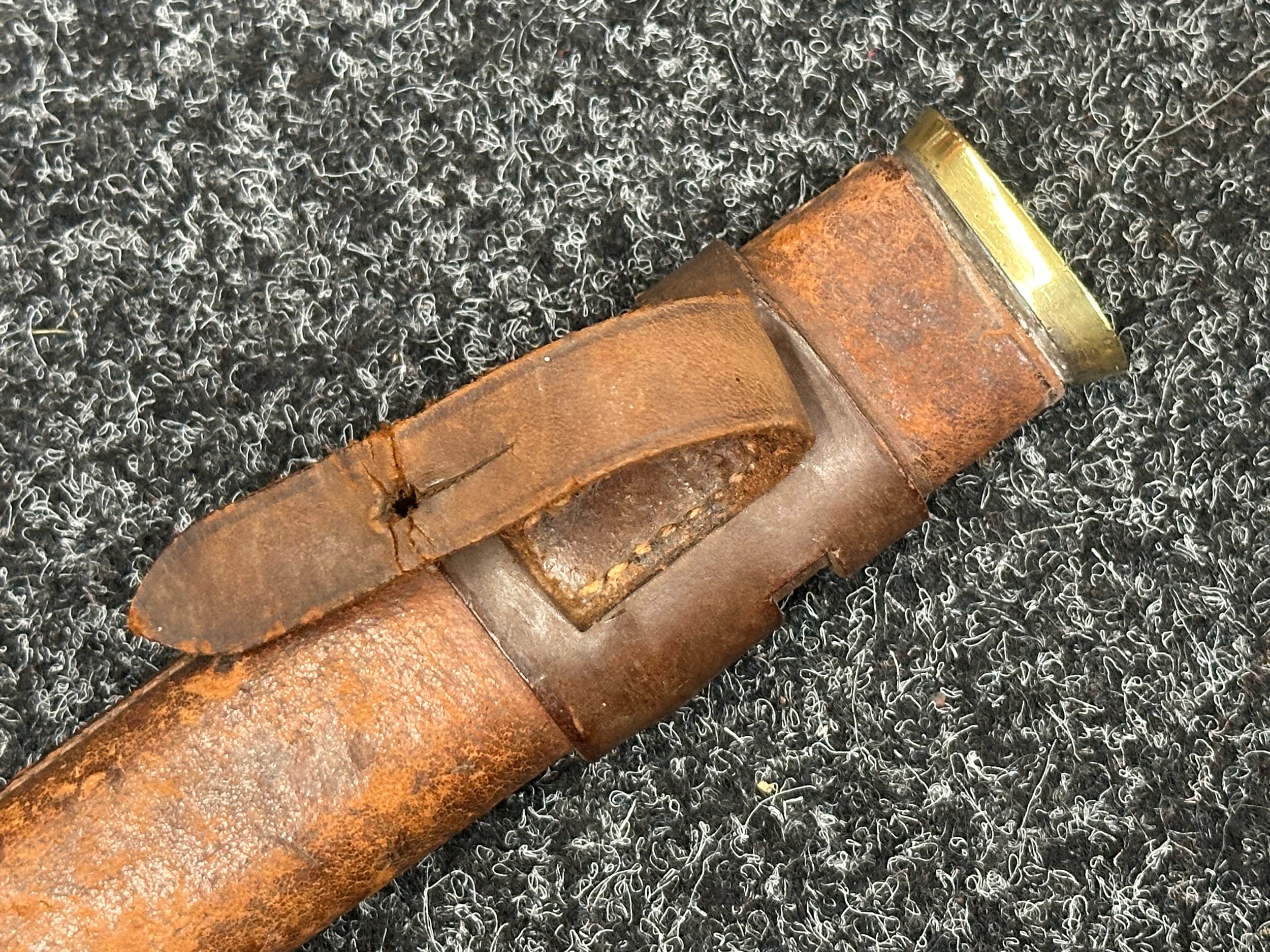 WW1 British GR V Officers 1897 Pattern Sword with plain single edged fullered blade 815mm in length, maker marked "Enfield". Spine of blade stamped "1315". Leather washer to blade. Guard marked "GRV" cypher. Wire bound Shagreen grip. Overall length 98cm. Complete with scabbard.