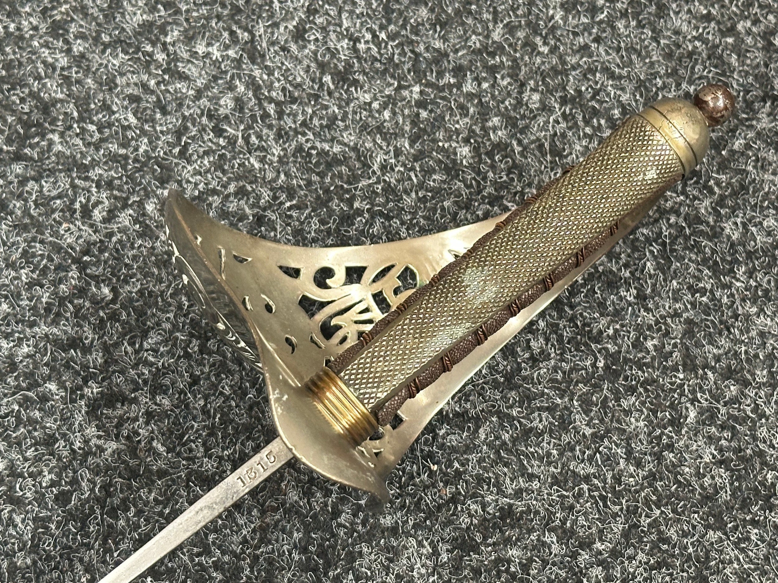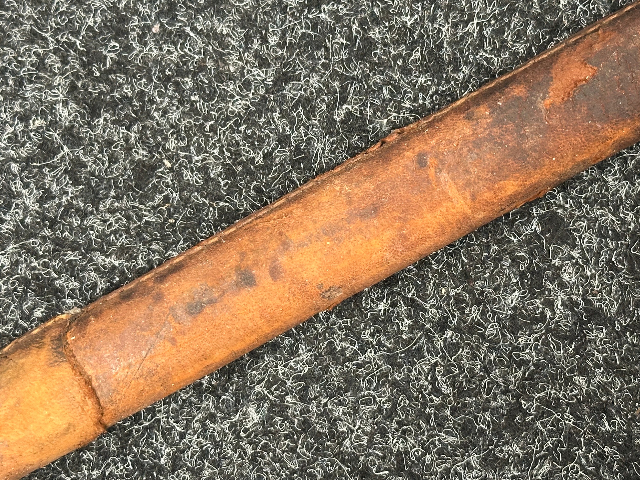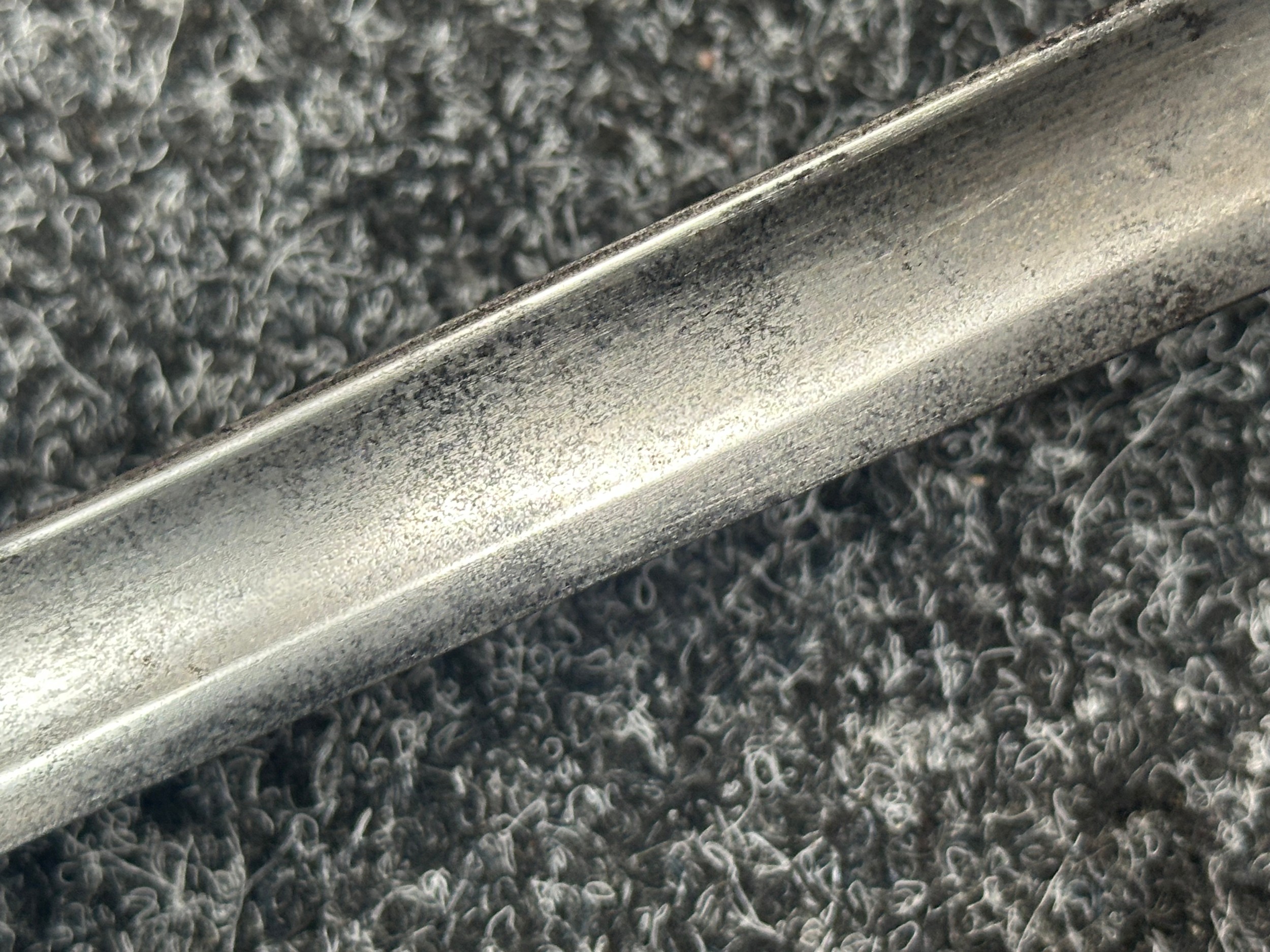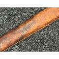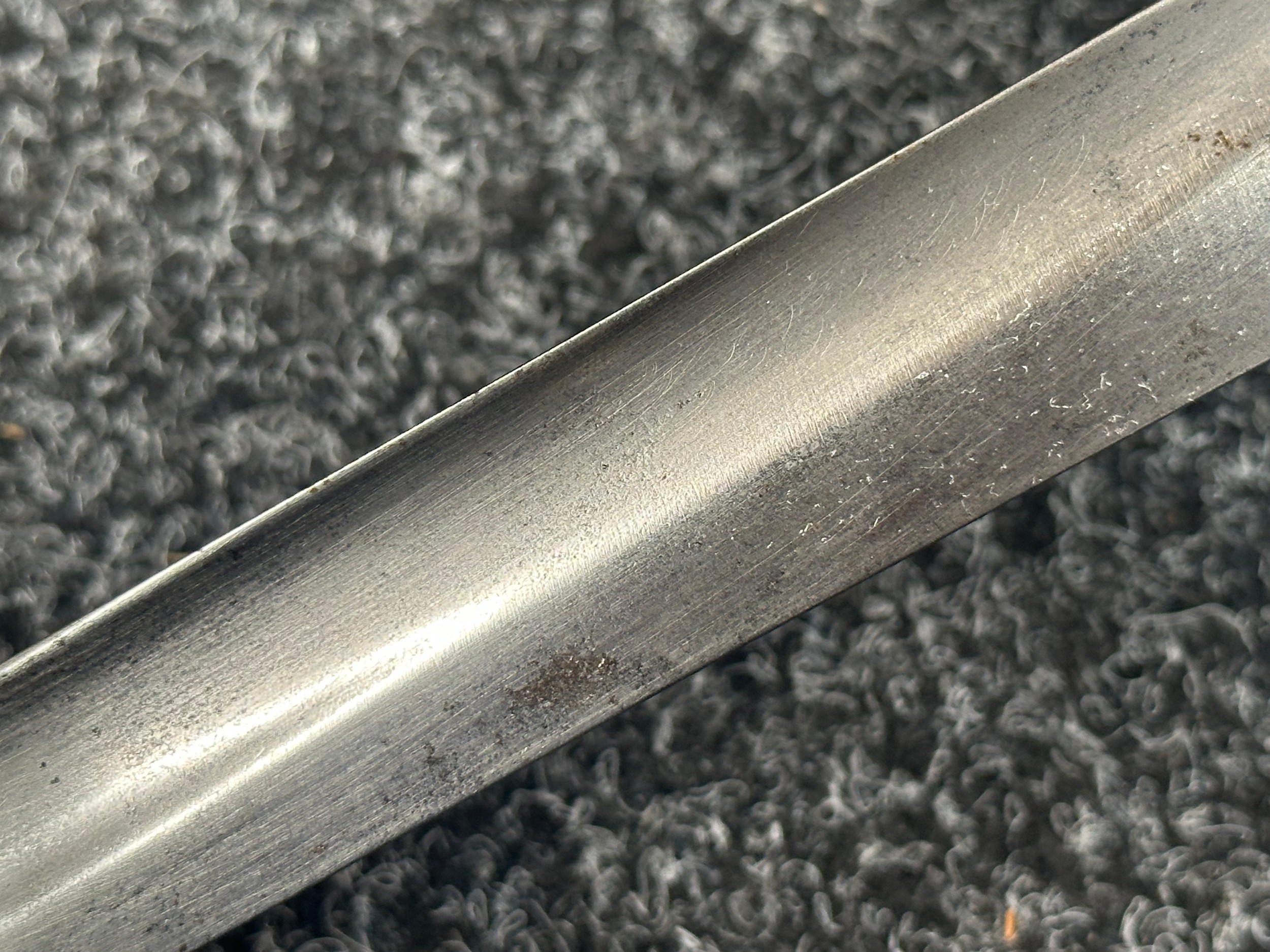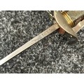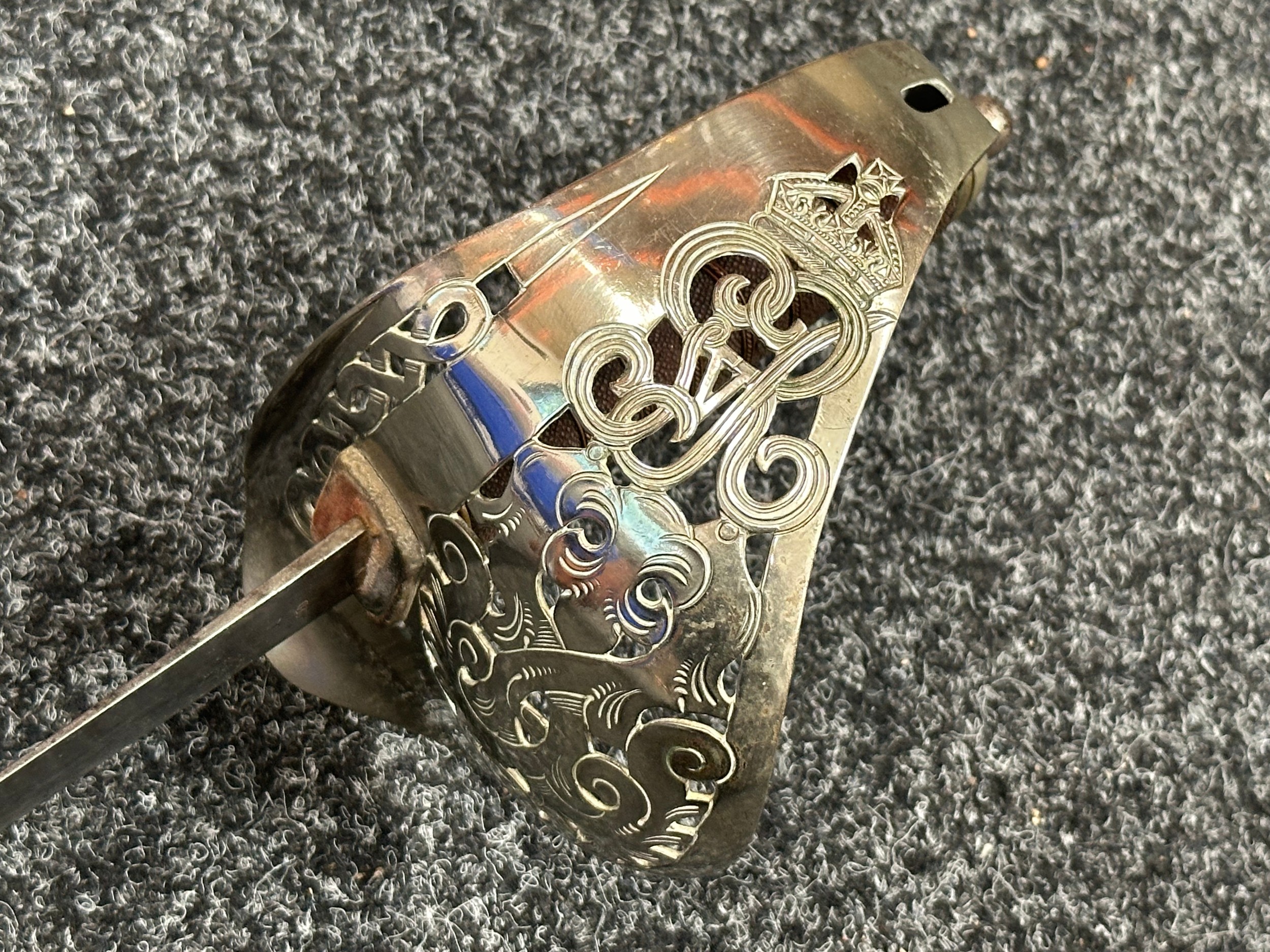 WW1 British GR V Officers 1897 Pattern Sword with plain single edged fullered blade 815mm in length, maker marked "Enfield". Spine of blade stamped "1315". Leather washer to blade. Guard marked "GRV" cypher. Wire bound Shagreen grip. Overall length 98cm. Complete with scabbard.