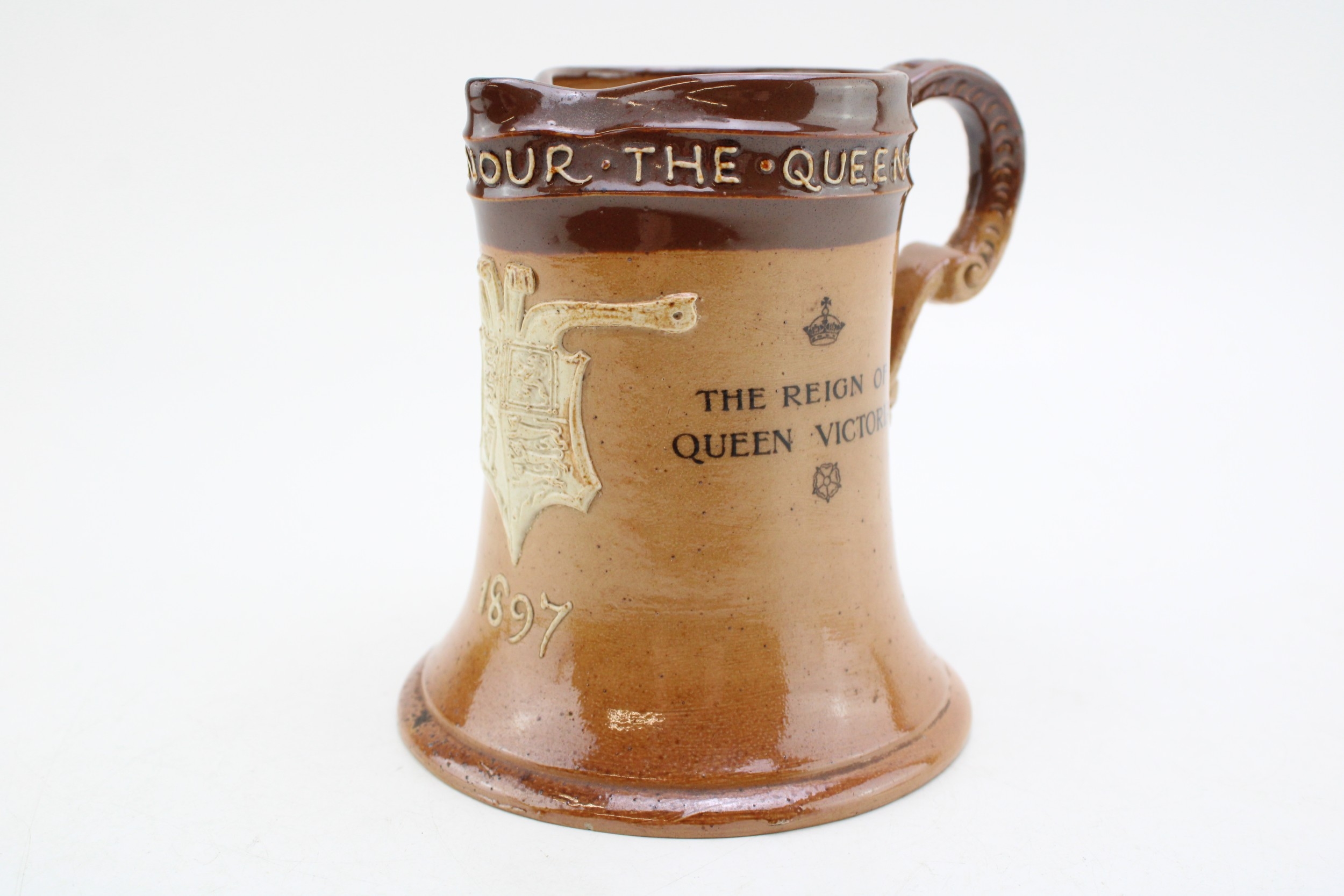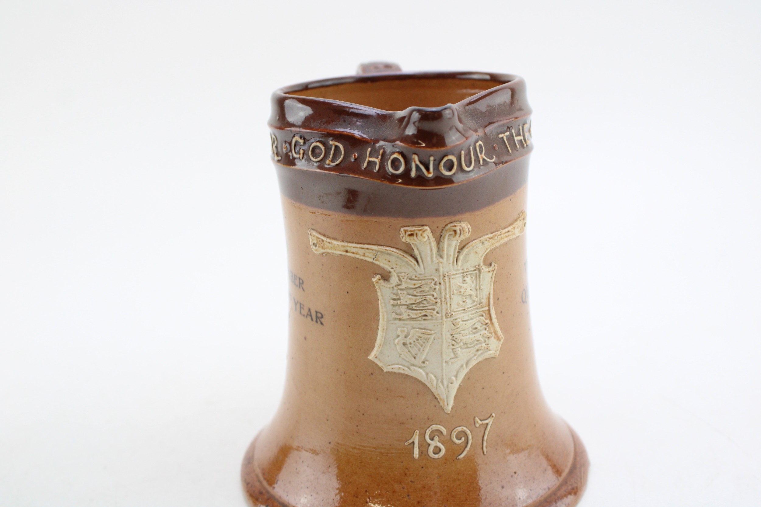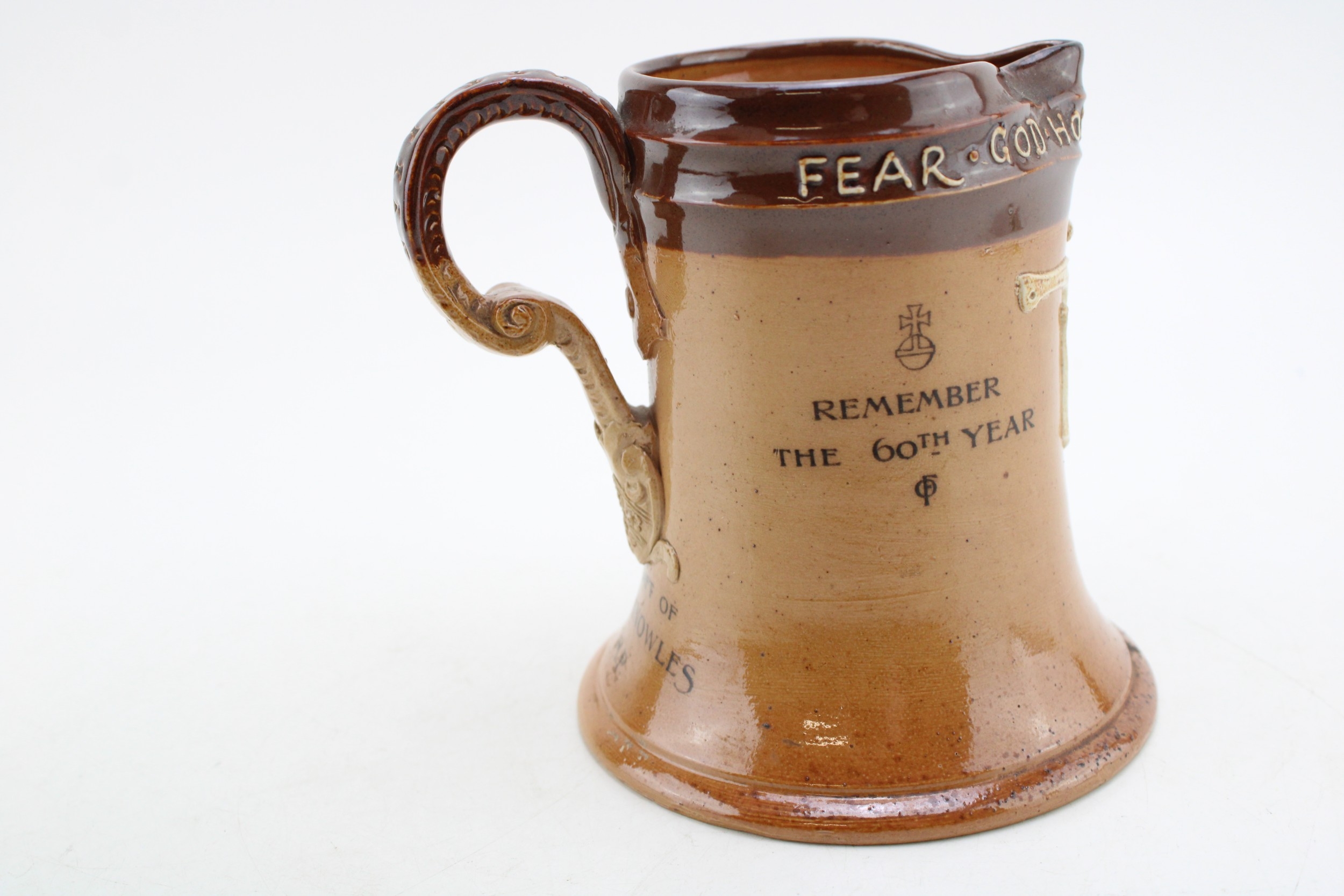 Doulton Lambeth stoneware jug 'the gift of Lees Knowles MP', dated 1897, 17cm tall.