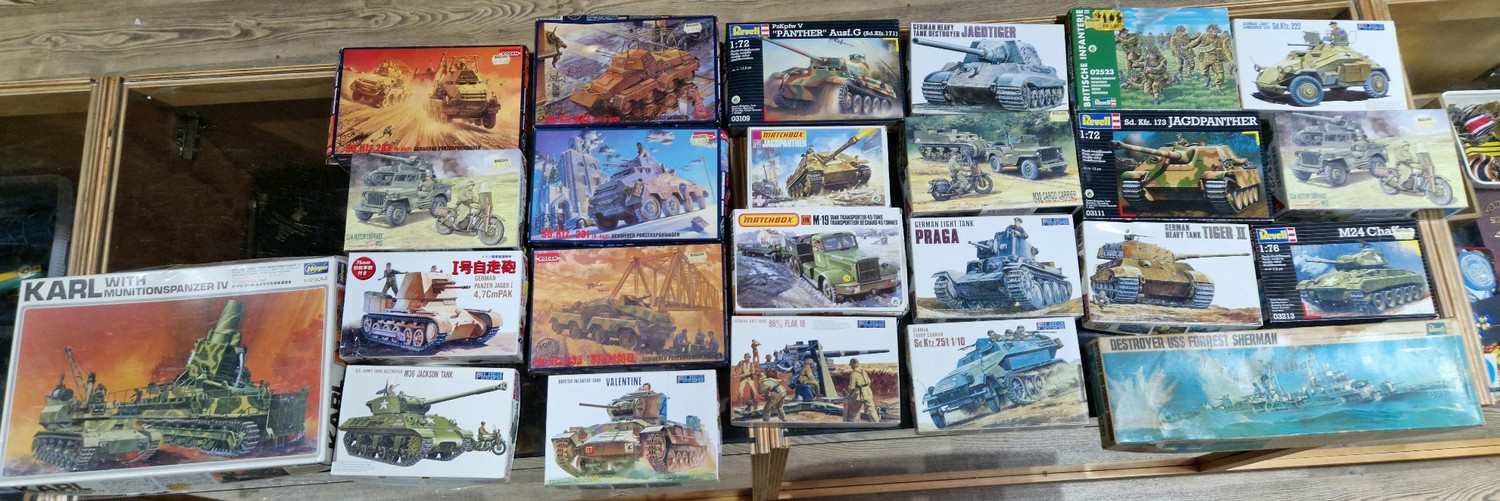 A box of approx. 24 assorted unused mainly tank model kits to include Matchbox, Revell, Hasegawa, Fujimi & Roden etc.