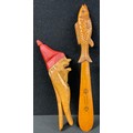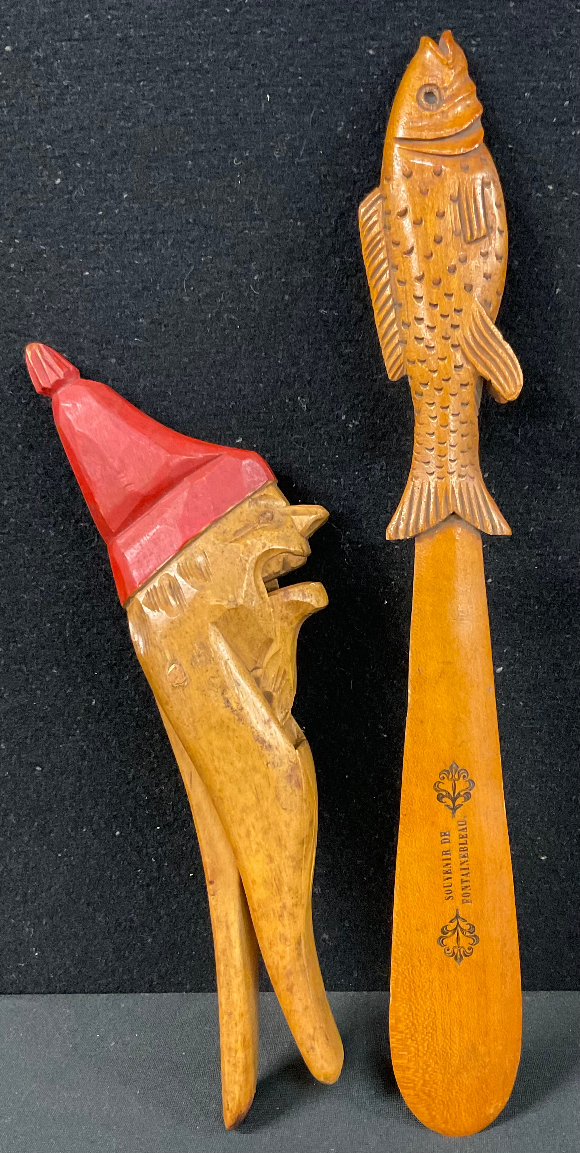 Treen - a novelty wooden nutcracker, as a grotesque gnome or dwarf, 19.5cm long; another, a fish page turner inscribed ‘souvenir de Fountainbleau’, 26cm long (2)