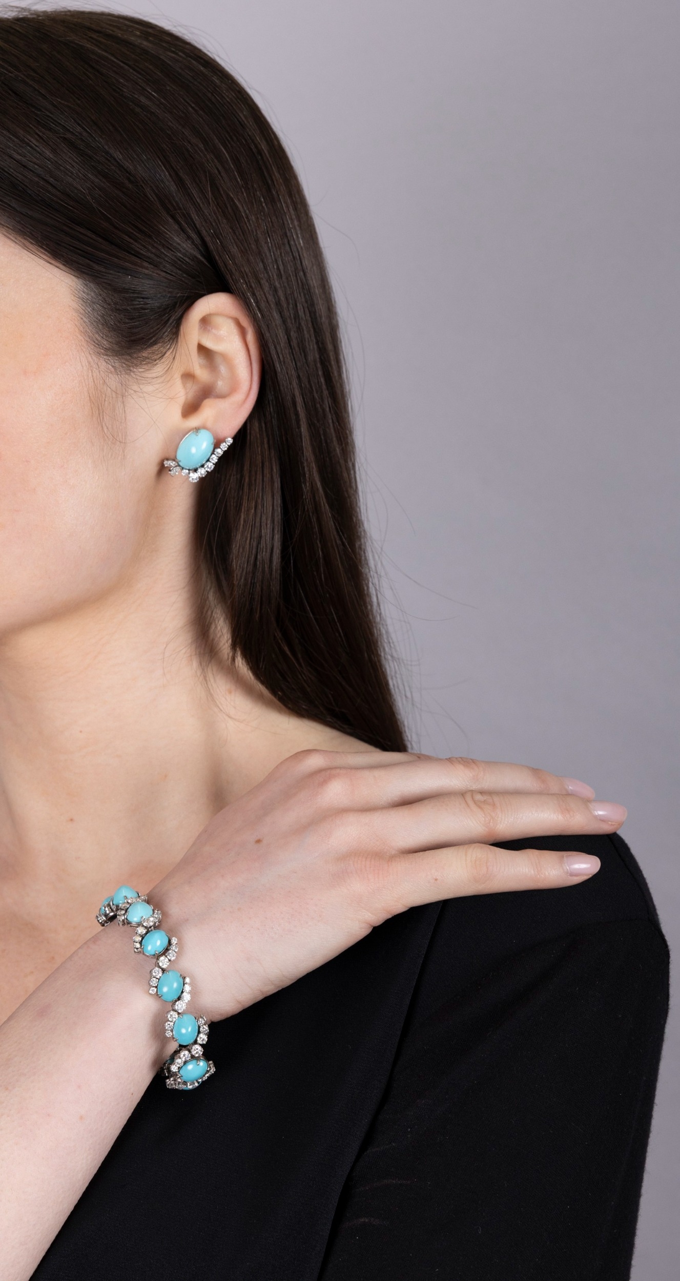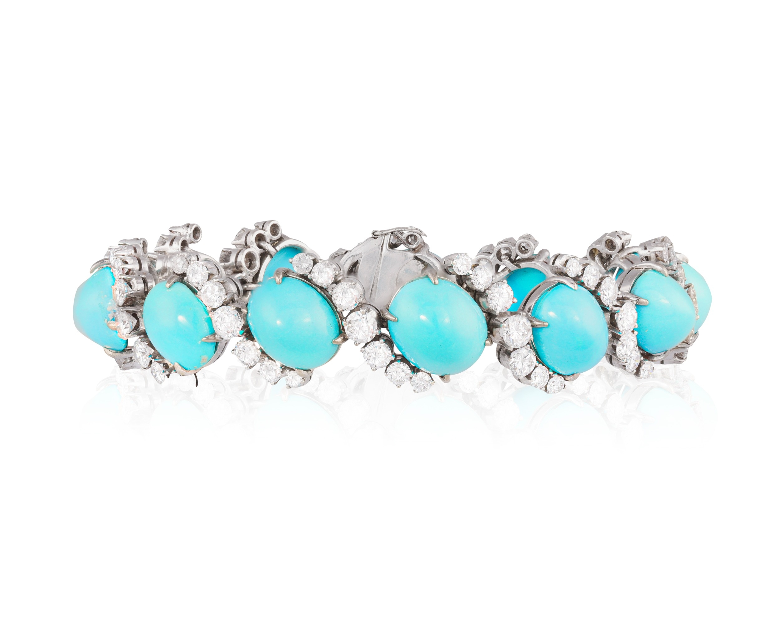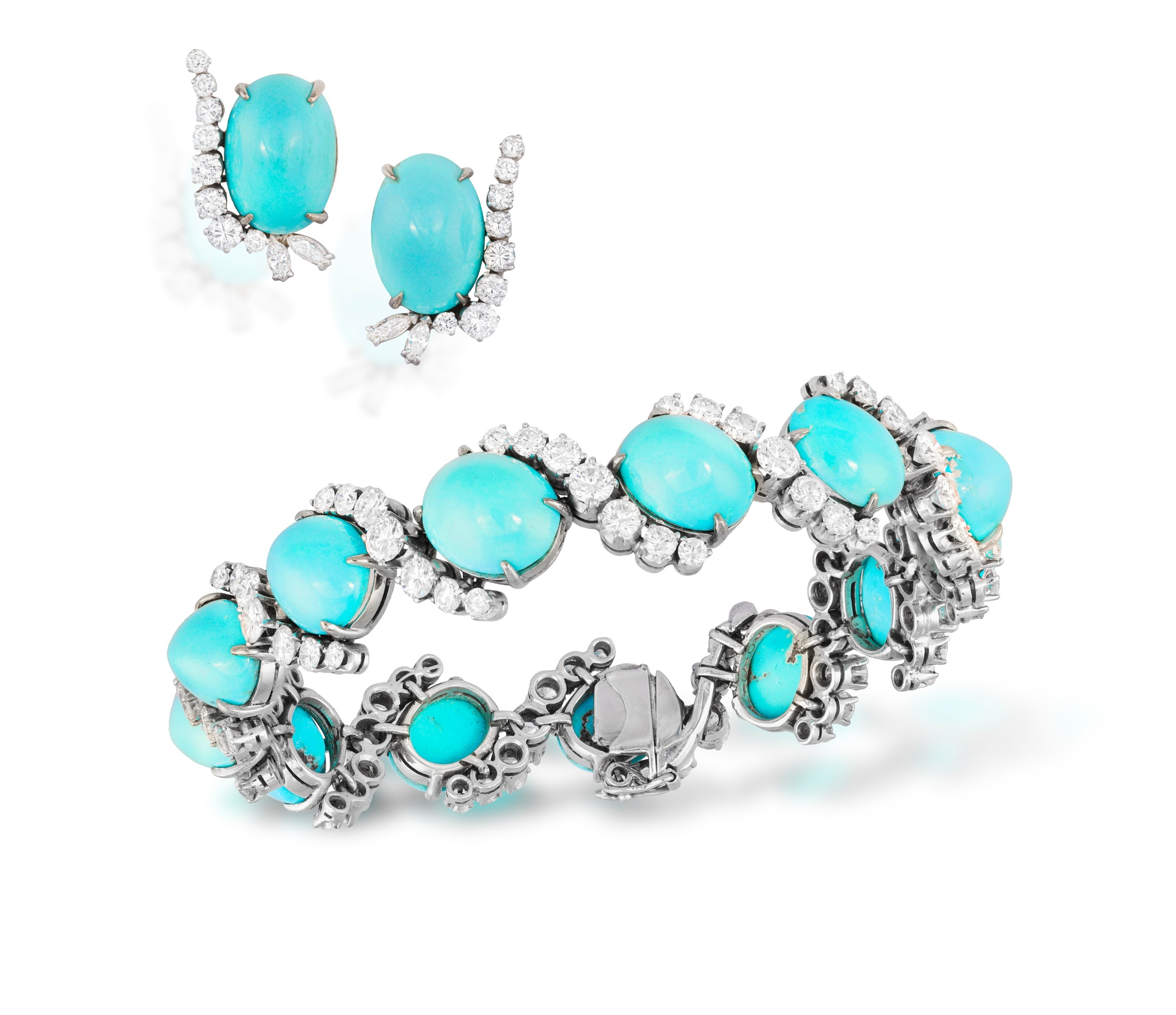 A TURQUOISE AND DIAMOND BRACELET, WITH MATCHING EARCLIPS, CIRCA 1960 Set throughout with oval-shaped turquoise cabochons, claw-set and flanked between a cluster of brilliant-cut diamonds, mounted in 18K gold, diamonds approximately 6.00cts total, French import mark, length approximately 18.5cm; together with a pair of earclips of similar style, mounted in 18K gold, diamonds approximately 1.20cts total, French import marks, length 2.5cm