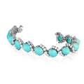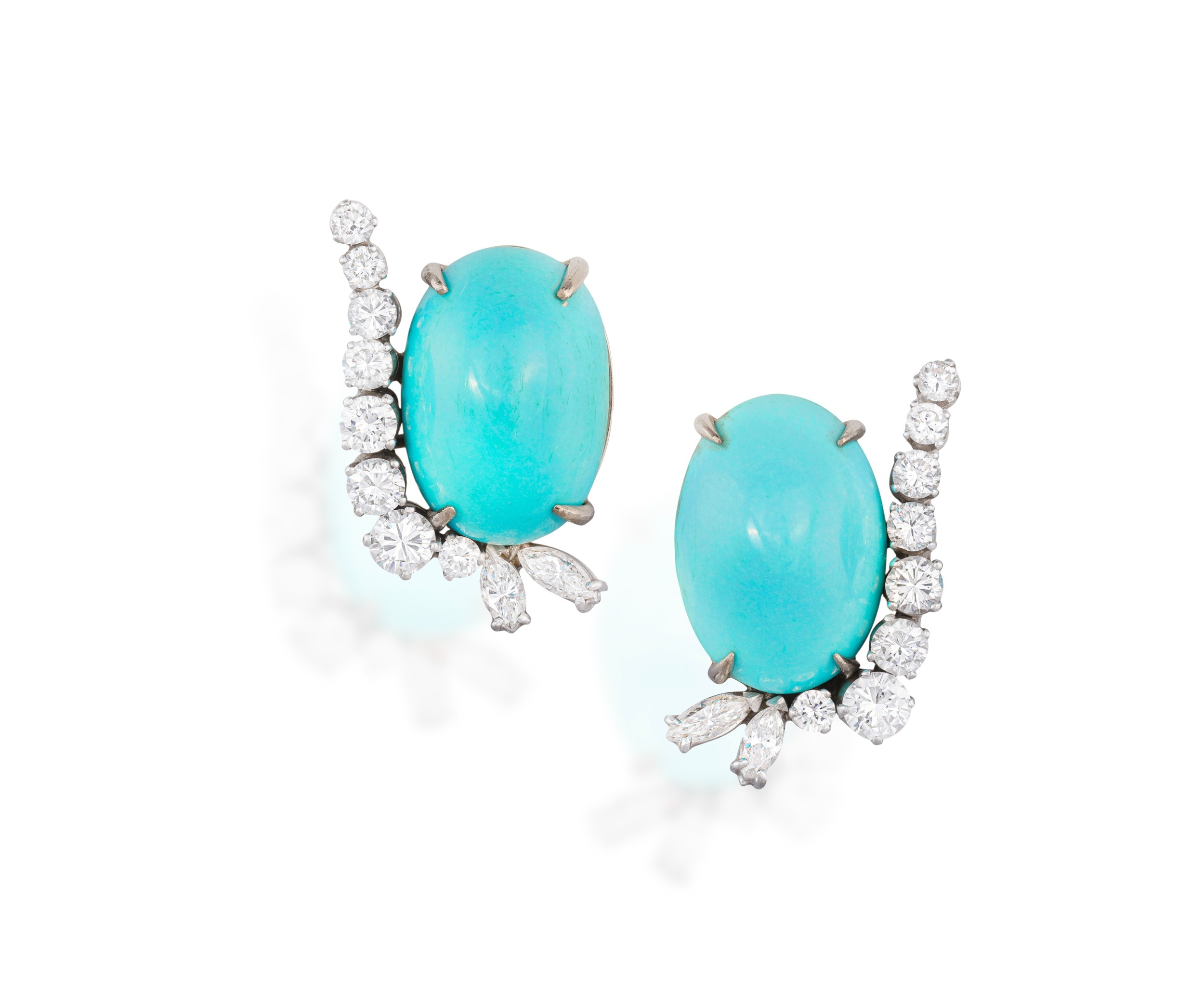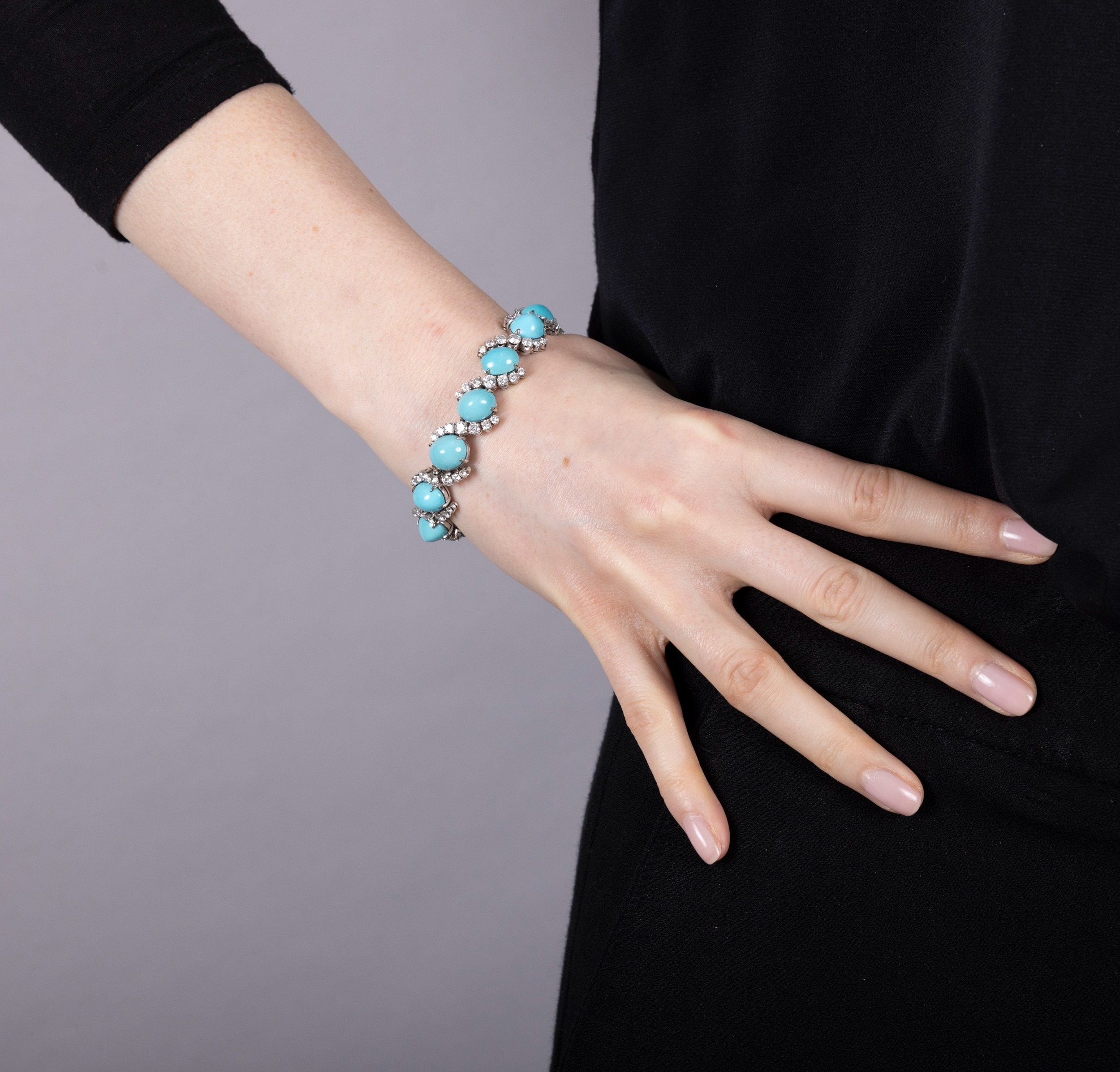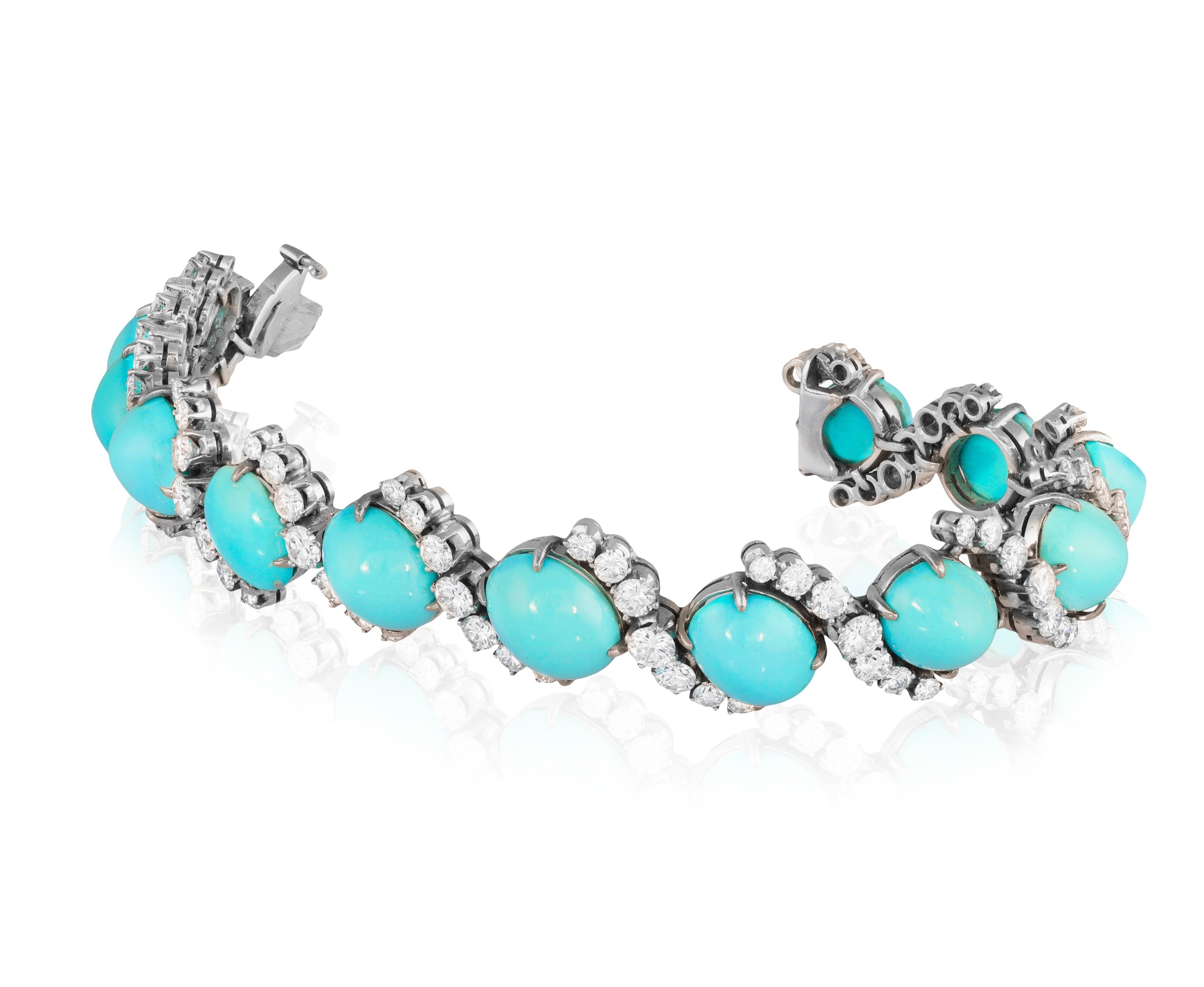 A TURQUOISE AND DIAMOND BRACELET, WITH MATCHING EARCLIPS, CIRCA 1960 Set throughout with oval-shaped turquoise cabochons, claw-set and flanked between a cluster of brilliant-cut diamonds, mounted in 18K gold, diamonds approximately 6.00cts total, French import mark, length approximately 18.5cm; together with a pair of earclips of similar style, mounted in 18K gold, diamonds approximately 1.20cts total, French import marks, length 2.5cm