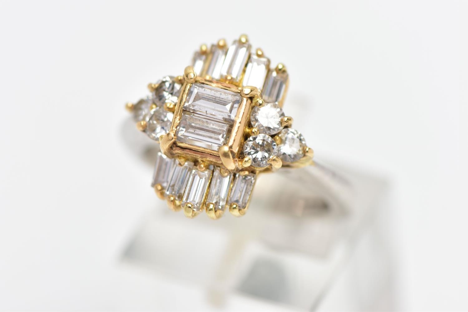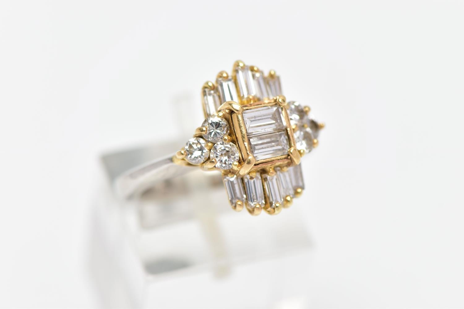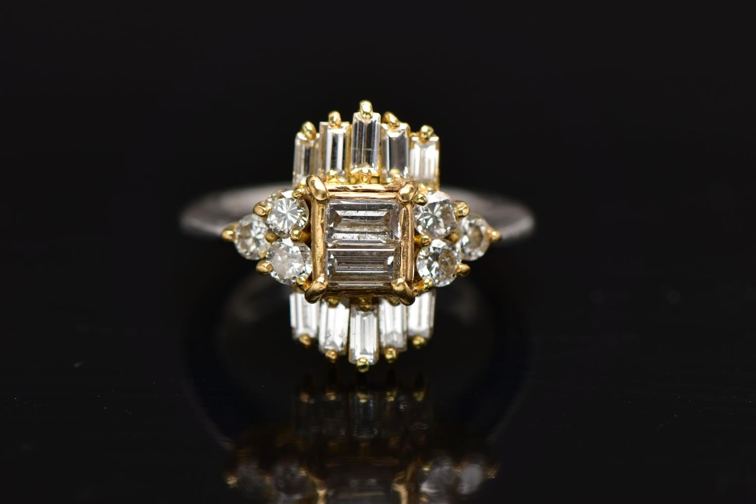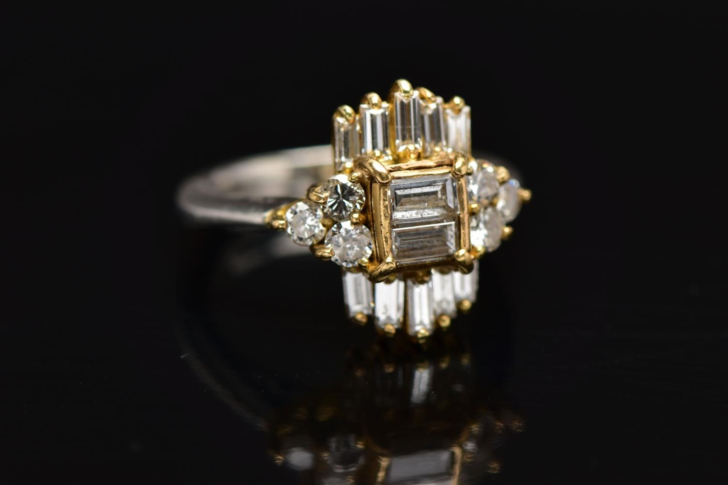A MODERN DIAMOND CLUSTER RING, set with two principal baguette cut diamonds, graduating baguette cut diamond sides and round brilliant cut diamond trefoil shoulders, ring size J, estimated total diamond weight 1.38cts, colour assessed as H-I, clarity assessed as SI-I2, hallmarked platinum Birmingham, also stamped 18ct, approximate gross weight 8.0 grams (Condition report: overall condition good, diamonds bright, lively and well matched, some with minor chips, yellow gold settings, platinum shank)