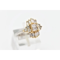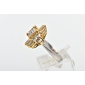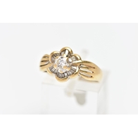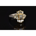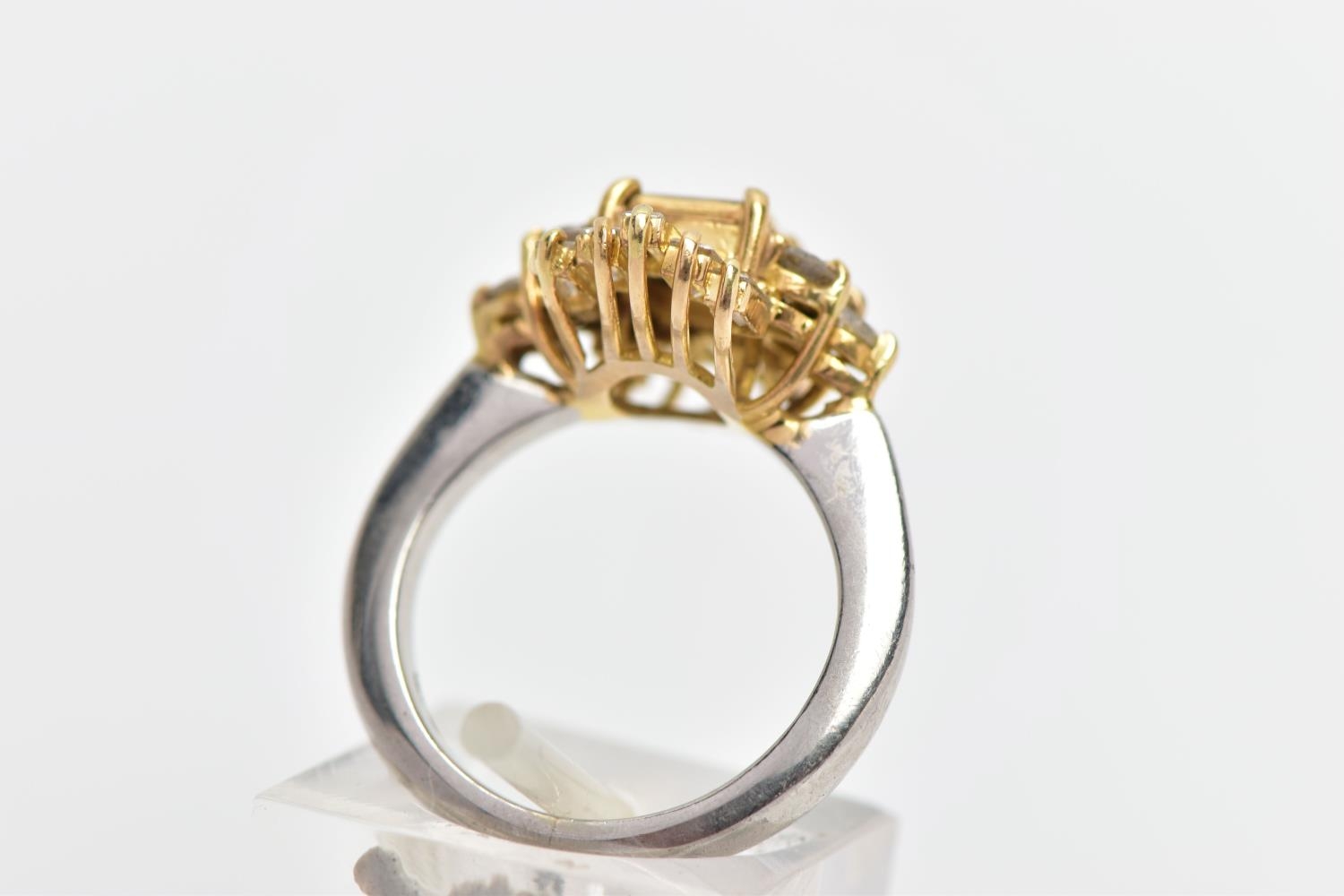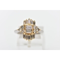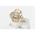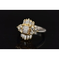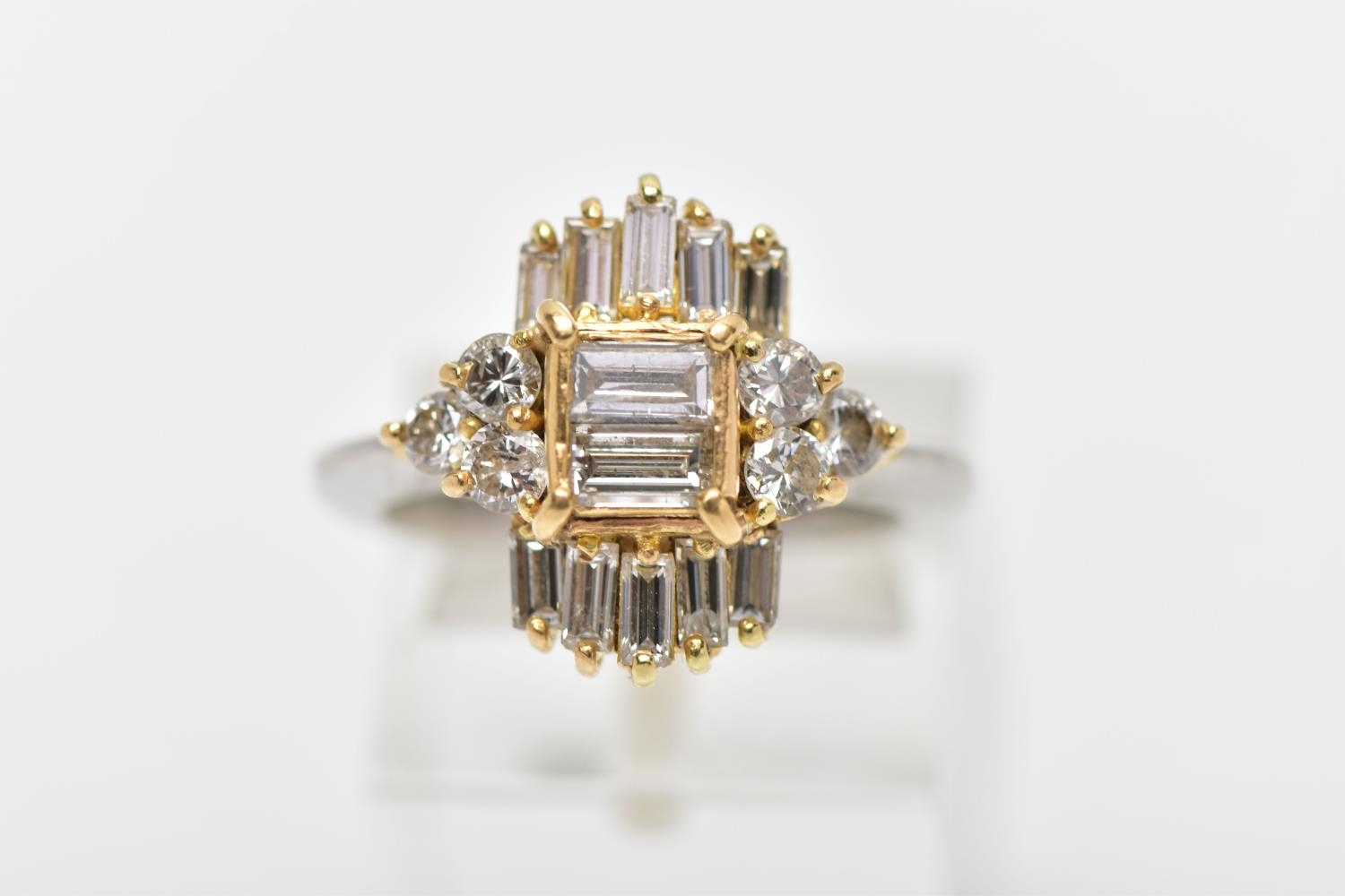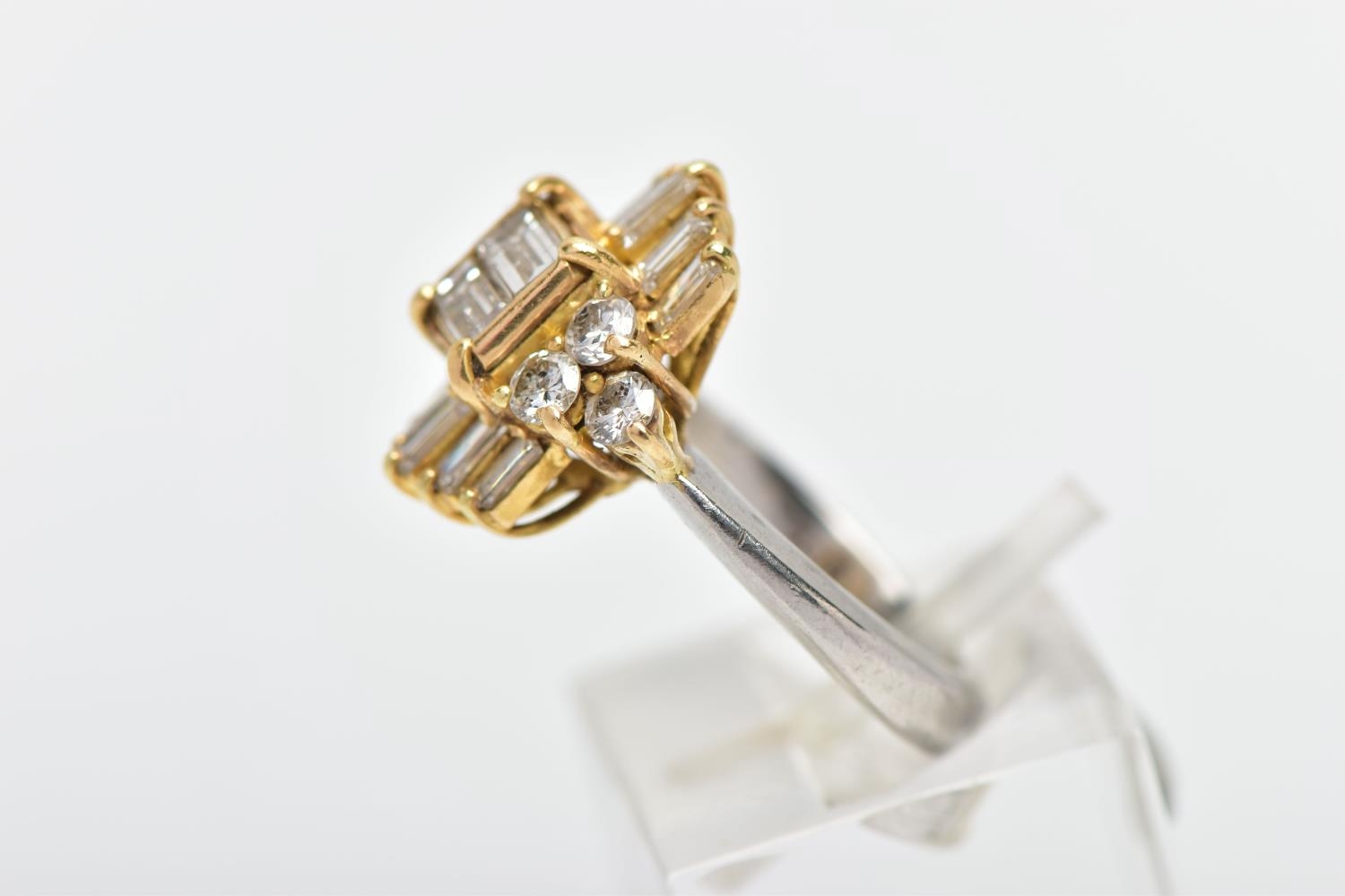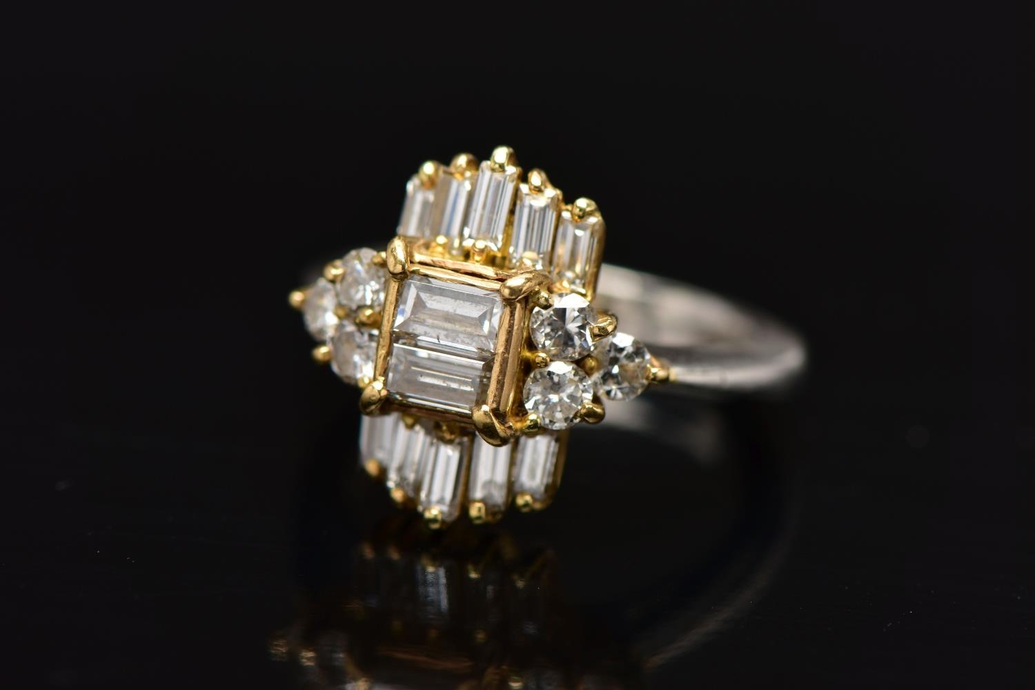A MODERN DIAMOND CLUSTER RING, set with two principal baguette cut diamonds, graduating baguette cut diamond sides and round brilliant cut diamond trefoil shoulders, ring size J, estimated total diamond weight 1.38cts, colour assessed as H-I, clarity assessed as SI-I2, hallmarked platinum Birmingham, also stamped 18ct, approximate gross weight 8.0 grams (Condition report: overall condition good, diamonds bright, lively and well matched, some with minor chips, yellow gold settings, platinum shank)