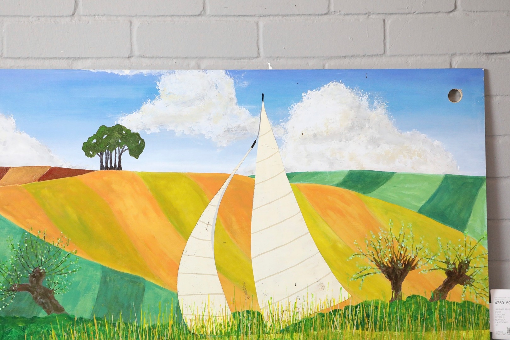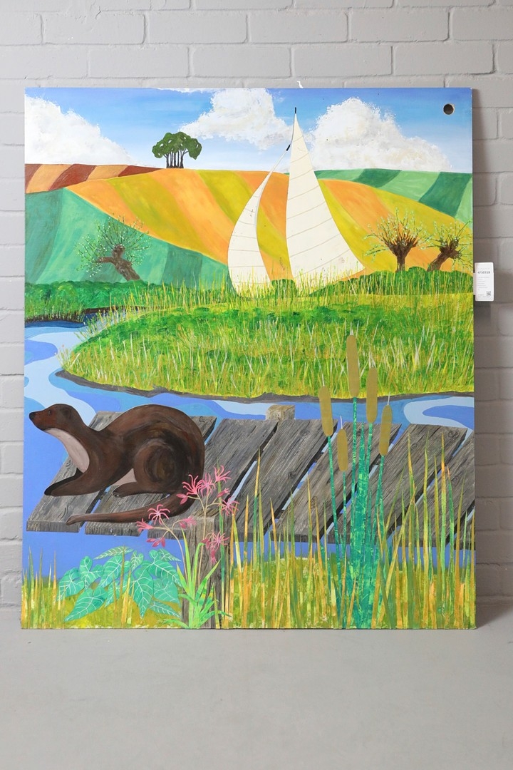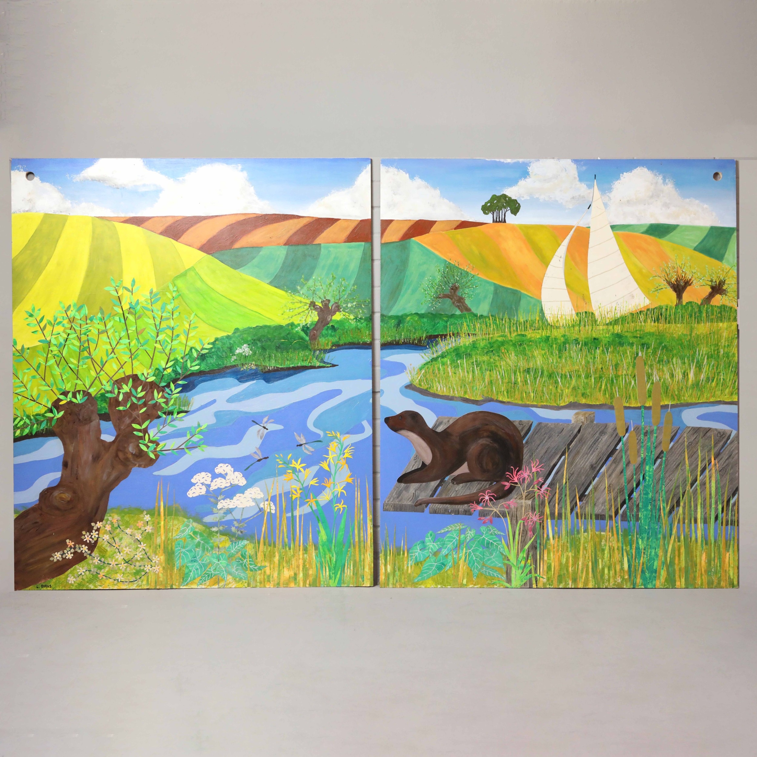 LAURA BURNS (20TH CENTURY BRITISH). NORFOLK LANDSCAPE (2). diptych, mixed media on board, each panel 102x122cm (204x244cm complete). Artist in residence at the Chelsea Flower show.
