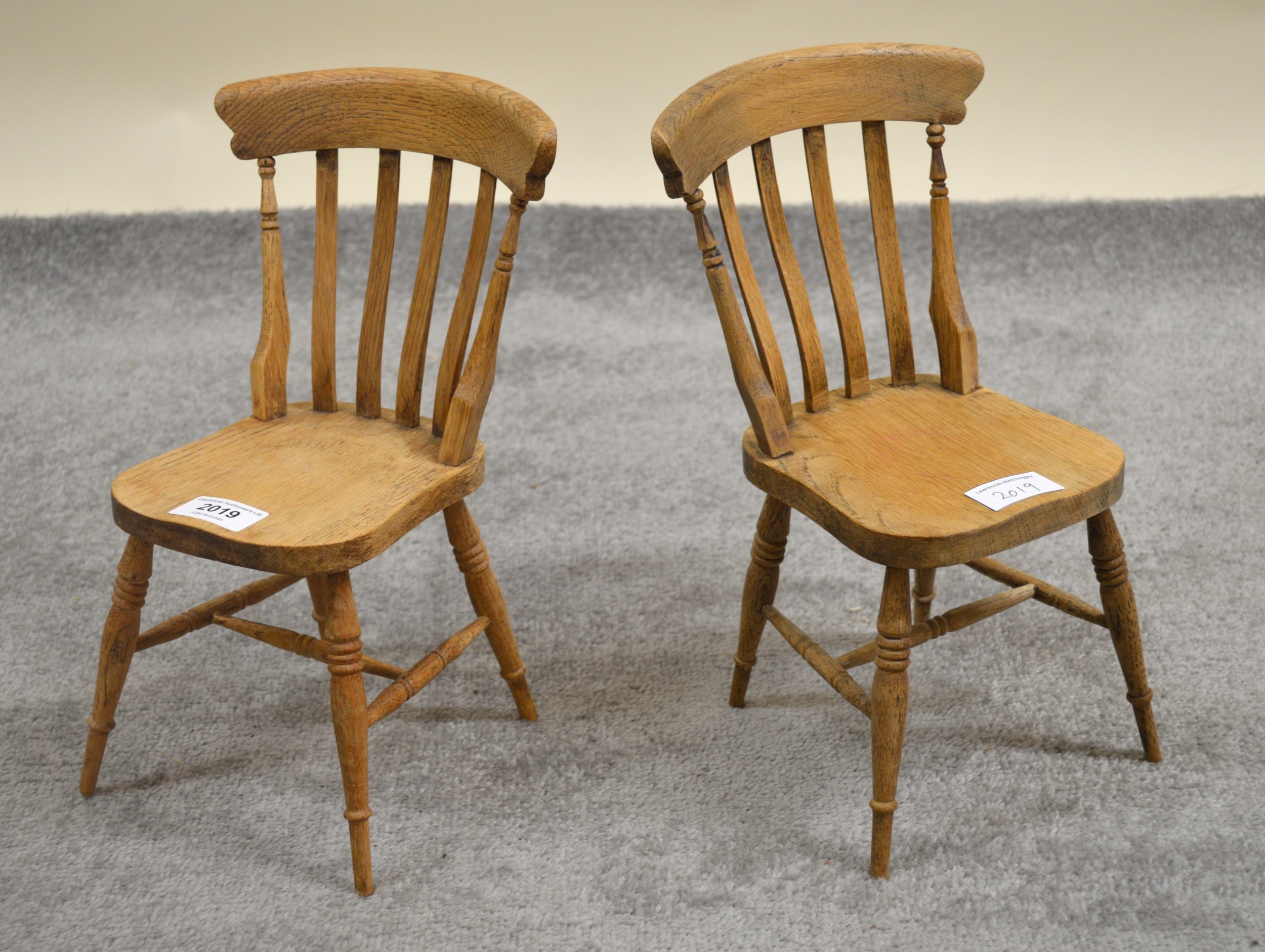 Pair of miniature oak Victorian style kitchen chairs on turned support with stretchers, 31cm high