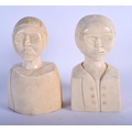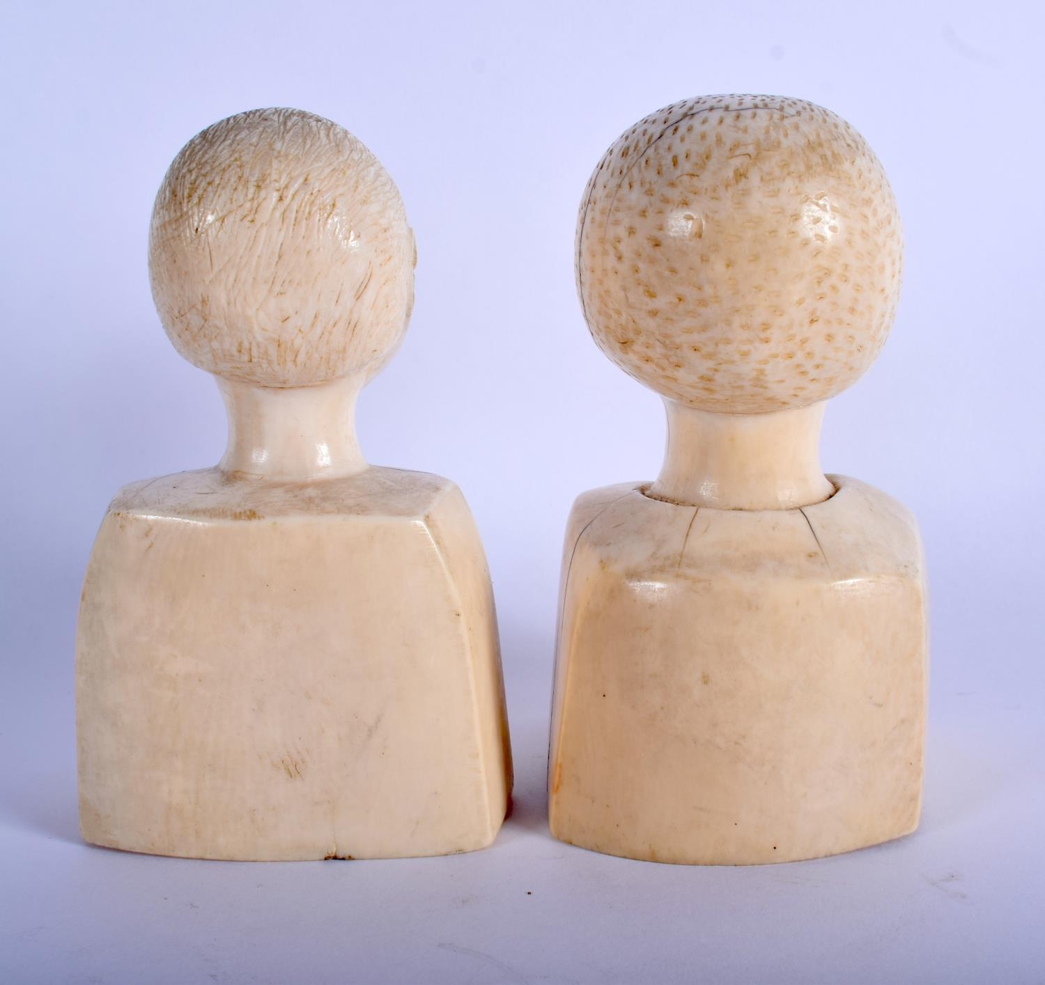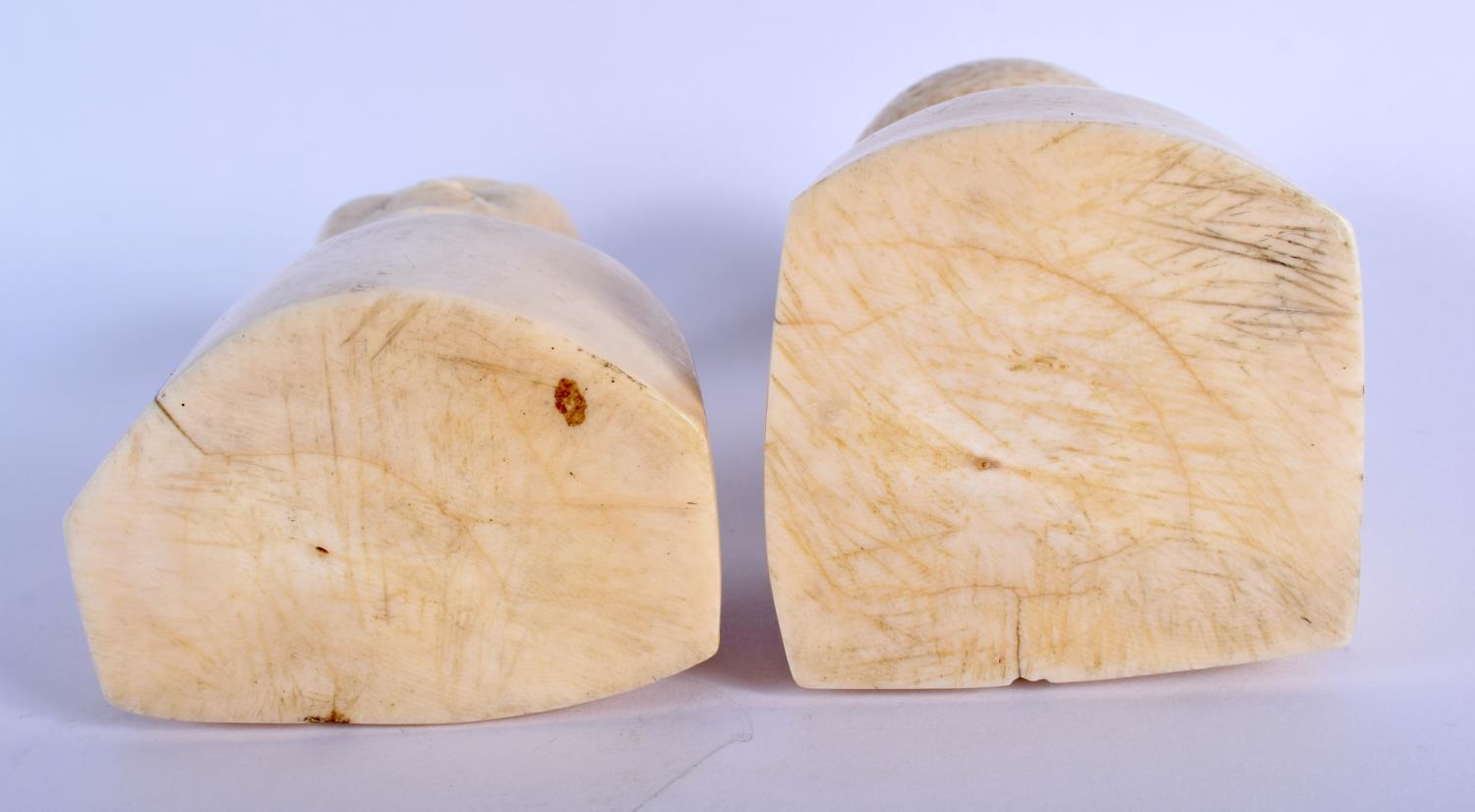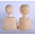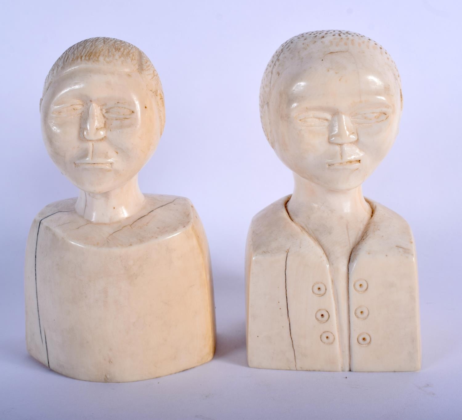 A RARE PAIR OF EARLY 20TH CENTURY AFRICAN TRIBAL COLONIAL CARVED IVORY BUSTS. 12 cm x 5 cm.