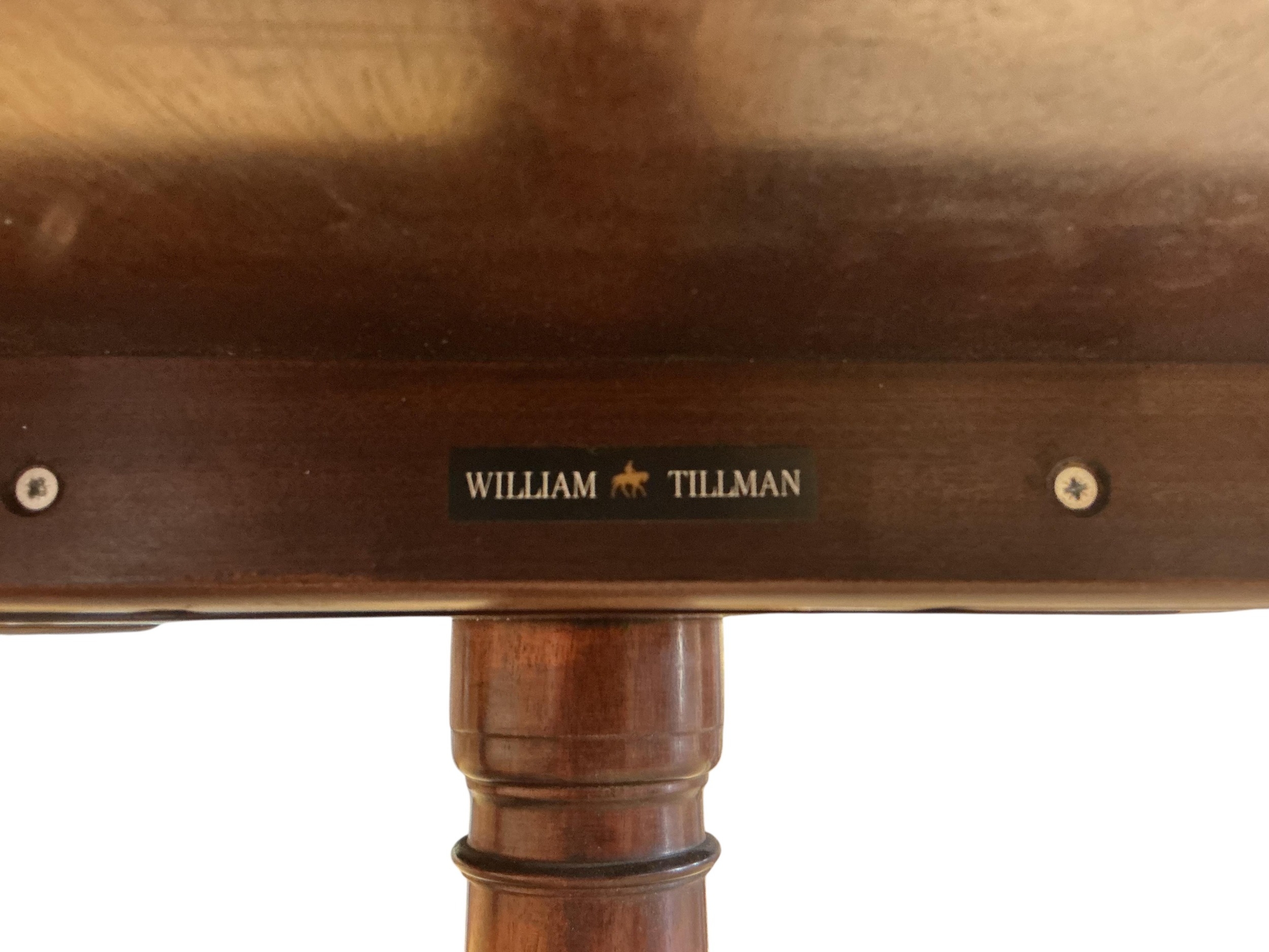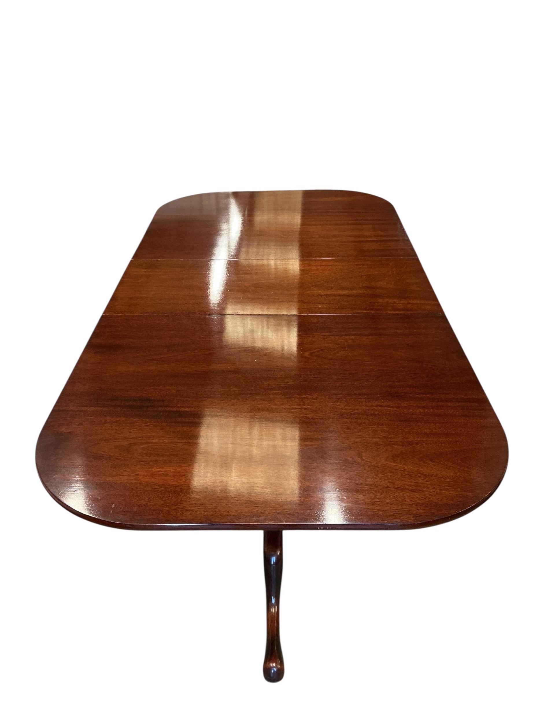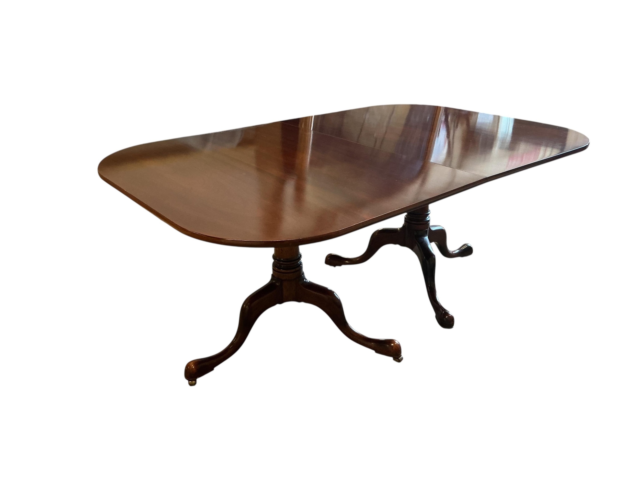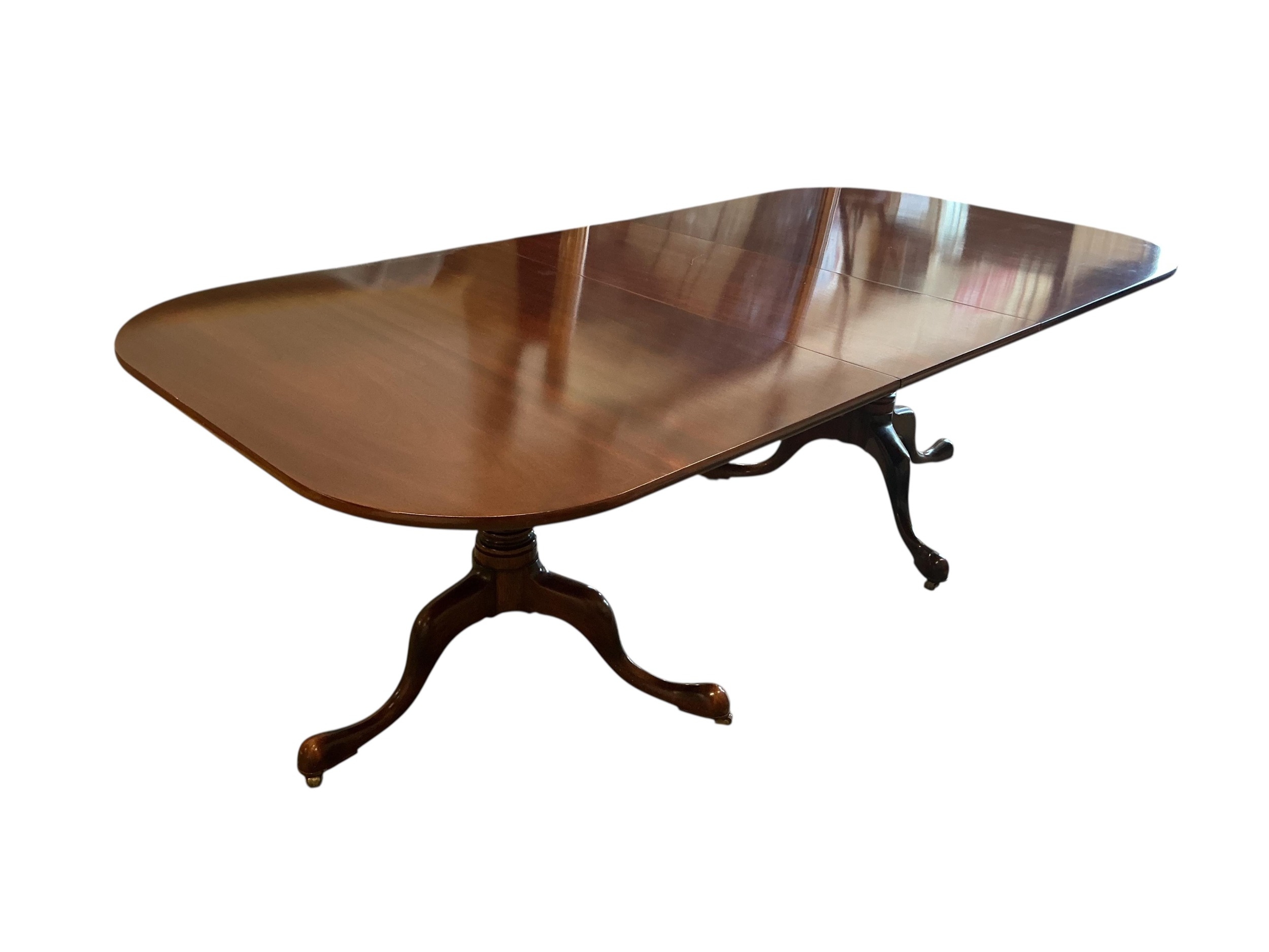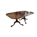 A William Tillman reproduction mahogany twin pillar extending dining table, 225cm extended, one spare leaf, depth 115cm, height 74cm